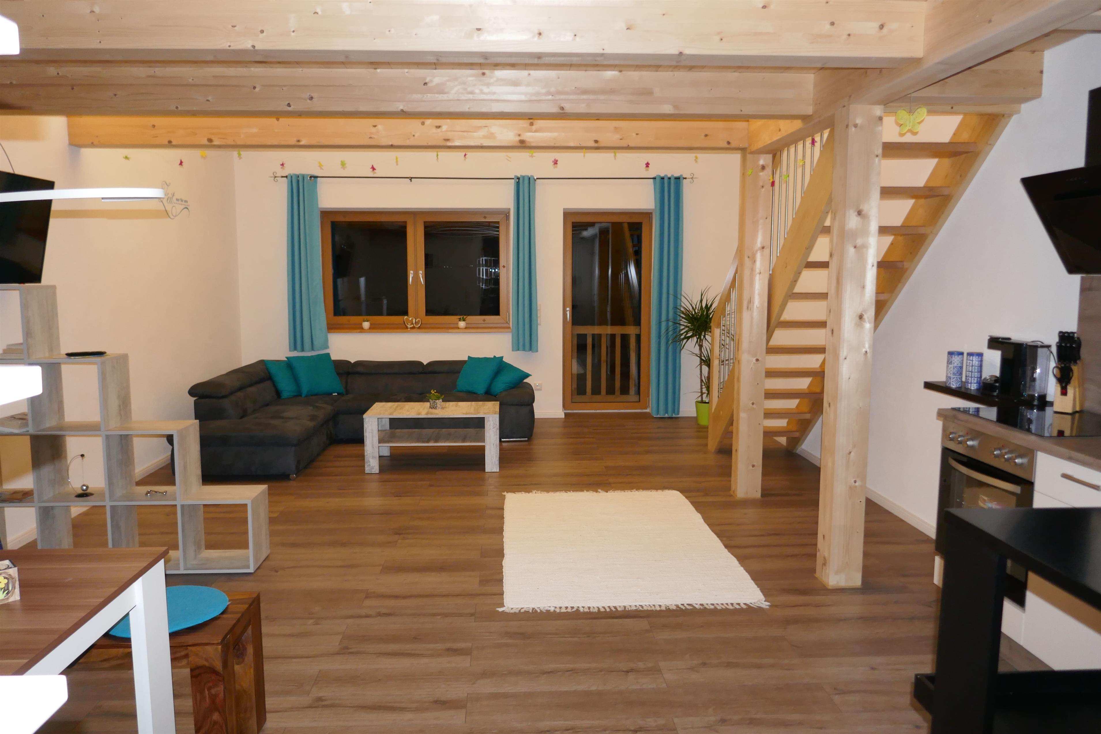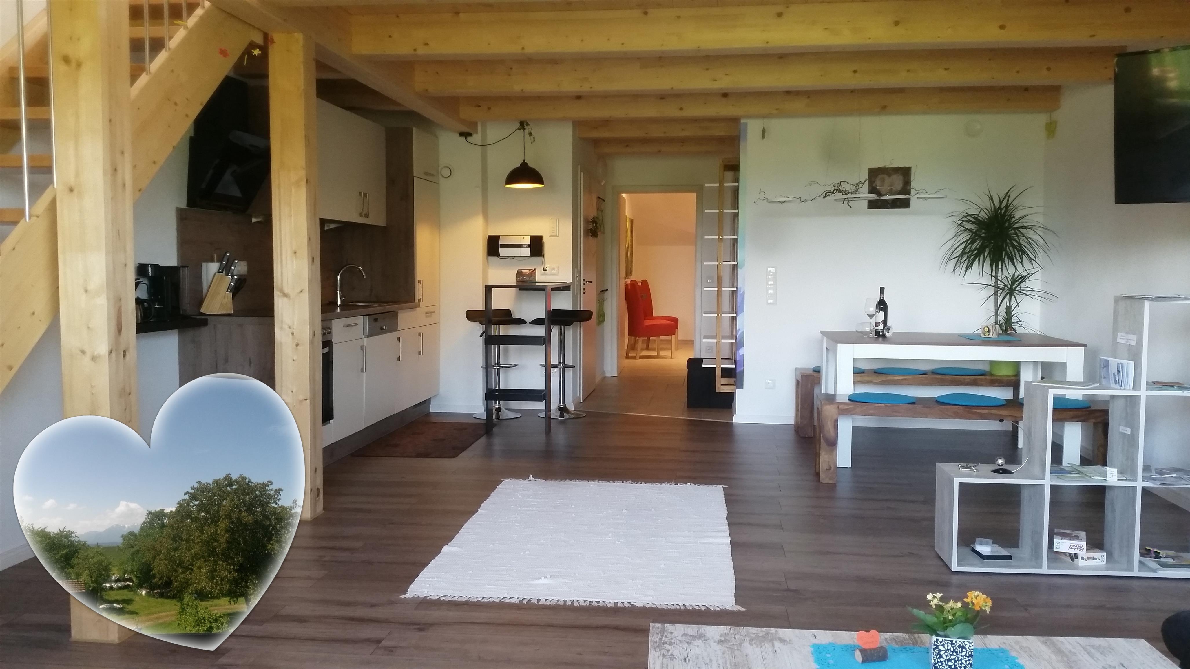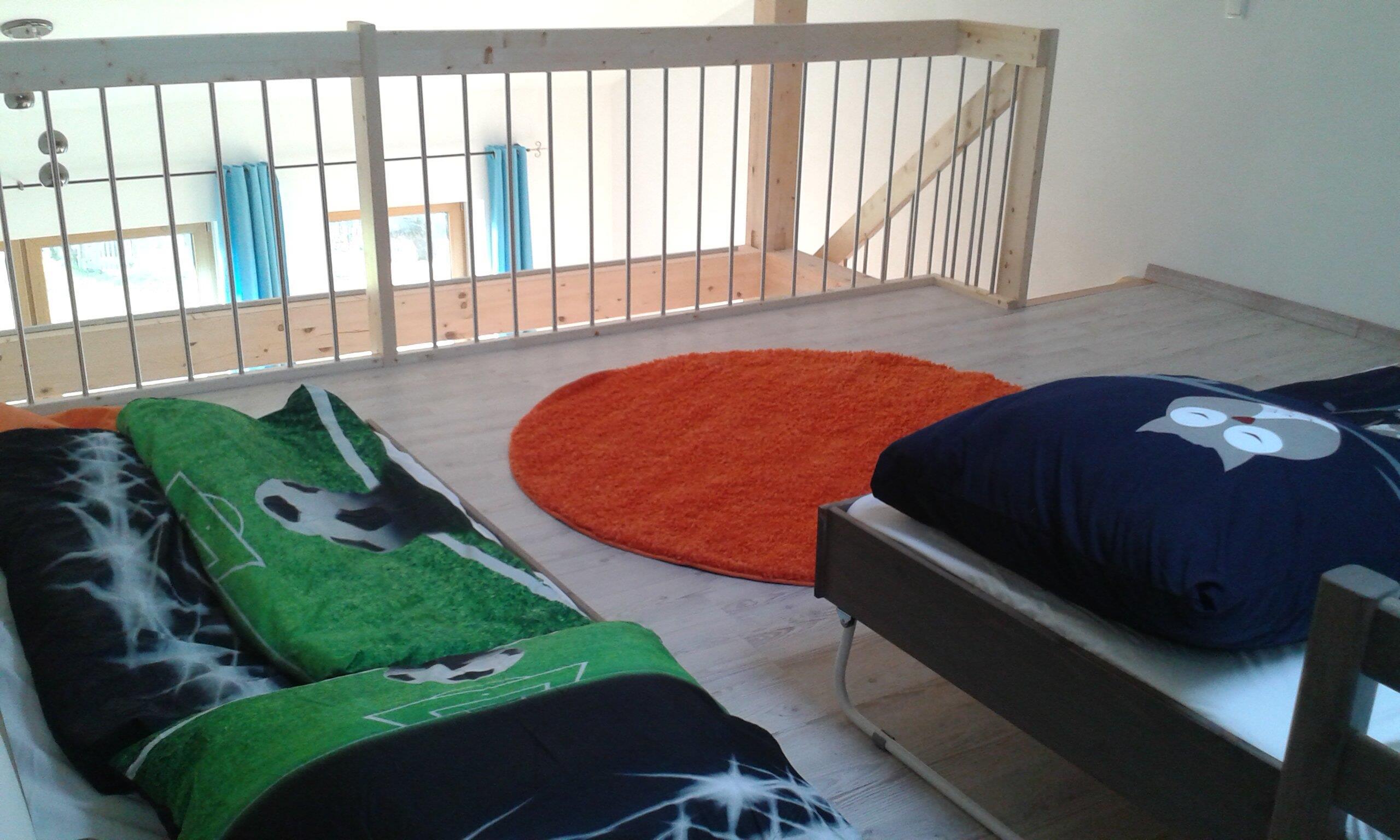 Our lovingly and modernly furnished vacation apartment ChiemseeZeit is on the second floor and offers on 90sqm space for 2 to 8 people, which also all find space on the great and new balcony. In the bedroom they sleep in the 180x200cm large double bed on high-quality cold foam mattresses. The children's room on the open gallery has 4 beds, (2 with 90x200cm + 2 with 90*190cm), in which also 4 adults can sleep. In our individually designed bathroom/WC you will find a large corner bathtub with real glass - shower wall. In the kitchen, in addition to the usual electrical appliances is a Senseo Switch coffee maker for pad and filter. You can sit either at the counter, at the large dining table with solid wood benches, quite comfortable on the large corner couch made of luxury microfiber, or - brand new - on our large larch wood - balcony. There you also have your kids playing on the lawn in view, and so you can relax and end the day with a view of the mountains and lake. We have laid high-quality laminate and tile floors, so that even the allergy sufferers among you can breathe easy. Of course, towels and bed linen, as well as LAN and WLAN are free of charge.