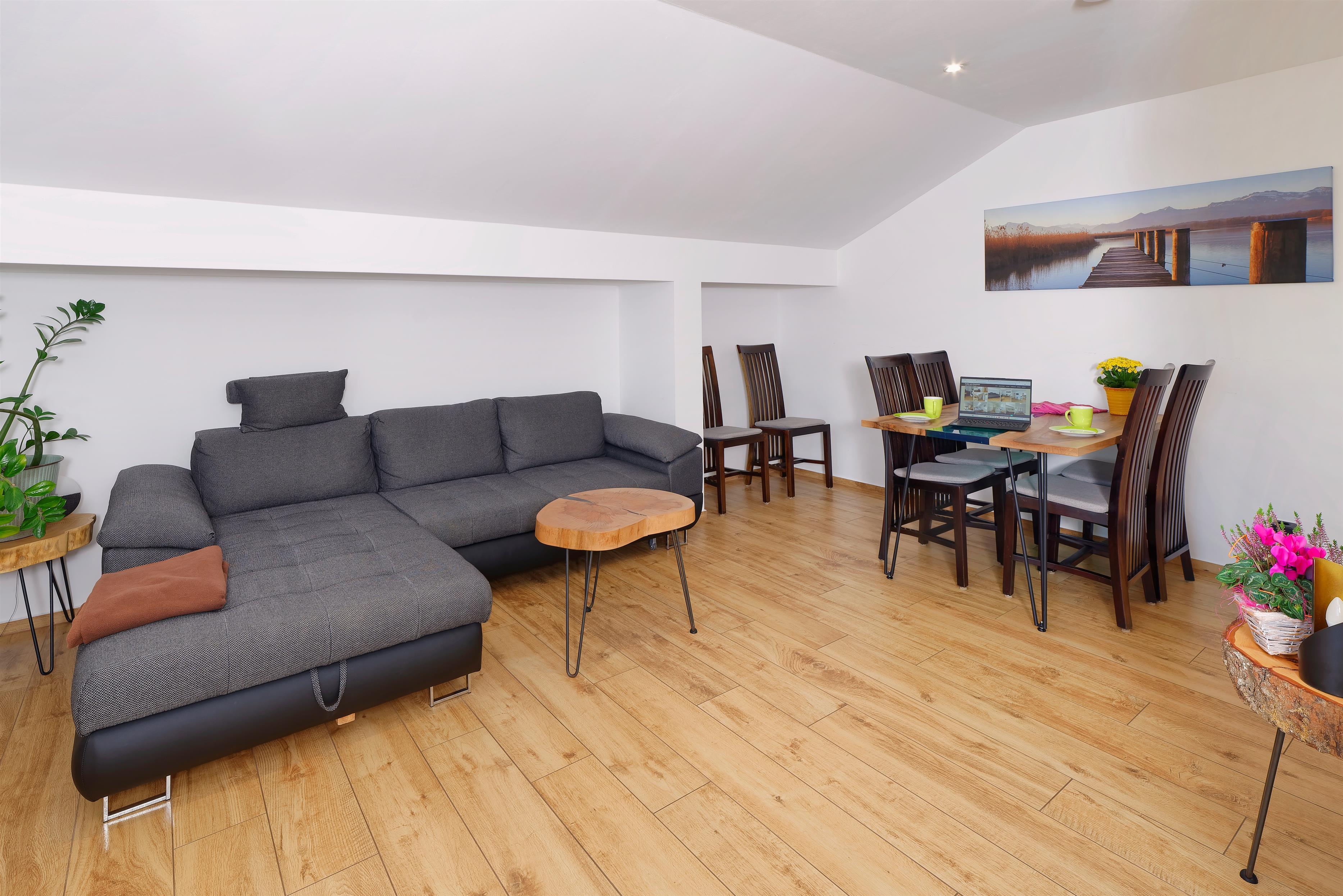 Newly renovated vacation apartment in the attic in a wonderfully quiet location on the outskirts of Gstadt. The view from the balcony to the mountains is fantastic. The picturesque Chiemsee is only a few minutes walk away.bakery, post office and shopping as well as boat and bike rental are within walking distance. The public bathing area and the boat dock are also within walking distance.The apartment has been renovated in 2020 to a high standard, new bathrooms, new fitted kitchen with appliances, fully tiled with high quality Italian tiles in wood look. The apartment has roof slopes, which gives a very cozy atmosphere. The roof was insulated in 2020 according to the latest standards and is therefore pleasantly tempered in summer and winter.We are of course happy to provide excursion recommendations, restaurant recommendations and motorcycle routes.