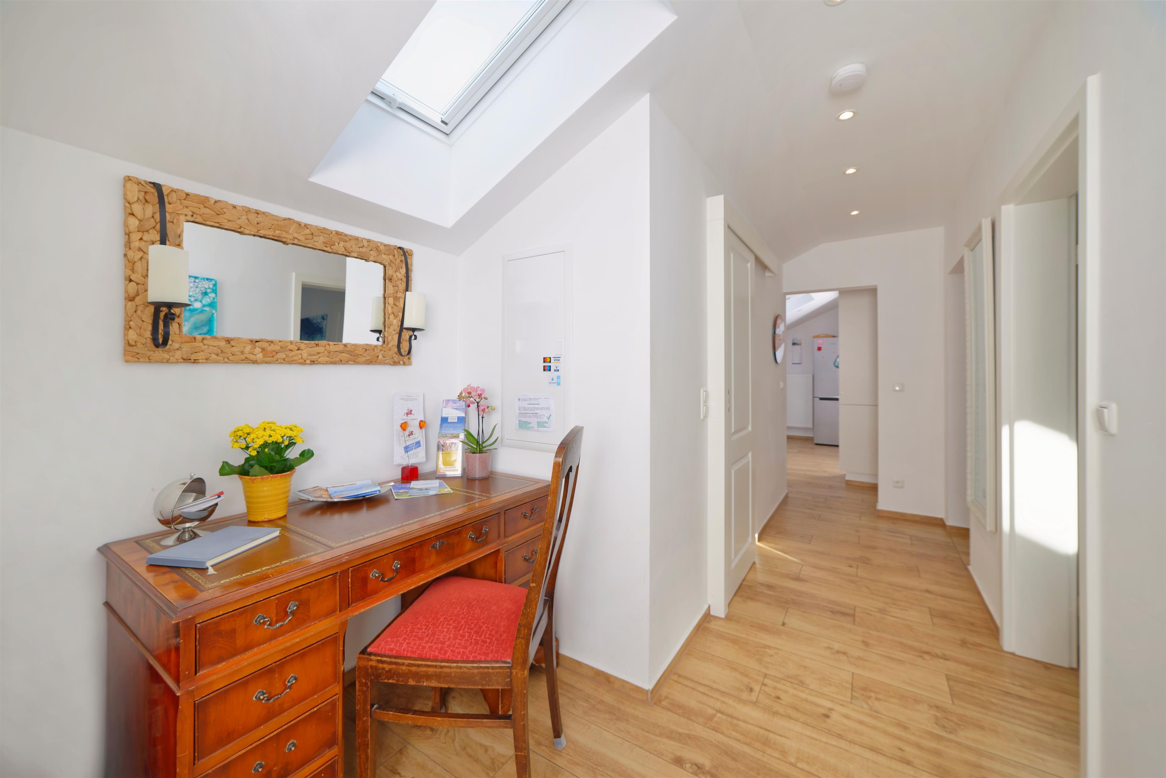 2 separate bedrooms, one double bed, two single beds and sofa bed in the living room, bed linen, ironing facilities, heating.2 bathrooms with toilet and once shower, once bathtub, baby high chair, towels and hairdryer.Living room with dining area, seating area, TV, W-LAN. Kitchen, dishwasher, ceramic stove and oven, refrigerator with separate freezer unit.Balcony with balcony furniture and additional terrace with garden furniture, barbecue allowed on the terrace by arrangement, non-smoking apartment, washing machine available, dogs allowed, parking space car / dry parking space for motorcycles / bicycles + parking space for a motorcycle trailer can be provided with pleasure.