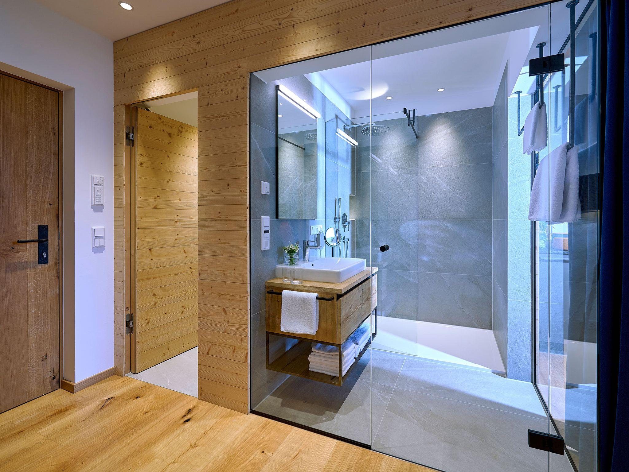• 1 Badezimmer mit begehbarer bodengleicher Regendusche, Waschtisch, Föhn, Badradio, Pflegeprodukten und Schminkspiegel