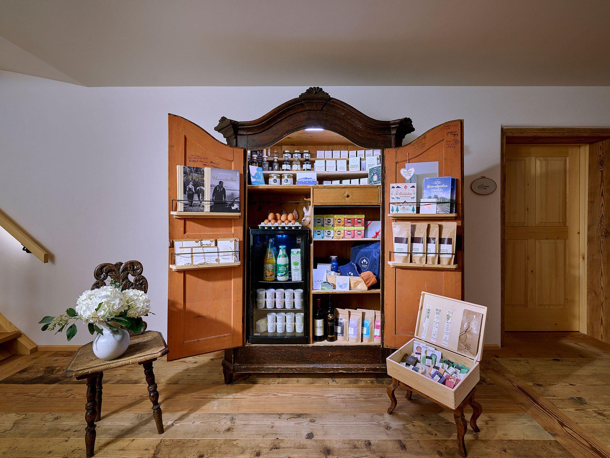 Im Haus präsentieren wir zudem einen Schmankerlschrank mit regionalen Spezialitäten, einen Getränkekühlschrank sowie einen Kaffeevollautomaten mit Frischmilch.
