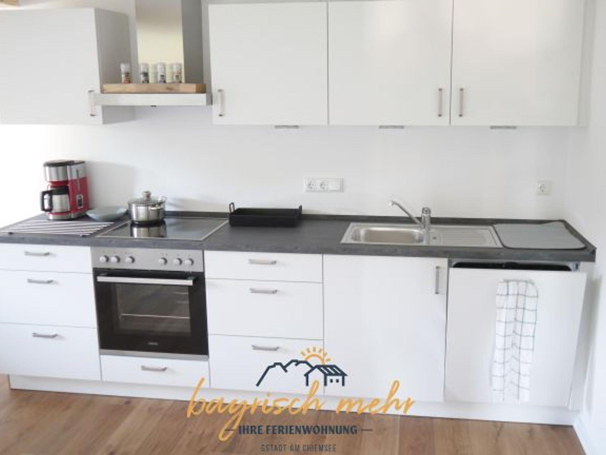Ferienwohnung - bis Ende 2019 grundsaniert! Die Ferienwohnung mit ihren geräumigen 100 m² ist in ein Wohnzimmer, Küche mit Essbereich, zwei Schlafzimmer und Badezimmer aufgeteilt. Außerdem gibt es noch zwei Balkone, von denen man zu jeder Tageszeit die Sonne genießen kann. Der großzügige Gangbereich bietet viel Stauraum und verfügt über eine Garderobe. Das Wohnzimmer ist zur Seeseite mit direktem Zugang zum Balkon gelegen. Eine Sitzgruppe mit Flachbildfernseher und die kleine Leseecke laden zum gemütlichen Verweilen ein. Die neue Einbauküche ist komplett ausgestattet. Die Essecke im Küchenbereich bietet genügend Platz für die ganze Familie. Von dort erblickt man unseren Hausberg, die Kampenwand. Bei schönem Wetter kann man sich den Kaffee auch auf dem Südbalkon schmecken lassen. Die Nächte verbringen Sie im Hauptschlafzimmer mit Boxspringbett oder im kleineren Schlafzimmer mit Zirbenbett. Ein Zustellbett für Kinder stellen wir auf Anfrage gerne bereit. Das großzügige und moderne Badezimmer verfügt über eine Badewanne und Regenwalddusche.