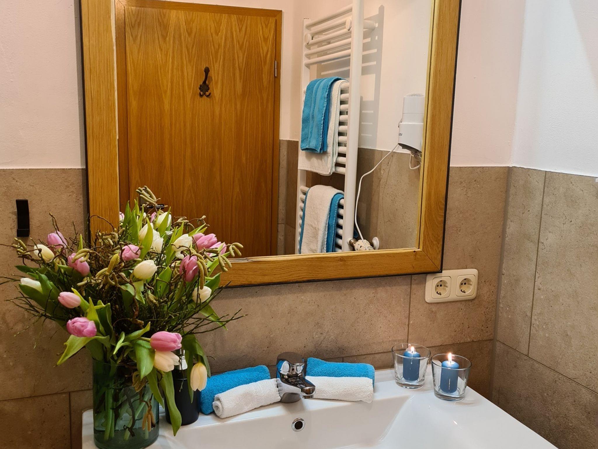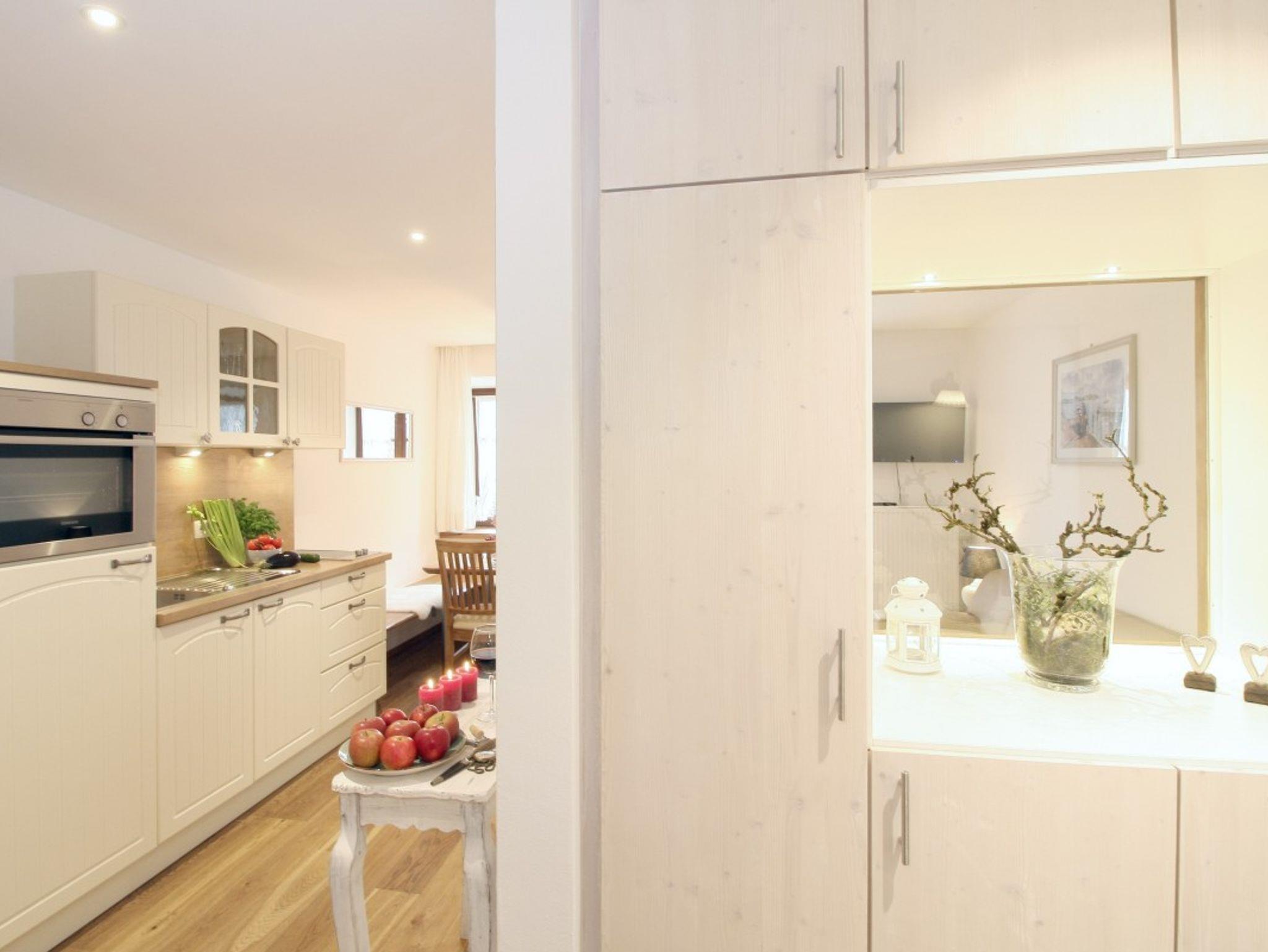 Im Bad ist ein Föhn vorhanden und der Wohnbereich verfügt über ein TV-Gerät. Die Küche ist mit Kühlschrank, Geschirrspüler und zwei Herdplatten ausgestattet – Mikrowelle und Gefriertruhe stehen im Flur.