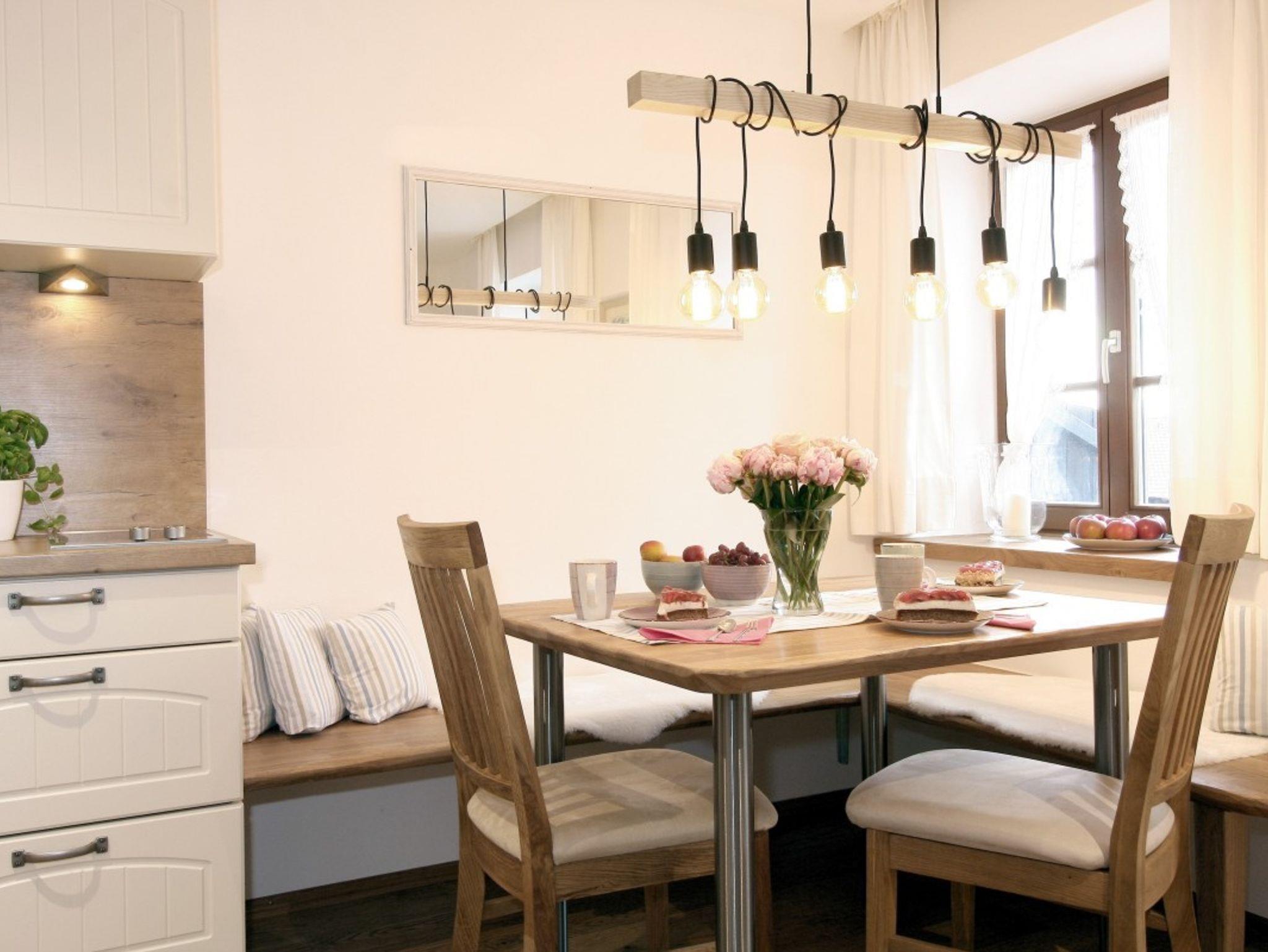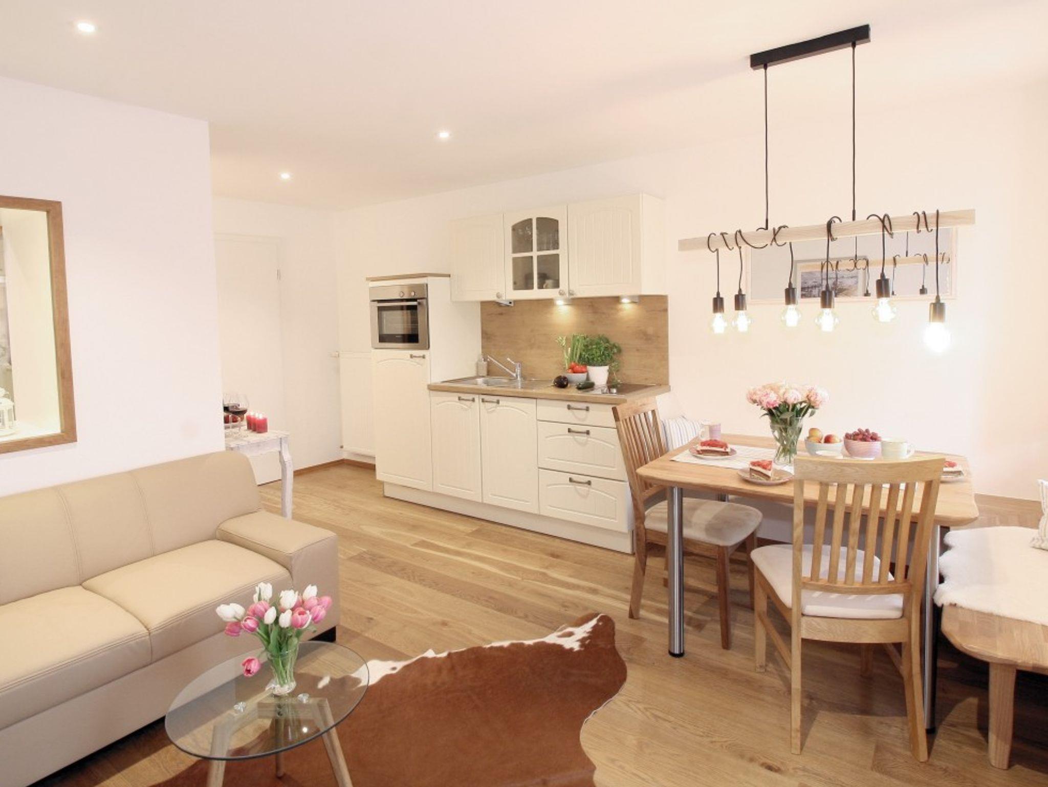 Die geräumige Ferienwohnung befindet sich im 1. OG, ist im gemütlichen Landhausstil hochwertig eingerichtet und hat einen eigenen Zugang zum Balkon mit herrlichem Blick auf Ufer, See und Berge.