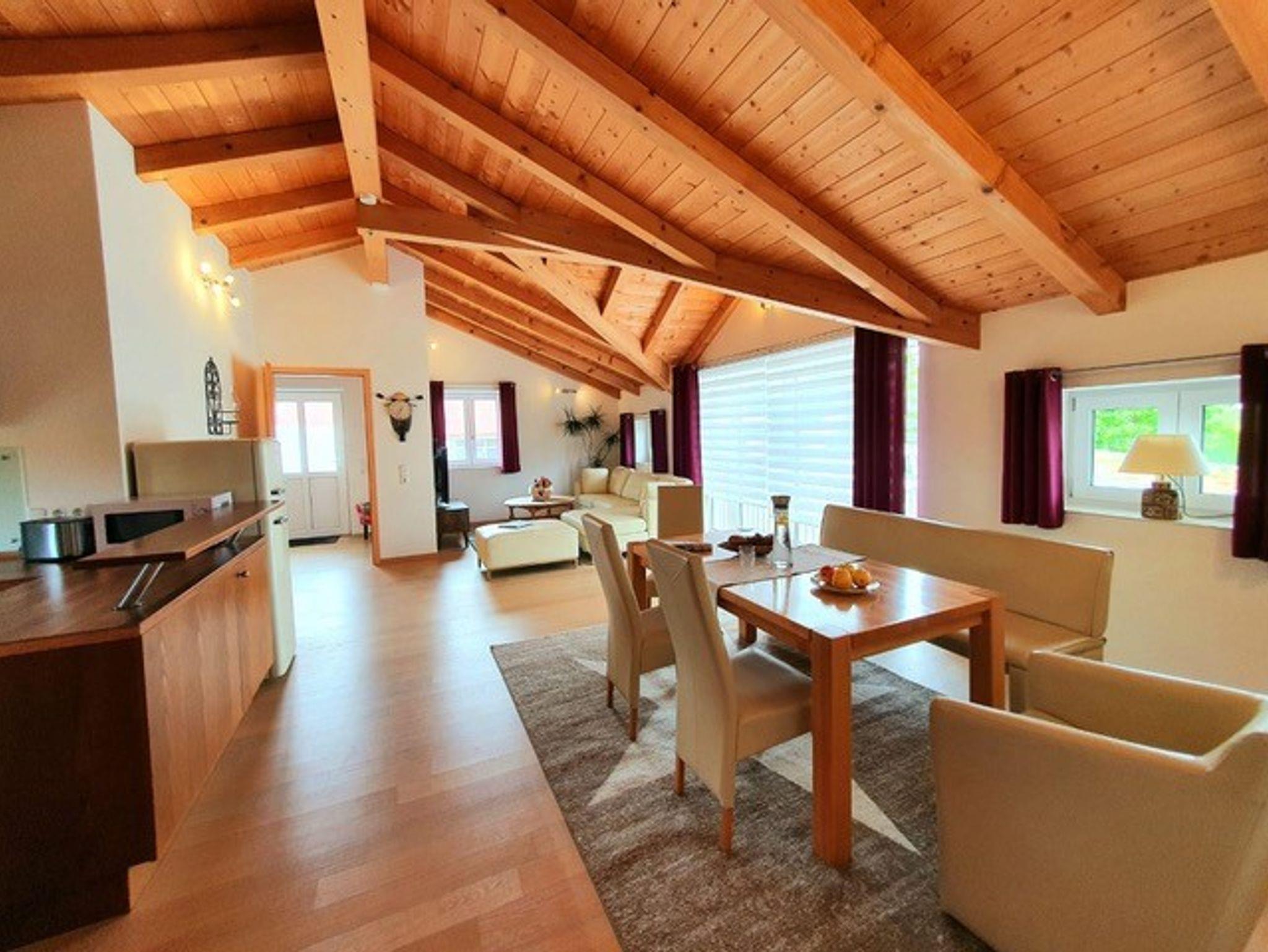 Fühlen Sie sich wohl in der gemütlichen, geräumigen FeWo mit Sichtdachstuhl im 1. OG mit separatem Eingang über eine Außentreppe in freistehendem Gebäude. Das Strandbad mit Spielplatz und Kiosk ist zu Fuß in 5 Min. erreichbar. Die Bushaltestelle und eine Bäckerei mit Einkaufsmöglichkeit sind in unmittelbarer Nähe. Besonderheiten: Terrasse mit Grill-Kamin, Carport, Abstellmöglichkeit für Anhänger, abschließbarer Abstellraum, Wäscheservice auf Anfrage möglich, Nichtraucher, keine Haustiere, Terrasse, ganzjährig buchbar.