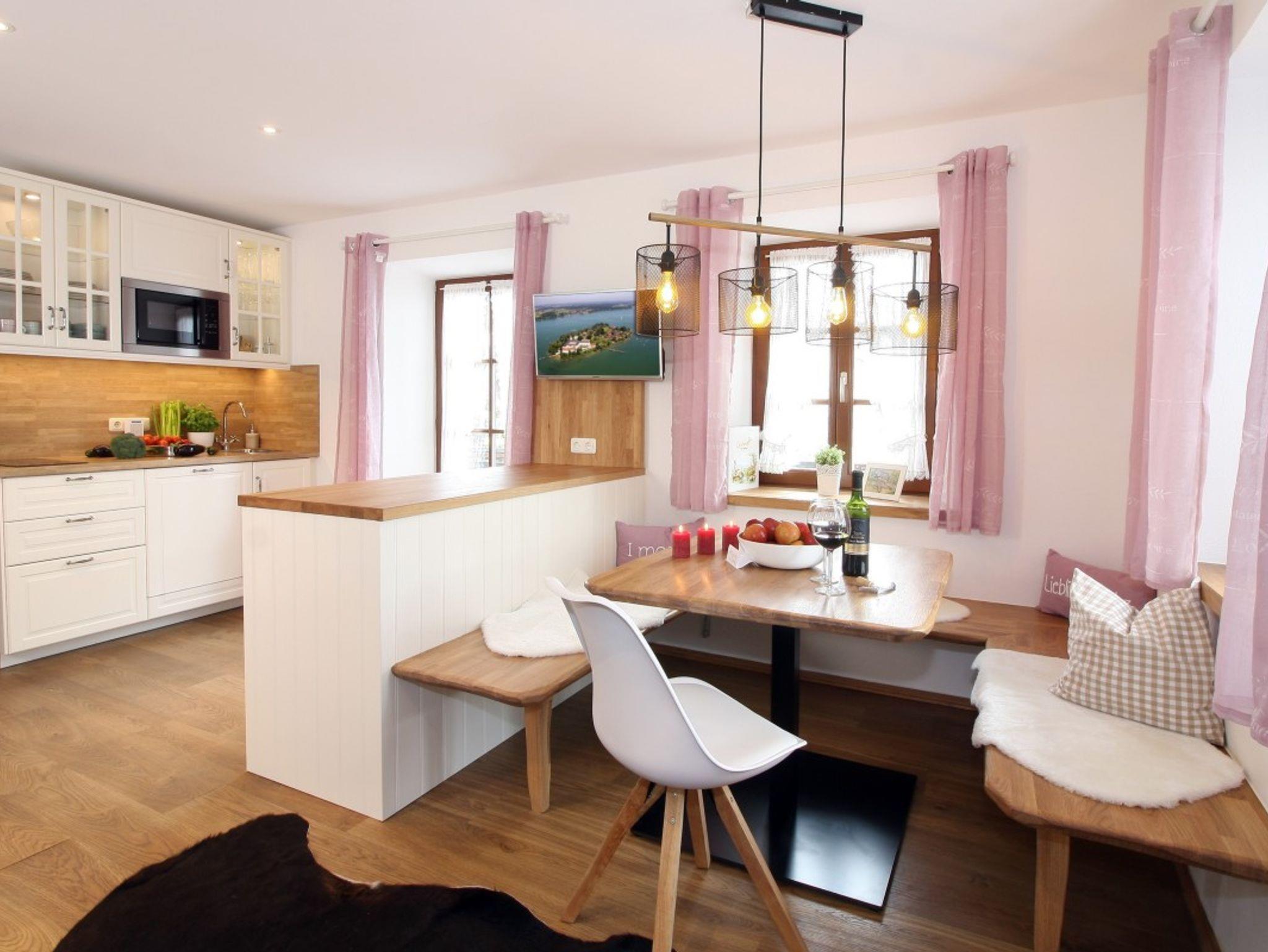 Die geräumige Ferienwohnung im 1. OG ist im gemütlichen Landhausstil hochwertig eingerichtet und hat einen eigenen Zugang zum Balkon mit herrlichem Blick auf Ufer, See und Berge.