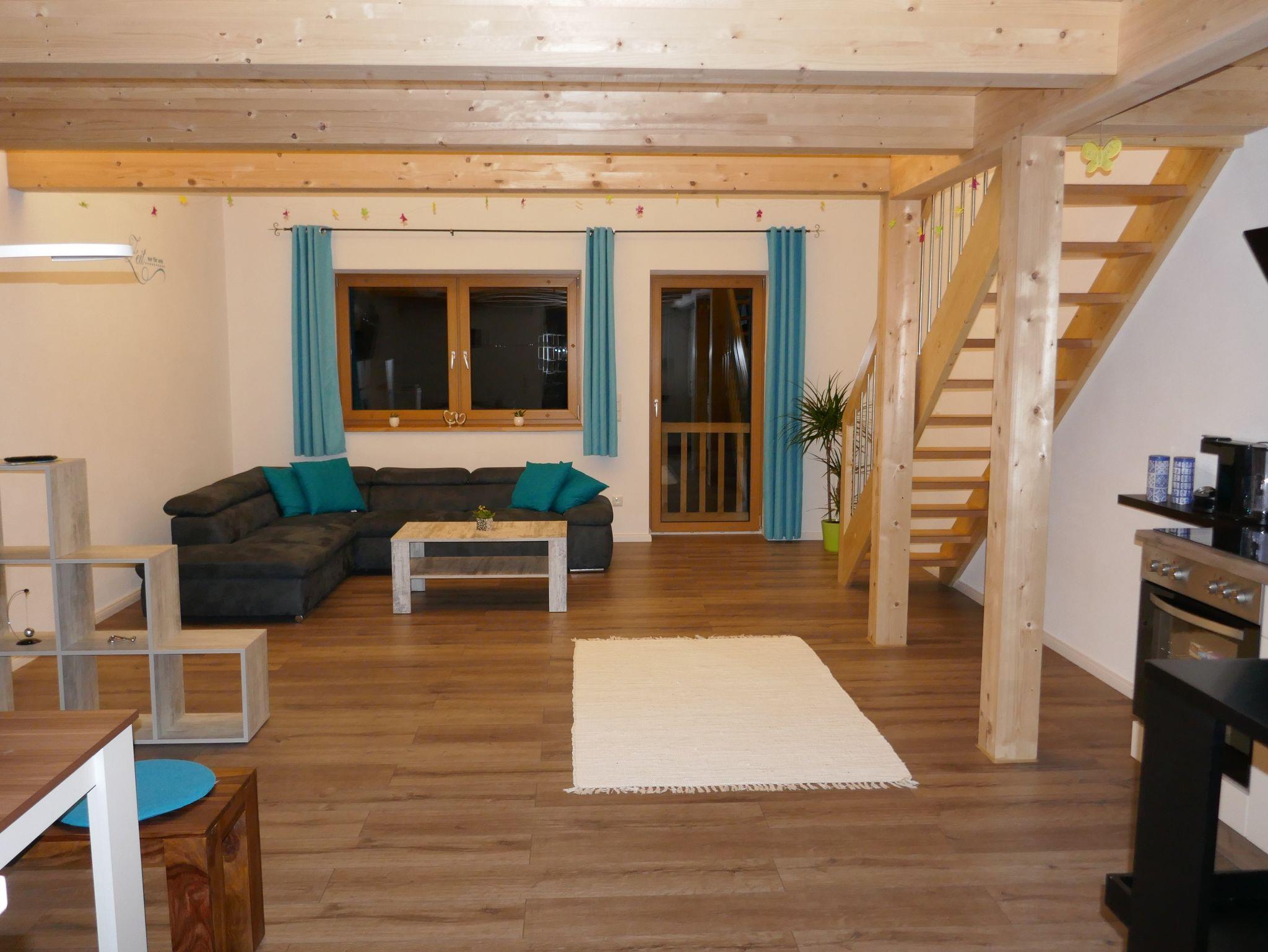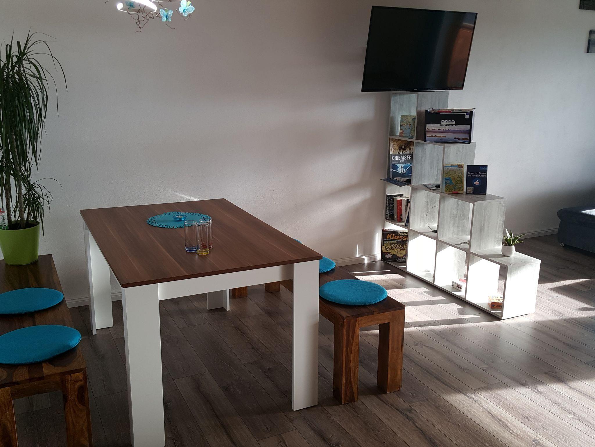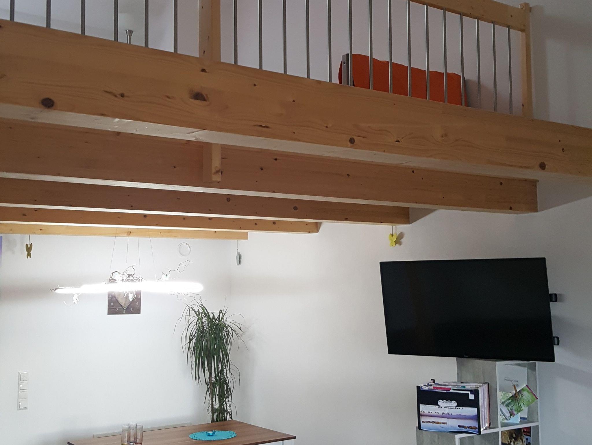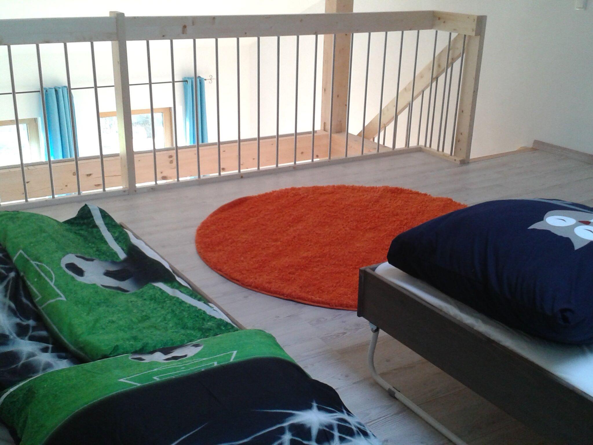 Unsere liebevoll und modern eingerichtete Ferienwohnung ChiemseeZeit ist im ersten Stock und bietet auf 90qm Platz für 2 bis 8 Personen, die auch alle auf dem geräumigen Balkon Platz finden :) Im Schlafzimmer schlafen sie im 180x200cm großem Doppelbett auf hochwertigen Kaltschaummatratzen. Das Kinderzimmer auf der offenen Galerie hat 4 Betten, (2 mit 90x200cm + 2 mit 90*190cm), in denen auch 4 Erwachsene schlafen können. In unserem individuell gestalteten Bad/WC finden Sie eine große Eckbadewanne mit Echtglas Duschwand vor. In der Küche ist neben den üblichen E-Geräten eine Senseo Switch Kaffeemaschine für Pad und Filter. Sitzen können Sie entweder an der Theke, am großen Esstisch mit Massivholzbänken, ganz gemütlich auf der großen Eckcouch aus Luxus-Microfaser, oder auf unserem großen Lärchenholz Balkon. Dort haben Sie auch Ihre Kids beim Spielen auf der Wiese im Blick, und können so ganz entspannt den Tag mit Blick auf Berge und See ausklingen lassen. Wir haben hochwertige Laminat- und Fliesenböden verlegt, so dass auch die Allergiker unter Ihnen gut durchschnaufen können. Natürlich sind Handtücher, Bettwäsche parken und WLAN kostenlos.