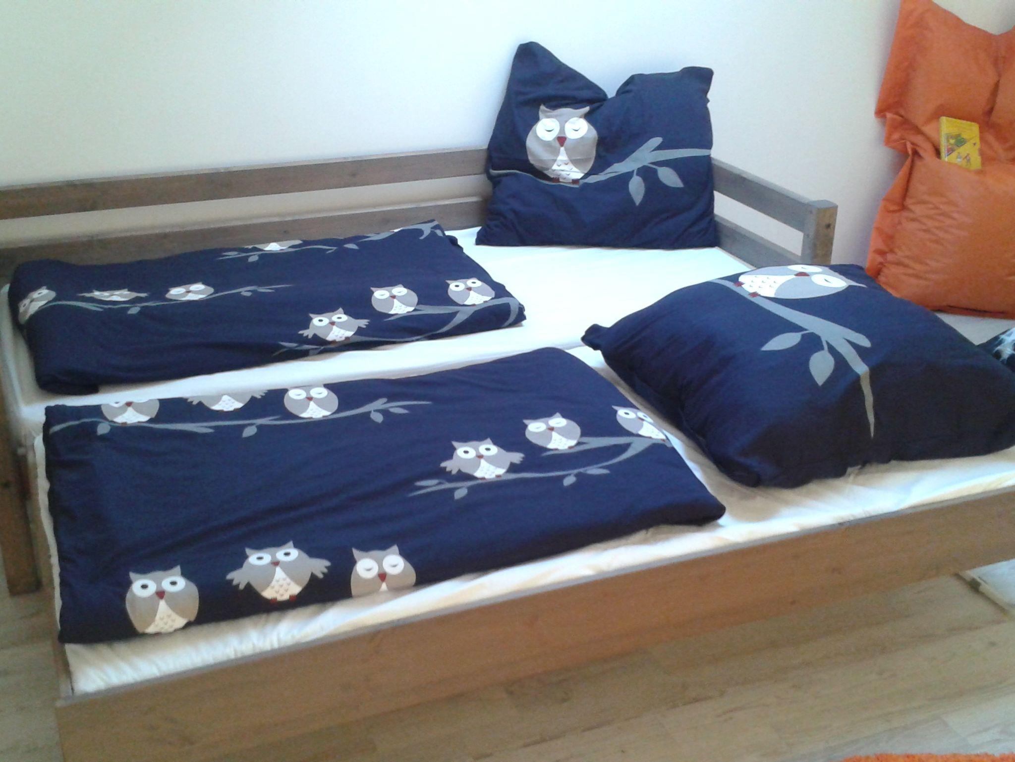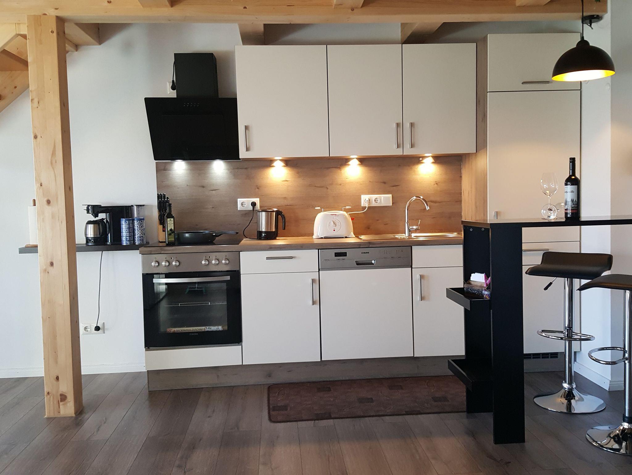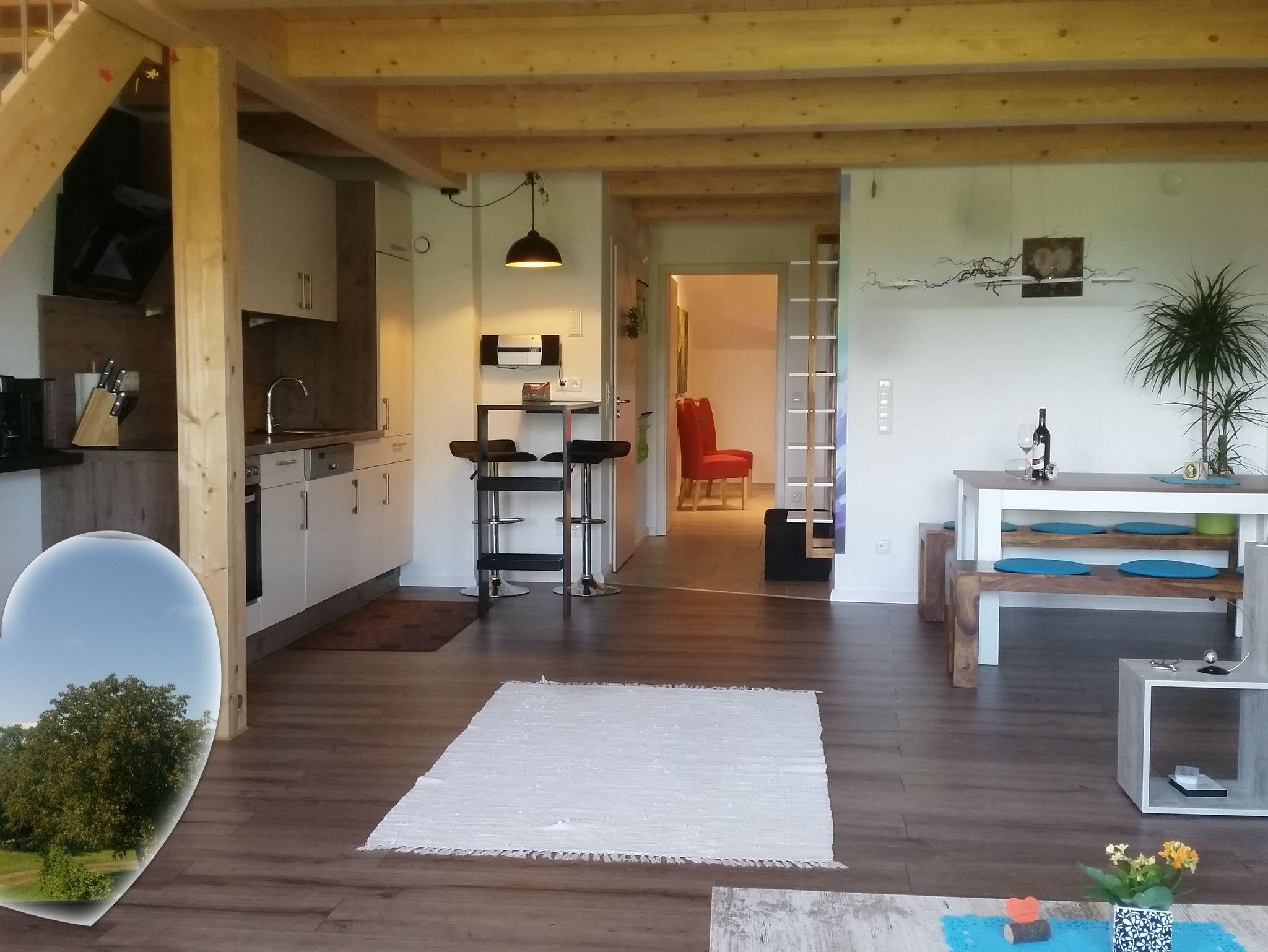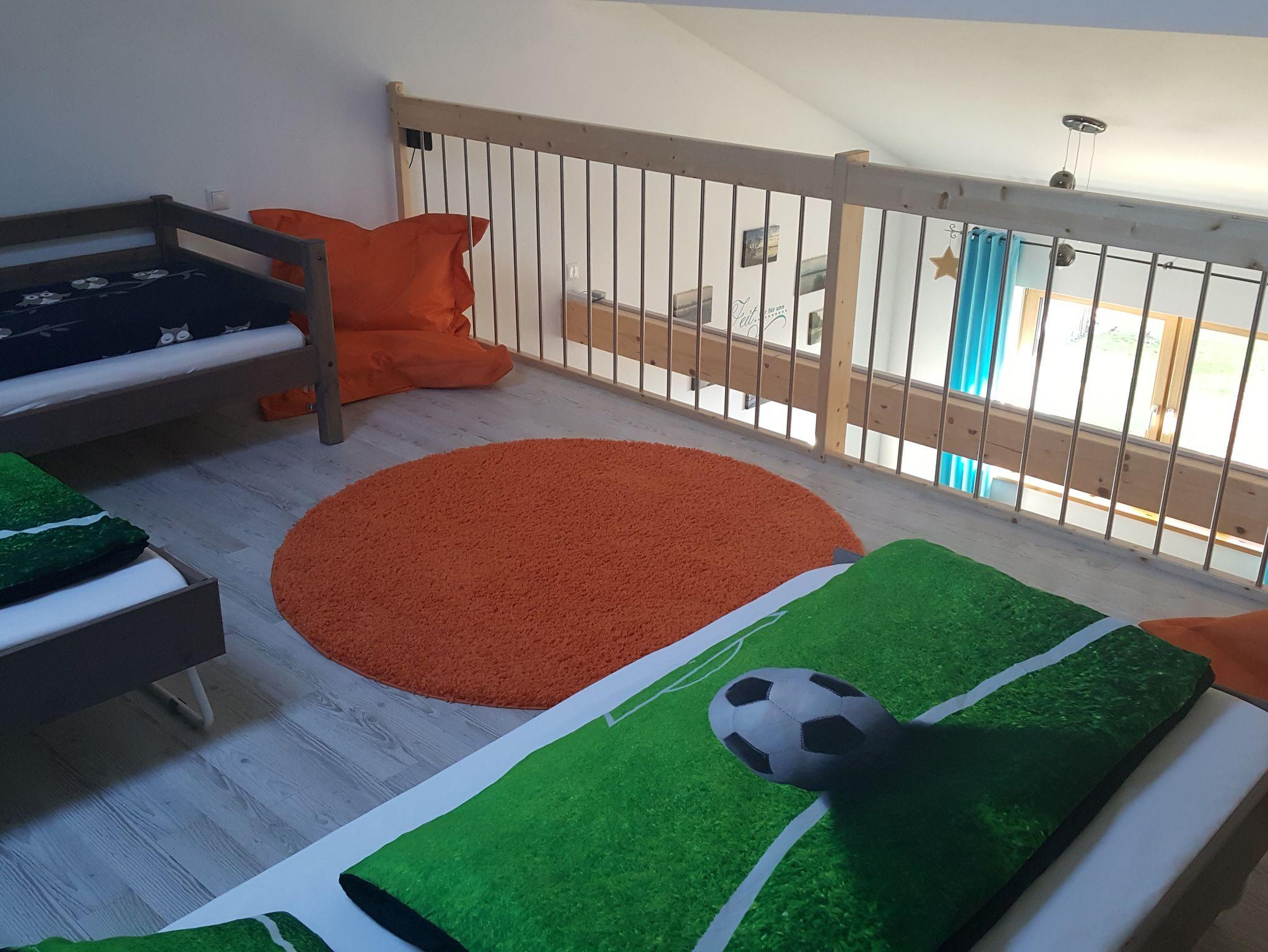 Unsere liebevoll und modern eingerichtete Ferienwohnung ChiemseeZeit ist im ersten Stock und bietet auf 90qm Platz für 2 bis 8 Personen, die auch alle auf dem geräumigen Balkon Platz finden :) Im Schlafzimmer schlafen sie im 180x200cm großem Doppelbett auf hochwertigen Kaltschaummatratzen. Das Kinderzimmer auf der offenen Galerie hat 4 Betten, (2 mit 90x200cm + 2 mit 90*190cm), in denen auch 4 Erwachsene schlafen können. In unserem individuell gestalteten Bad/WC finden Sie eine große Eckbadewanne mit Echtglas Duschwand vor. In der Küche ist neben den üblichen E-Geräten eine Senseo Switch Kaffeemaschine für Pad und Filter. Sitzen können Sie entweder an der Theke, am großen Esstisch mit Massivholzbänken, ganz gemütlich auf der großen Eckcouch aus Luxus-Microfaser, oder auf unserem großen Lärchenholz Balkon. Dort haben Sie auch Ihre Kids beim Spielen auf der Wiese im Blick, und können so ganz entspannt den Tag mit Blick auf Berge und See ausklingen lassen. Wir haben hochwertige Laminat- und Fliesenböden verlegt, so dass auch die Allergiker unter Ihnen gut durchschnaufen können. Natürlich sind Handtücher, Bettwäsche parken und WLAN kostenlos.