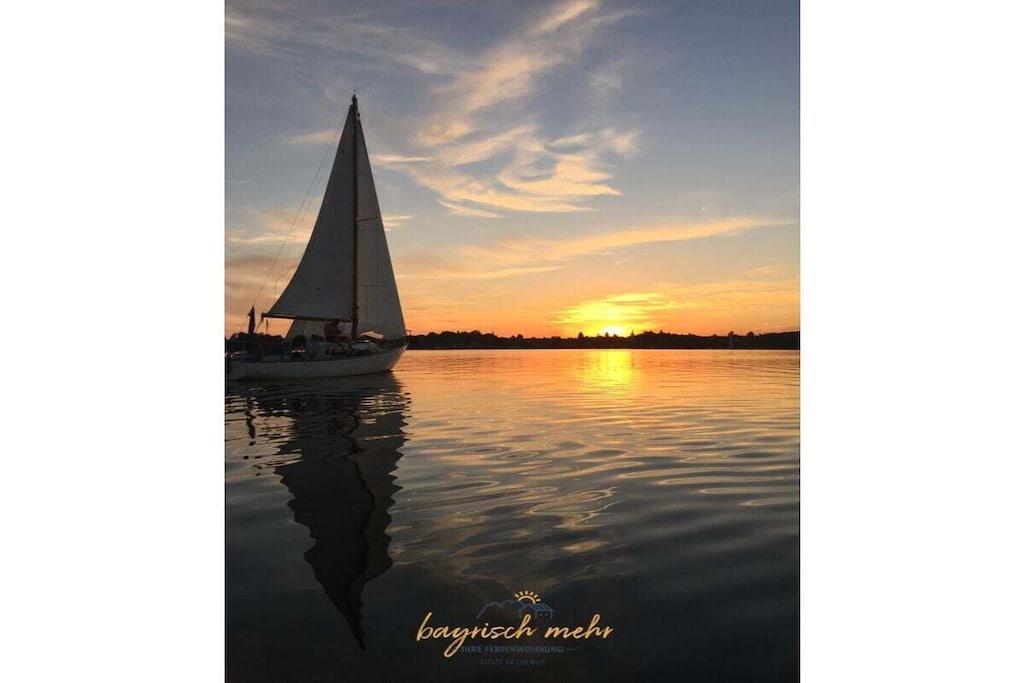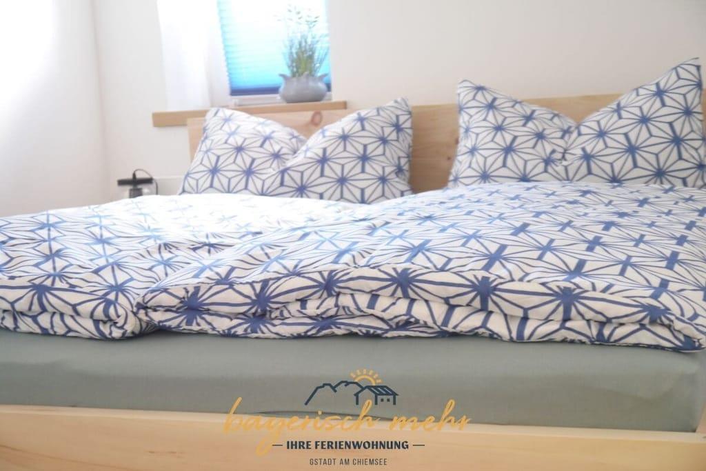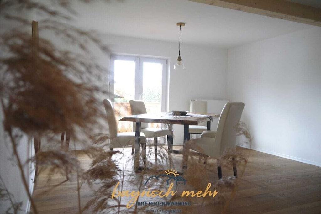 Ny ferielejlighed - fuldstændig renoveret inden udgangen af 2019! Den rummelige ferielejlighed på 100 m² er opdelt i en stue, køkken med spiseplads, to soveværelser og et badeværelse. Der er også to altaner, hvorfra I kan nyde solen når som helst på dagen. Den rummelige entré byder på masser af opbevaringsplads og en knagerække. Stuen vender ud mod søen og har direkte adgang til balkonen. Et siddeområde med fladskærms-tv og et lille læsehjørne inviterer jer til at slappe af. Det nye køkken er fuldt udstyret. Spiseområdet i køkkenområdet tilbyder plads nok til hele familien. Derfra kan I nyde udsigten over vores lokale bjerg, Kampenwand. I godt vejr kan I også nyde jeres kaffe på den sydvendte altan. I overnatter i soveværelset med en boxmadras eller i det mindre soveværelse med en seng i schweizisk fyrretræ. Vi tilbyder gerne en ekstra seng til børn efter anmodning. Det rummelige og moderne badeværelse har badekar og regnbruser.