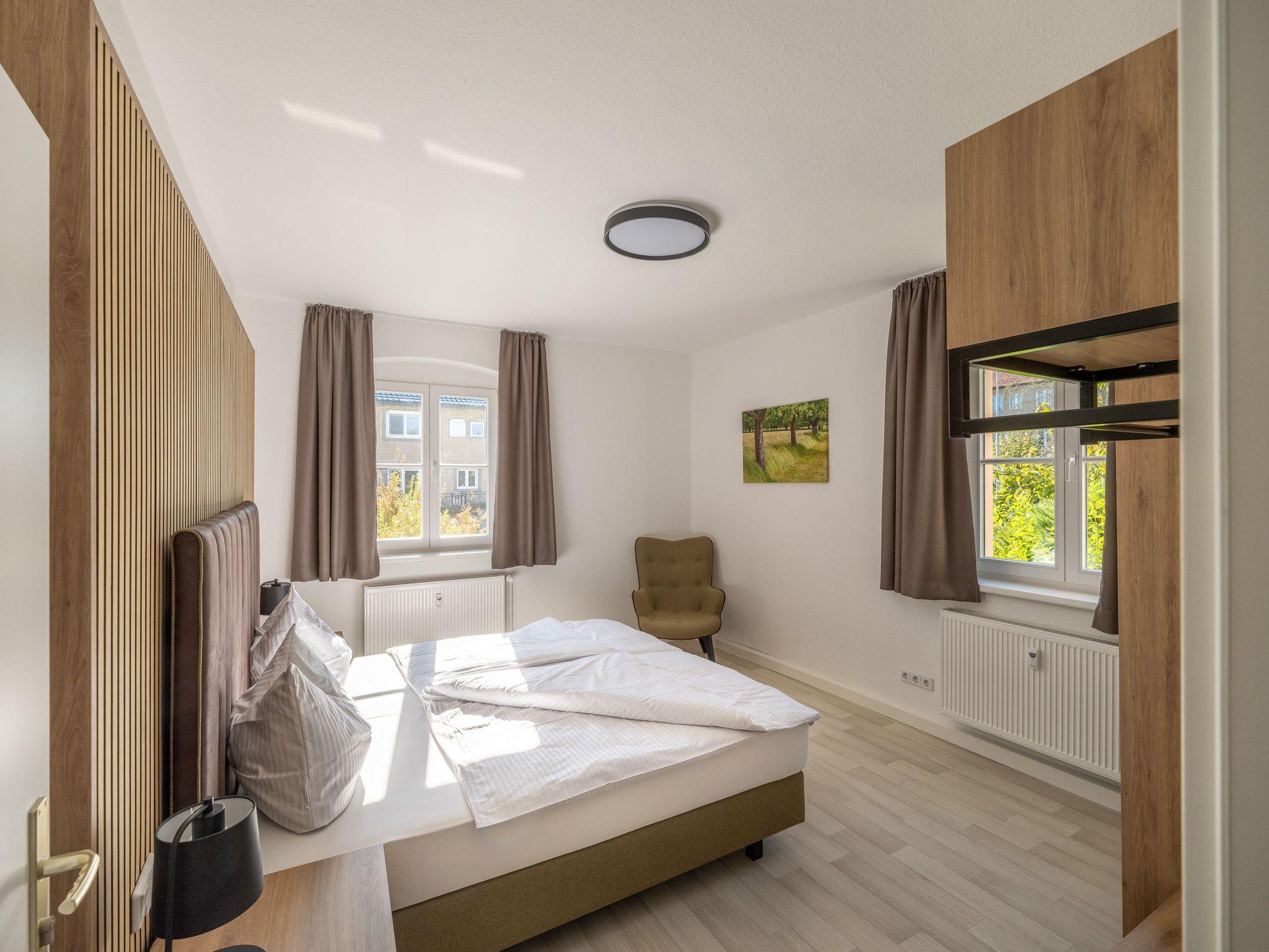 Die Gästewohnung in der Karl-Marx-Str. 42 hat 1 Wohnzimmer, 1 Schlafzimmer, 1 Kinderzimmer, 1 Küche und 1 Bad mit Dusche. Sie hat eine Wohnfläche von 60m² bietet Platz für bis zu 5 Personen, ist komplett eingerichet und verfügt über ein Doppelbett im Schlafzimmer, 1 Schlafsofa im Wohnzimmer, ein Einzelbett im 2.Schlafzimmer sowie TV und WLAN. Zudem befinden sich im Keller des Hauses eine Waschmaschine und ein Trockner. In unmittelbarer Nähe befindet sich unser hauseigenes Restaurant und Café Wilhelm