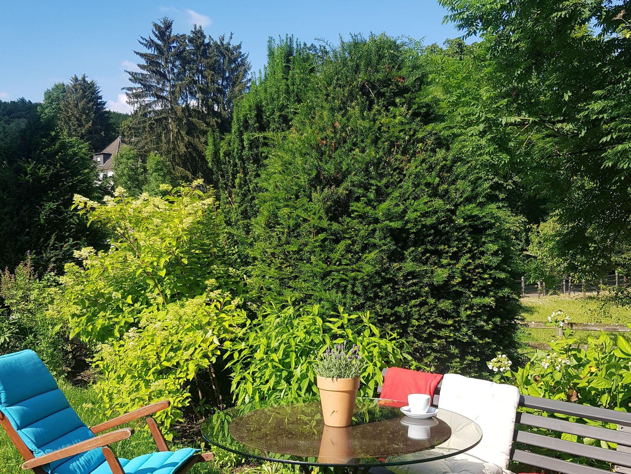 Wanderwege führen durch den Wald in die Kreisstadt mit Geschäften in der Fußgängerzone und einem Einkaufzentrum, mit Kaffees, Eisdielen, Restaurants und Brauerei. Ins Zentrum und zum Bahnhof fahren aber auch Busse, die in der Nähe des Hauses an- und abfahren (Fahrzeit mit dem Bus: ca. 10 Minuten). Zu einigen Rundwanderwegen oder Talsperren gelangen Sie ebenfalls mit dem Bus. - Schlüsselsafe bei Spätanreise.