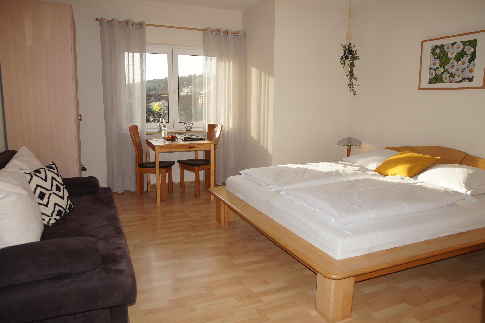 1. Etage, 24qm, Einzimmerappartement mit Doppelbett, Essplatz, Schlafcouch und Küche.