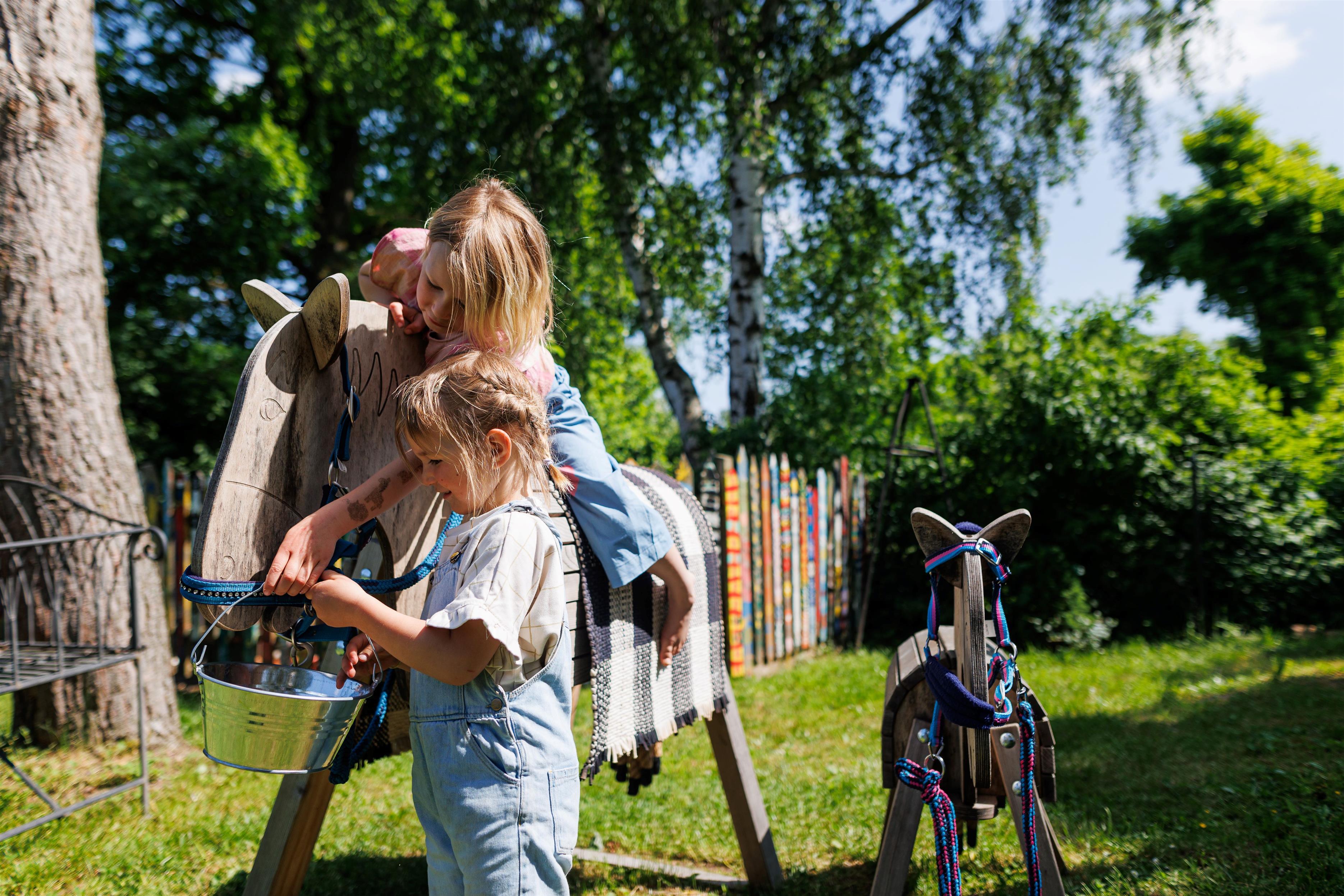 Genieße eine Tasse Kaffee unter dem Walnussbaum oder lese ein Buch in der Hollywoodschaukel. Eure Kinder gehen auf Entdeckungsreise durch den großen Garten oder probieren eines der verschiedenen Fahrzeuge aus. Sie schließen Freundschaften mit Streicheltieren, erleben Abenteuer mit anderen Kindern, kochen in der Matschküche unter dem Apfelbaum und vieles mehr. Und wenn die Sonne mal nicht scheint treffen sich alle in der Spielscheune.