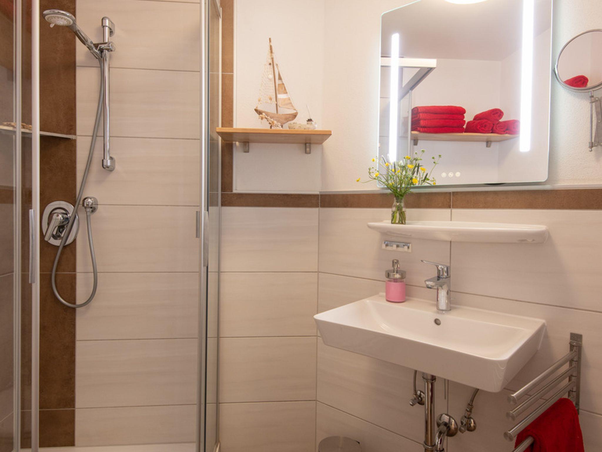 Bad mit Waschbecken, Handtuchtrockner, Föhn, Wc. und ebenerdiger Dusche. An allen Fenstern Aussenrollos und in Schlafräumen Fliegengitter.