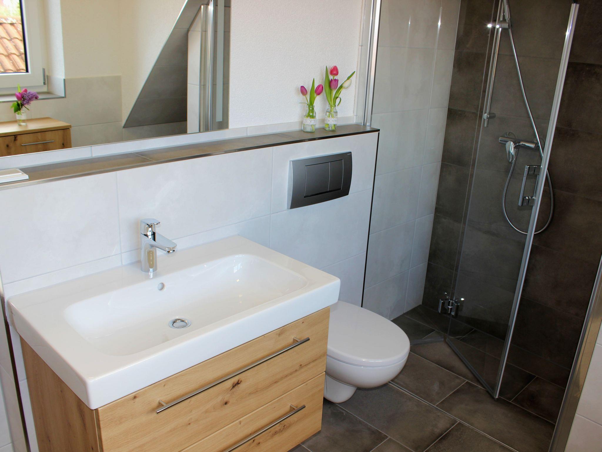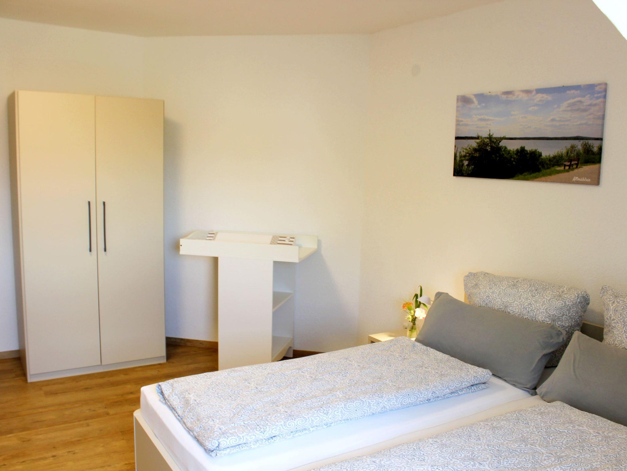 Unsere Ferienwohnung mit 75 m² Wohnfläche im ersten Stock bietet Platz für bis zu 4 Personen. Die Wohnung verfügt über ein geräumiges Kinderzimmer mit zwei Einzelbetten (200cm x 90cm). Das nebenanliegende Elternschlafzimmer besitzt ein großes Doppelbett (200cm x 180cm). Ein Beistellbett, eine Wickelkommode, ein Hochstuhl und eine Trittstufe sind vorhanden. Das geräumige Wohnzimmer mit Essbereich ist mit einem Satelliten-TV, einer Couch, zwei Sitzsäcken und großem Esstisch ausgestattet. Die Balkone sind vom Wohnzimmer und Kinderzimmer aus zugänglich und bieten einen Sonnenschirm und eine Sitzgelegenheit mit Tisch. Die komplett ausgestattete Küche lässt mit einem Herd, Backofen, Kühlschrank mit Gefrierfach, Spülmaschine, Kaffeemaschine, Espressokocher, Mikrowelle, Stabmixer, Toaster und Wasserkocher keine Wünsche offen. Im Bad befinden sich eine geräumige ebenerdige Dusche und ein großer beleuchteter Spiegel. Zudem ist ein Föhn vorhanden. Im Übernachtungspreis sind Endreinigung, Nebenkosten, PKW-Stellplatz, die gesetzlich gültige Mehrwertsteuer, Bettwäsche, Hand-, Spül- und Geschirrtücher sowie Toilettenpapier enthalten. Küchentücher, Spülmittel und ein Staubsauger stehen bereit.