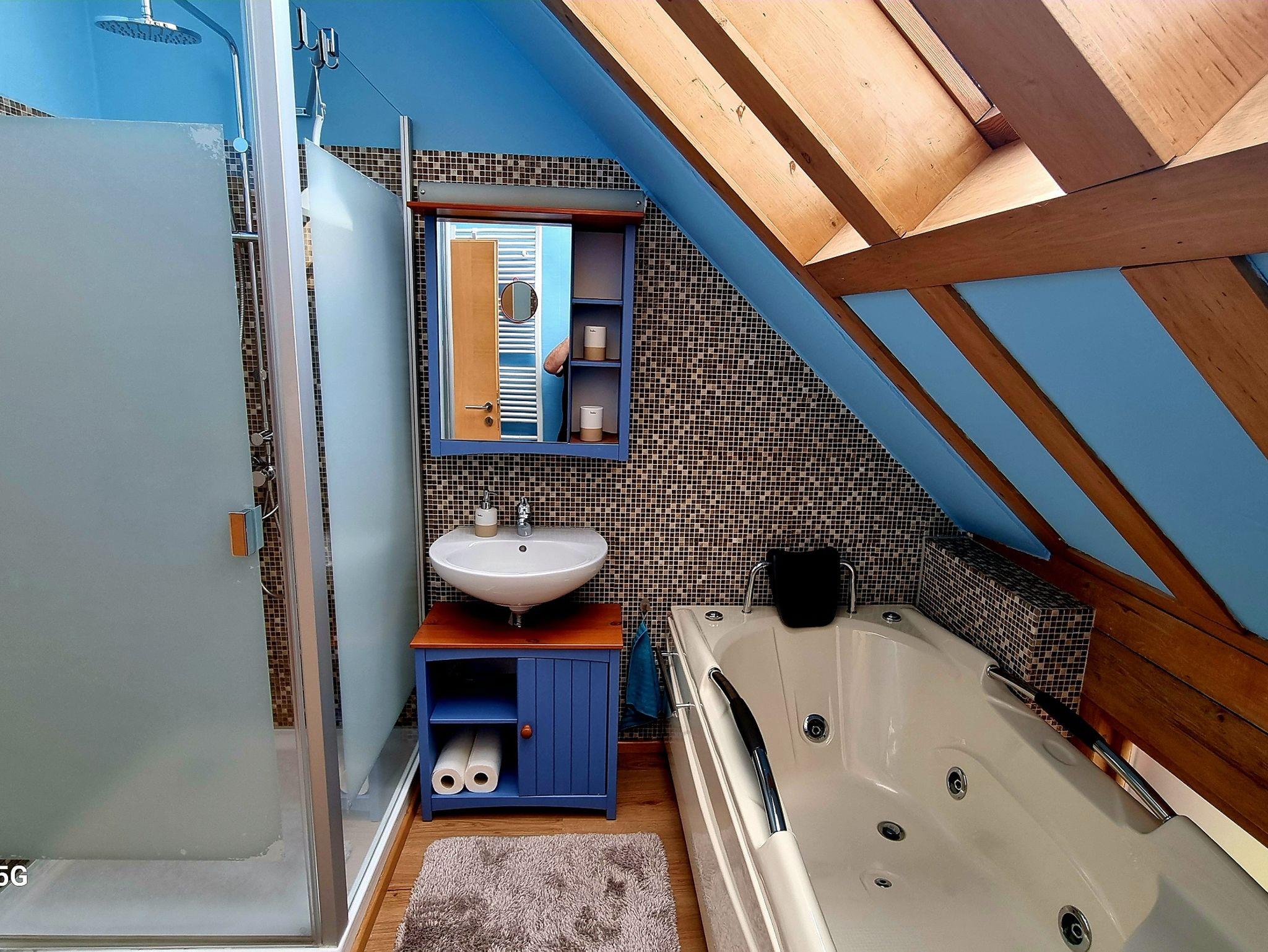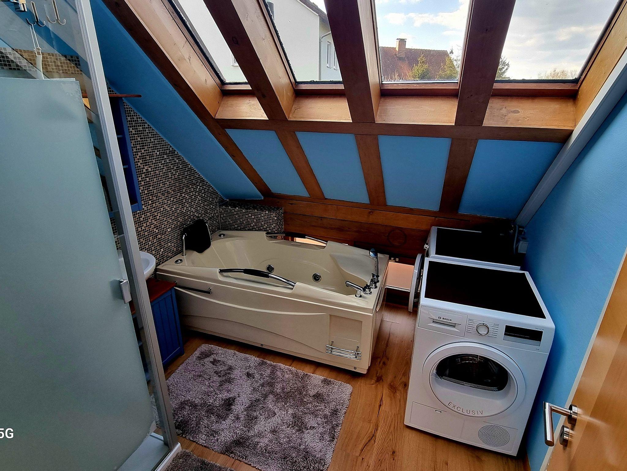 Es erwartet Sie eine traumhafte und komfortable, sehr modern ausgestattete Loftwohnung mit nicht einsehbarem Süd-Balkon. Die Ferienwohnung liegt im 1. Obergeschoss, hat eine Größe von 85 m² und wird über eine separate Außentreppe erreicht. Dieser außergewöhnliche Wohnflair entsteht durch den großartigen Blick in den freien Himmel. Erleben Sie eine Auszeit, bei der Sie Ihre Ruhe und Kreativität entfalten können. Unsere Ferienwohnung verfügt über ein separates Schlafzimmer mit einem Boxspringbett (180x200) sowie Sat-TV. Zusätzlich gibt es ein kleines Schlafzimmer mit 2 Einzelbetten (90x200). Dieses Zimmer ist über eine Innentreppe erreichbar. Der offene Kochbereich umfasst einen Essplatz und eine Küchenzeile. Sie ist mit Backofen, Kühlschrank, Gefrierschrank, Geschirrspüler, Kaffeemaschine, Mikrowelle und Toaster voll ausgestattet. Im Wohnbereich erwartet Sie eine gemütliche Couch sowie ein TV. Das großzügige Tageslichtbad verfügt über Waschbecken, WC, Dusche und Badewanne mit Whirlpool-Funktion sowie Waschmaschine und Trockner. Zudem gibt es ein separates WC.