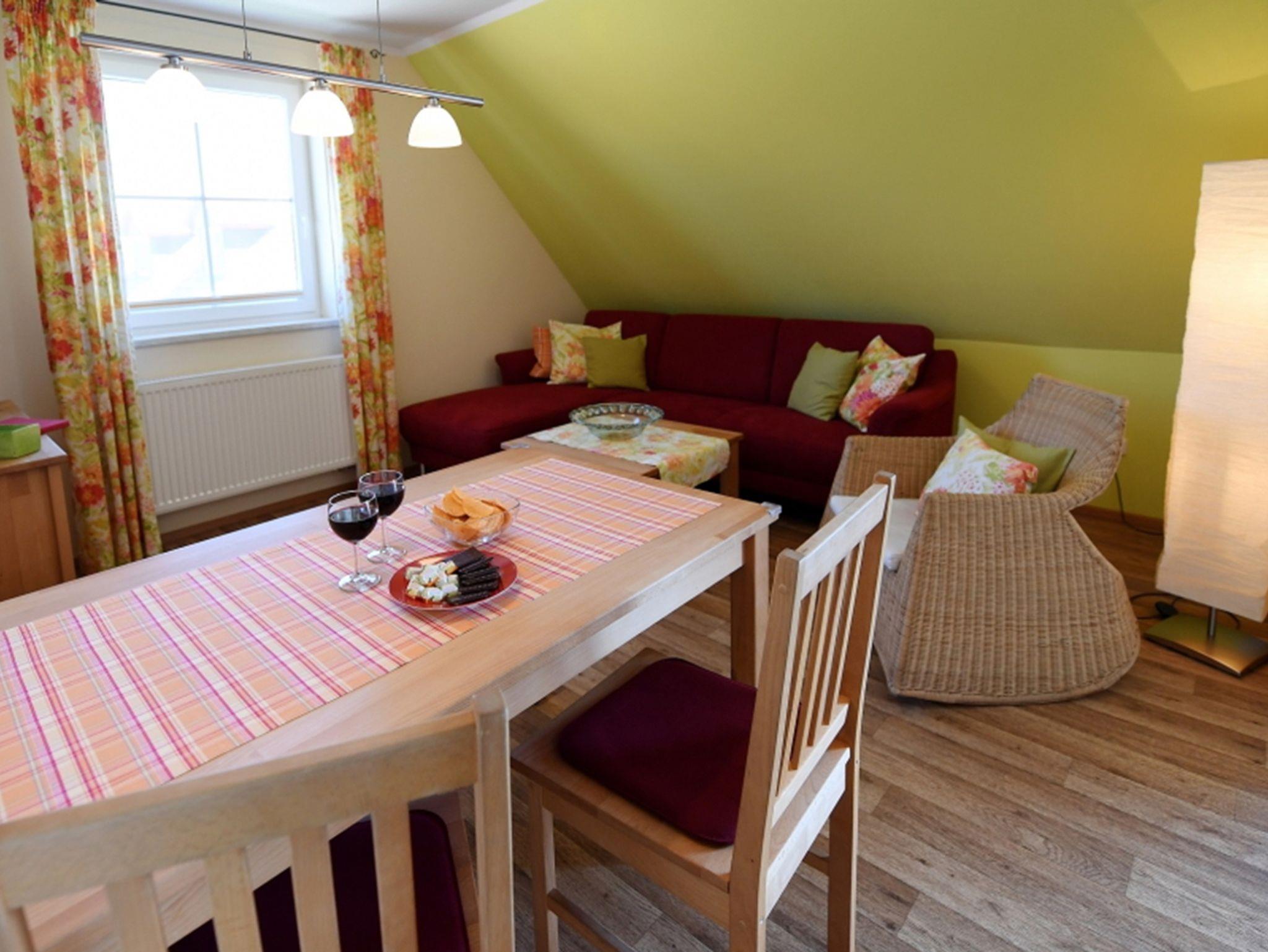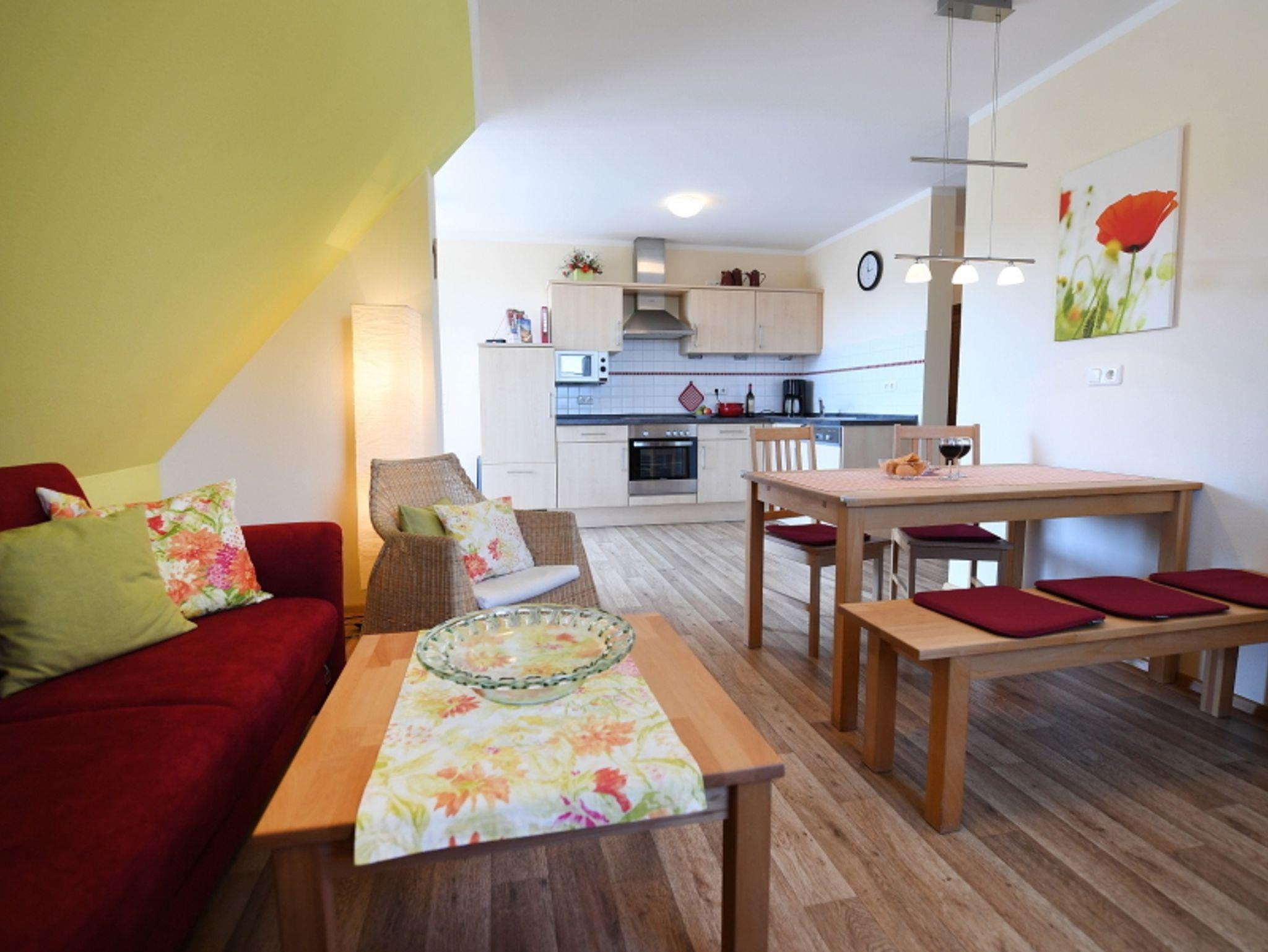 Die Wohnung Mohnblume ist ca. 60 m² groß und befindet sich im 1. Stock mit überdachtem Balkon und Zugang zur Liegewiese.