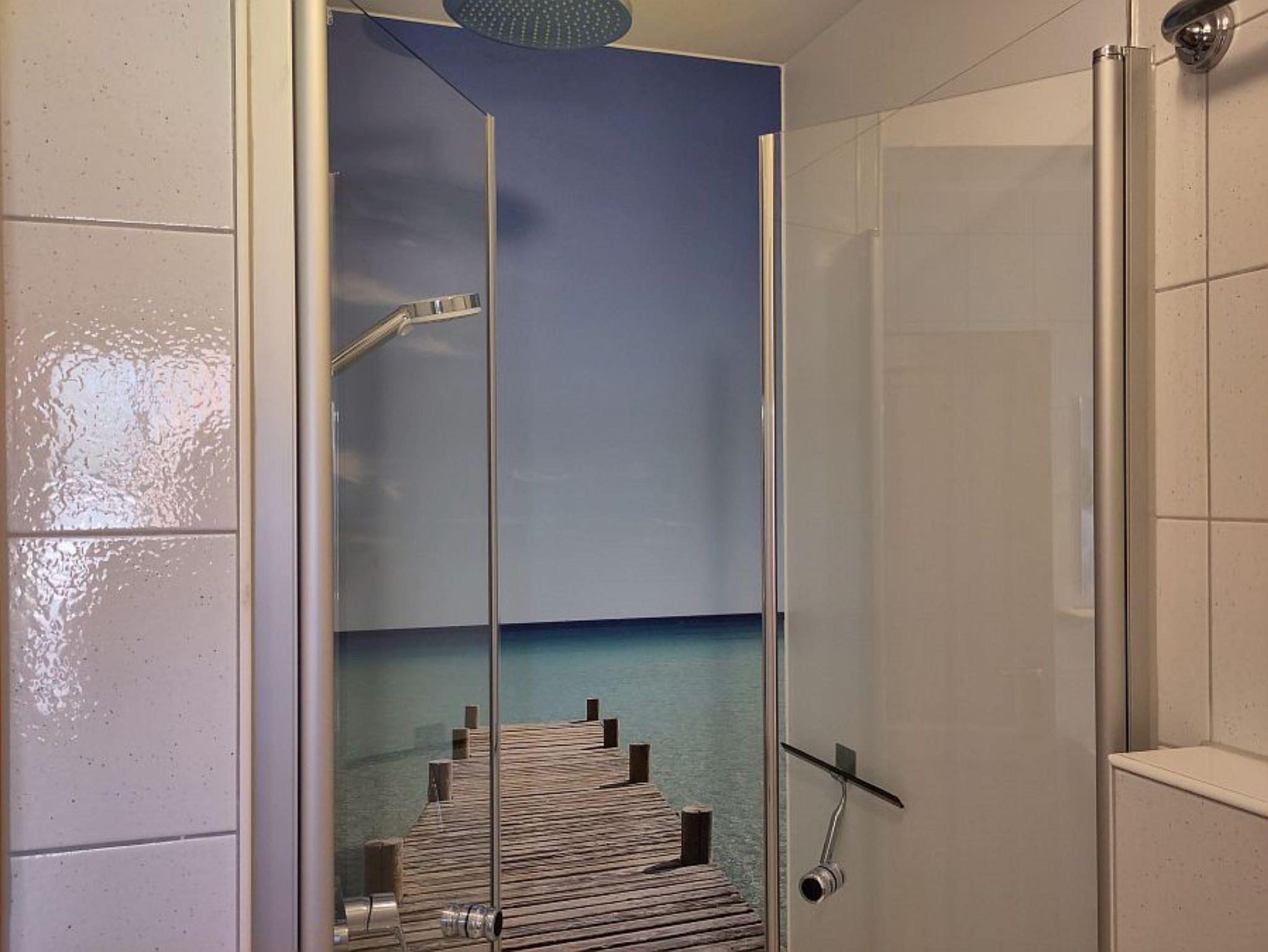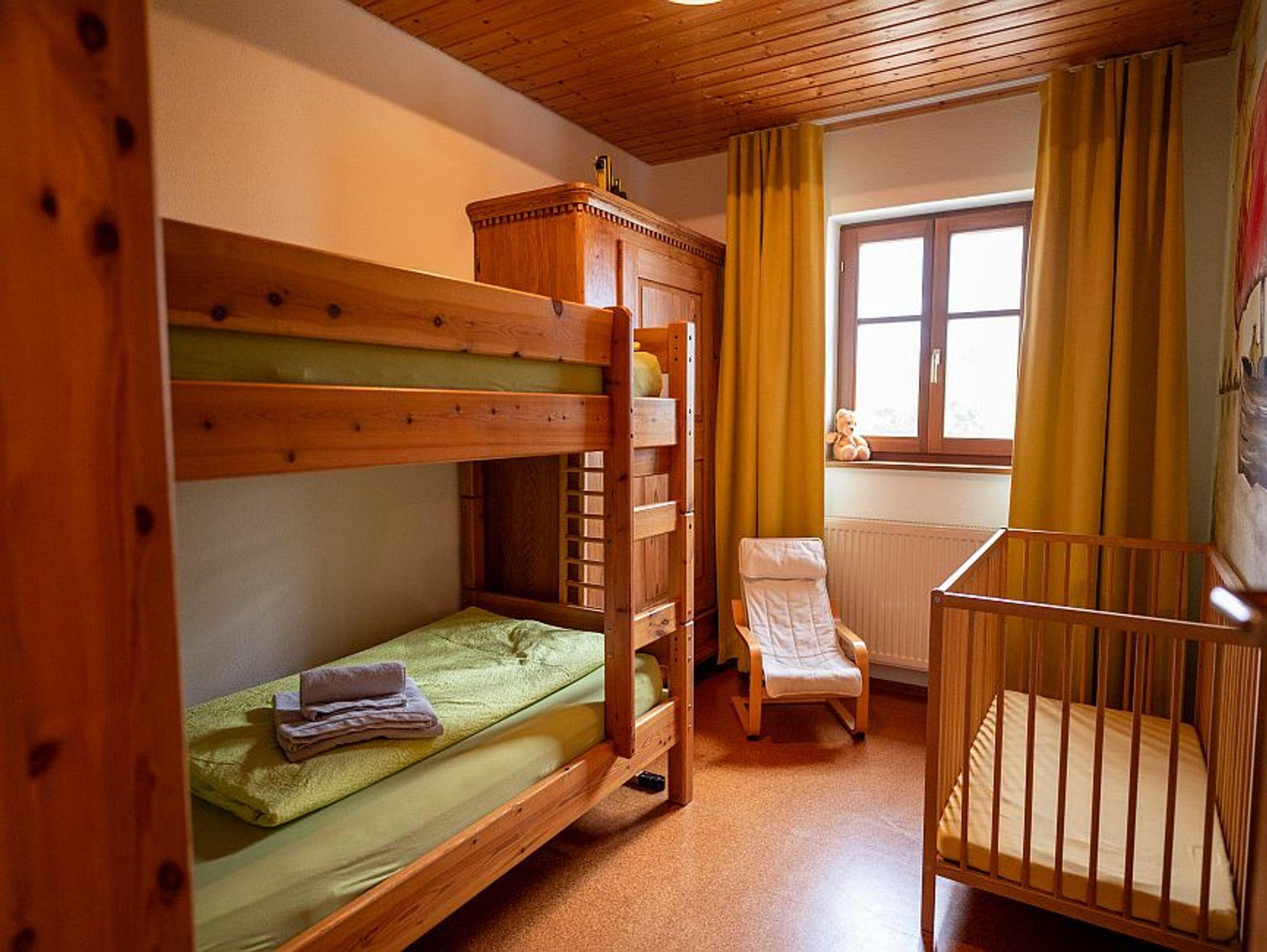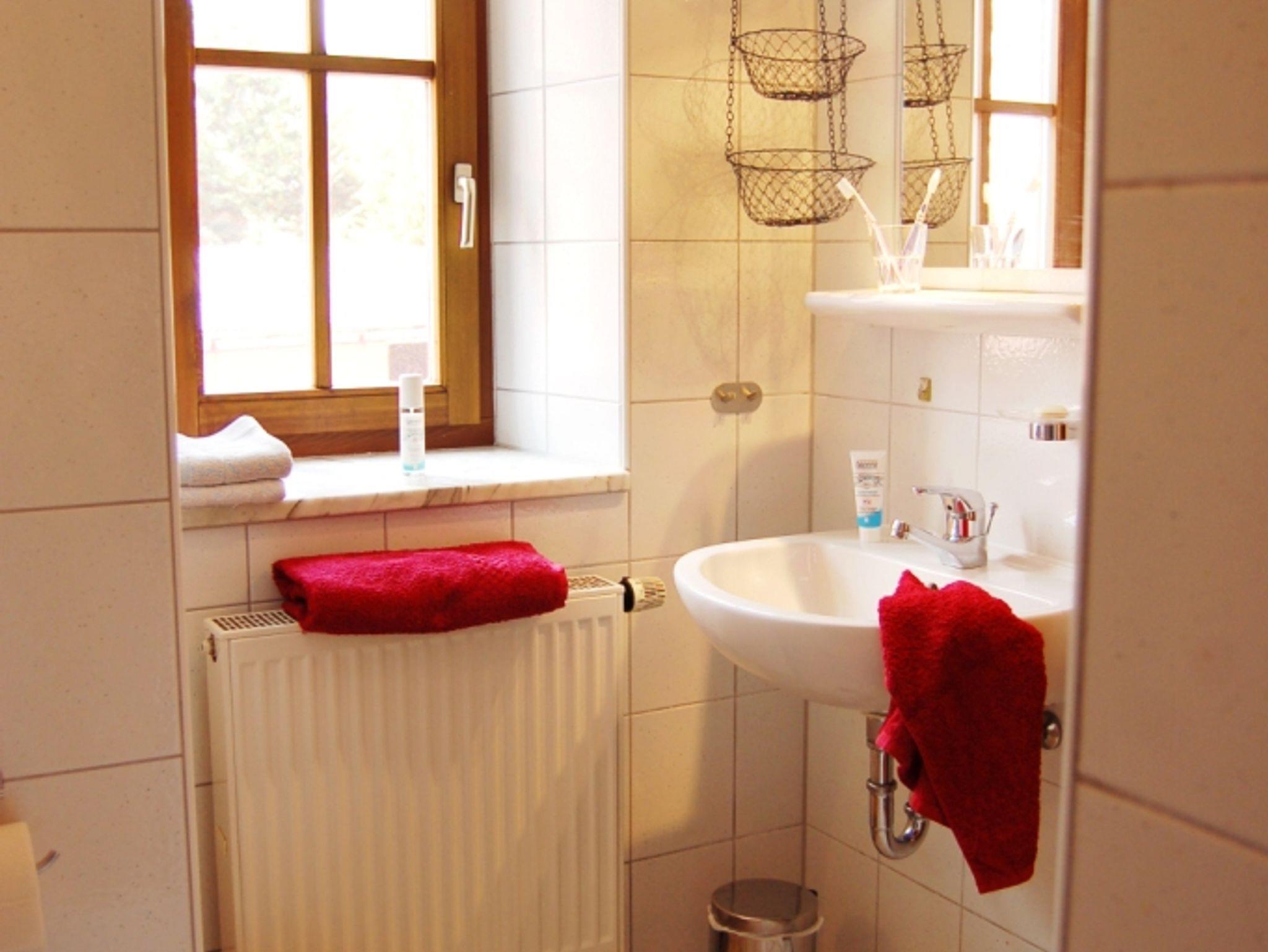 Die größeren Wohnungen im Ober- und Dachgeschoss haben jeweils zwei Schlafzimmer, einmal mit Doppelbett (160×200 cm) und einmal mit Stockbett (90×200 cm). In jedem Schlafzimmer hat zusätzlich ein Gitterbett Platz. Außerdem gibt es ein Bad mit Waschbecken, Dusche und WC und einen großzügigen Wohnraum mit Schlafcouch (160×200 cm), Esstisch mit Eckbank und Stühlen und natürlich eine Küche. Letztere sind komplett ausgestattet, u.a. mit Glaskeramik-Kochfeld (4 Platten), Backofen, Kühlschrank mit Gefrierfach und Spülmaschine. Entsprechend viel Geschirr und Besteck ist vorhanden, auch für Kinder. Außerdem finden Sie hier eine Kaffeemaschine, Wasserkocher, Toaster, Mixer, Kaffee- und Teefilter, Gewürze, Essig, Öl, Reinigungsmittel und –tücher…