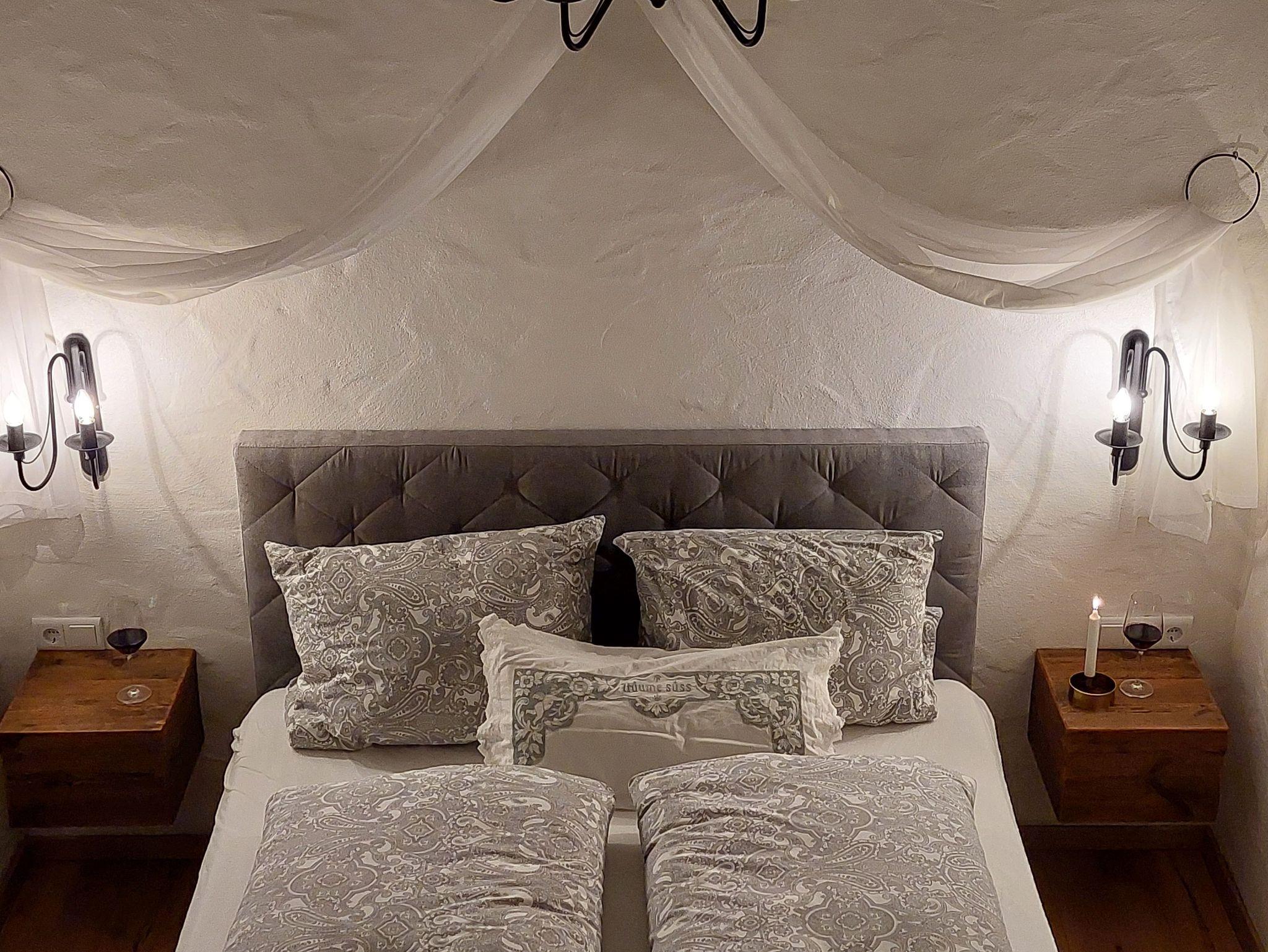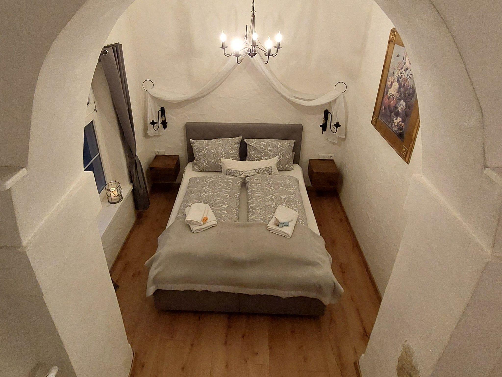 Im vorderen Teil befindet sich der Wohnbereich und der Aufgang zum Kinderschlafplatz (die Belegung des Kinderzwingers ist extra zu erfragen). Hinter dem großen original historischen Bogen, der das Zimmer teilt, erstreckt sich das Schlafgemach (Bettmaße: 1,60×2,00 m).
