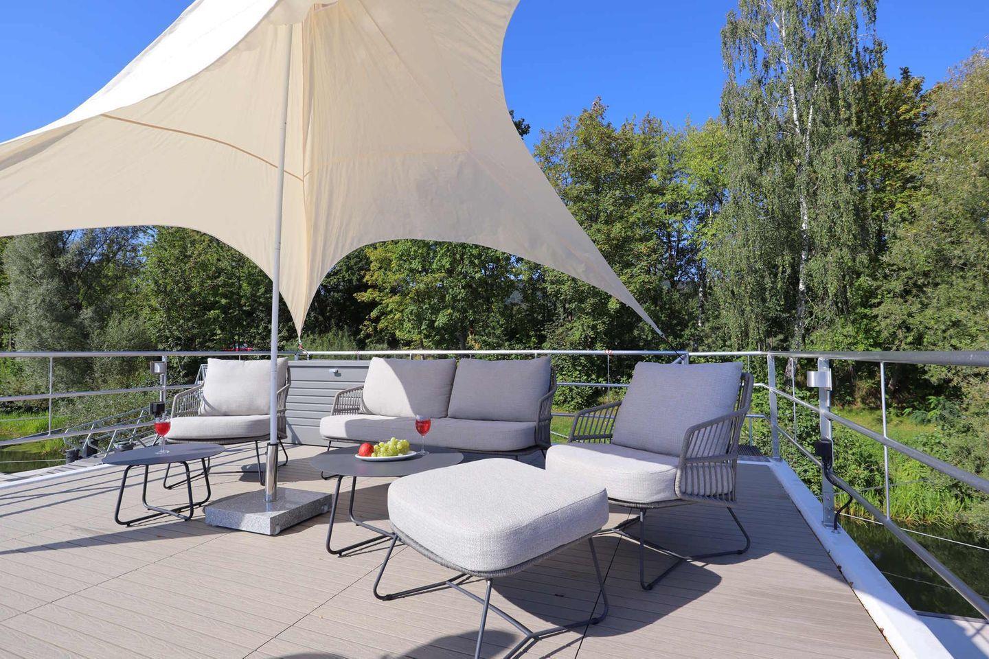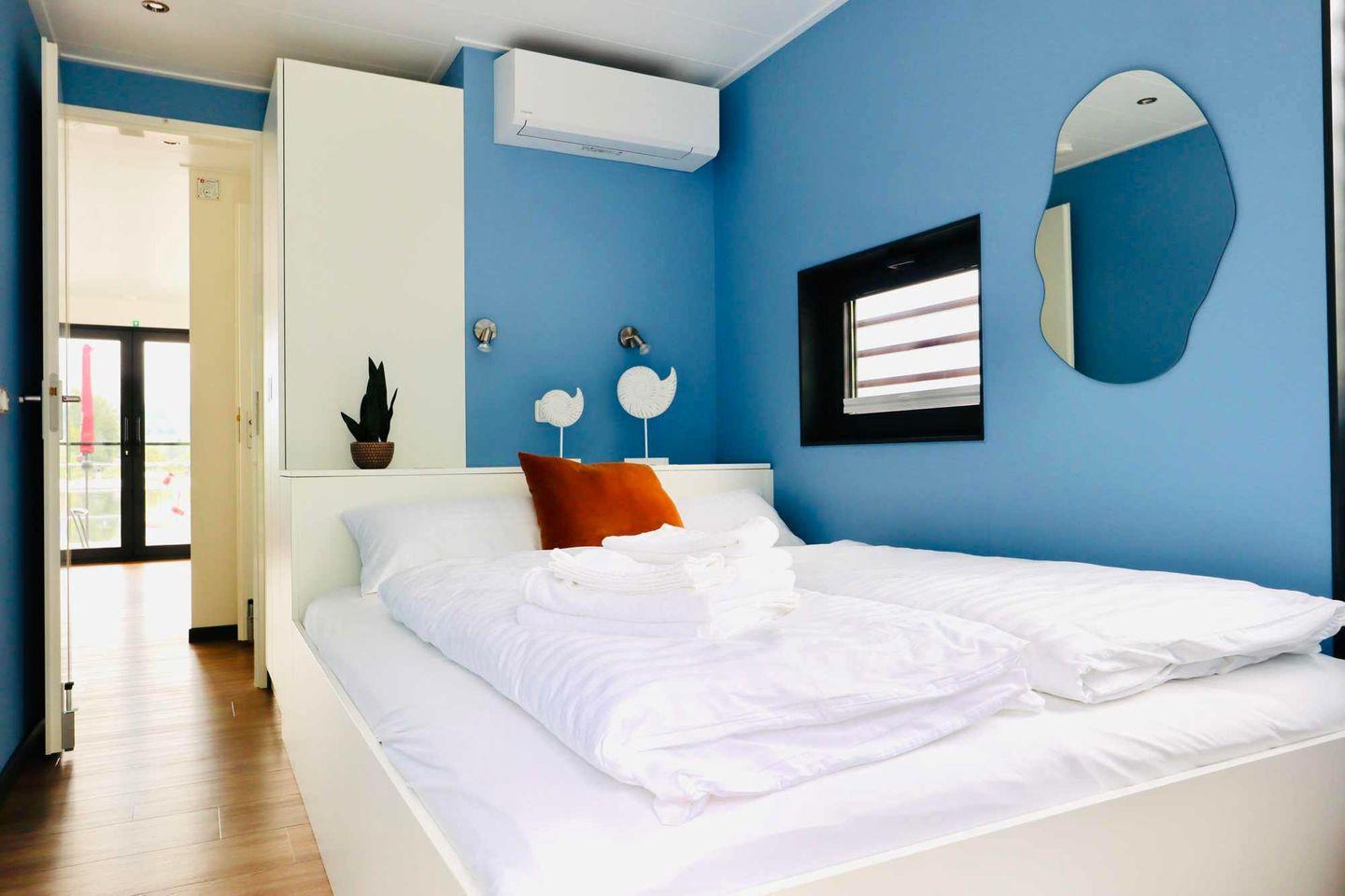 Floatinghouse CALIENE: freistehendes Hausboot direkt am See mit Seeblick und Landschaftsblick. Auf 44 m² erwarten Sie 3 Zimmer, 2 Schlafzimmer für bis zu 4 Personen sowie 1 Bad mit Dusche und Fenster. Offene Küche zum Wohnzimmer mit Ceranherd, Spülmaschine und Kaffeemaschine. Überdachte Terrasse mit Gartenmöbeln, Sonnenliegen und Elektrogrill am Steg. WLAN, TV, Klimaanlage, Kamin/Ofen. Nichtraucher, kinderfreundlich.