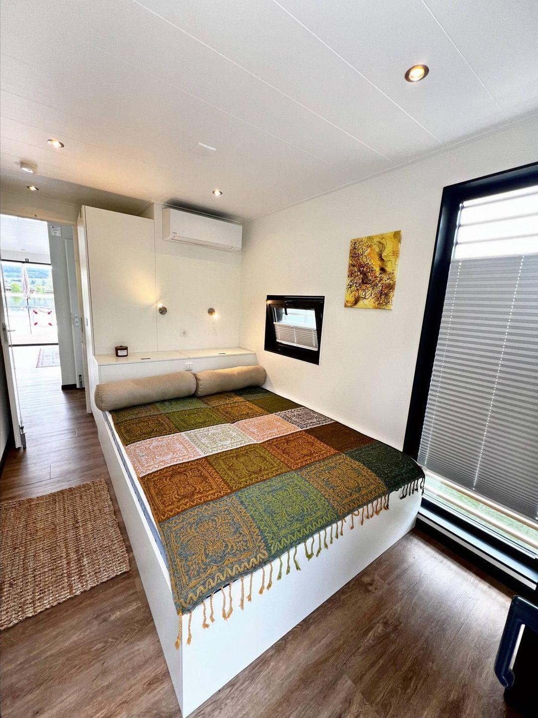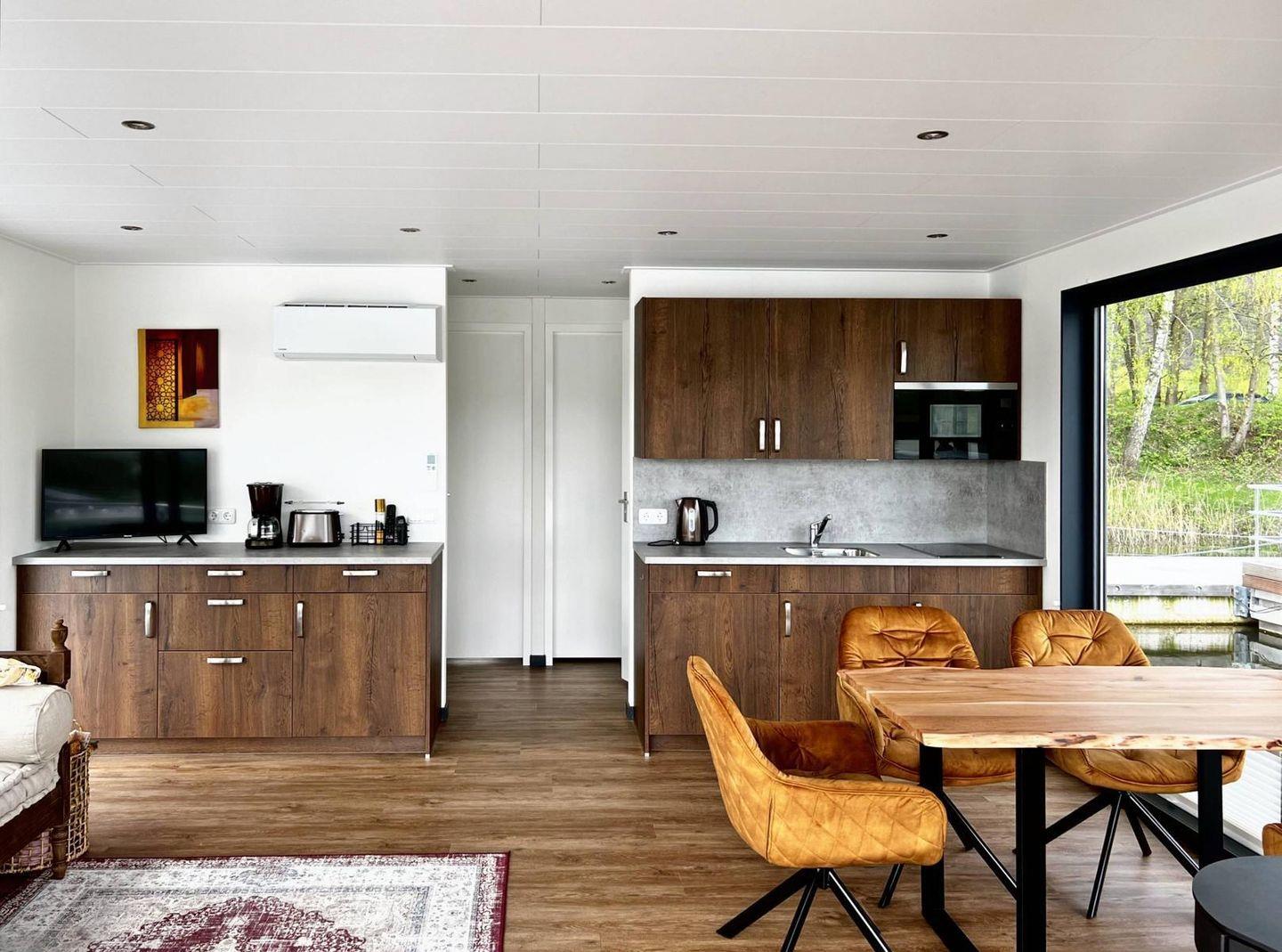Das Floatinghouse goldene Flunder (44 m²) bietet Urlaub direkt am See mit Seeblick und Landschaftsblick. 3 Zimmer mit 2 Schlafzimmern und Schlafmöglichkeiten für 4, Nichtraucher und kinderfreundlich. Offene Küche zum Wohnzimmer mit Ceranherd, Spülmaschine und Kaffeemaschine. Überdachte Terrasse mit Gartenmöbeln, Sonnenliegen und Elektrogrill am Steg; WLAN, TV, Klimaanlage und Kamin vorhanden.