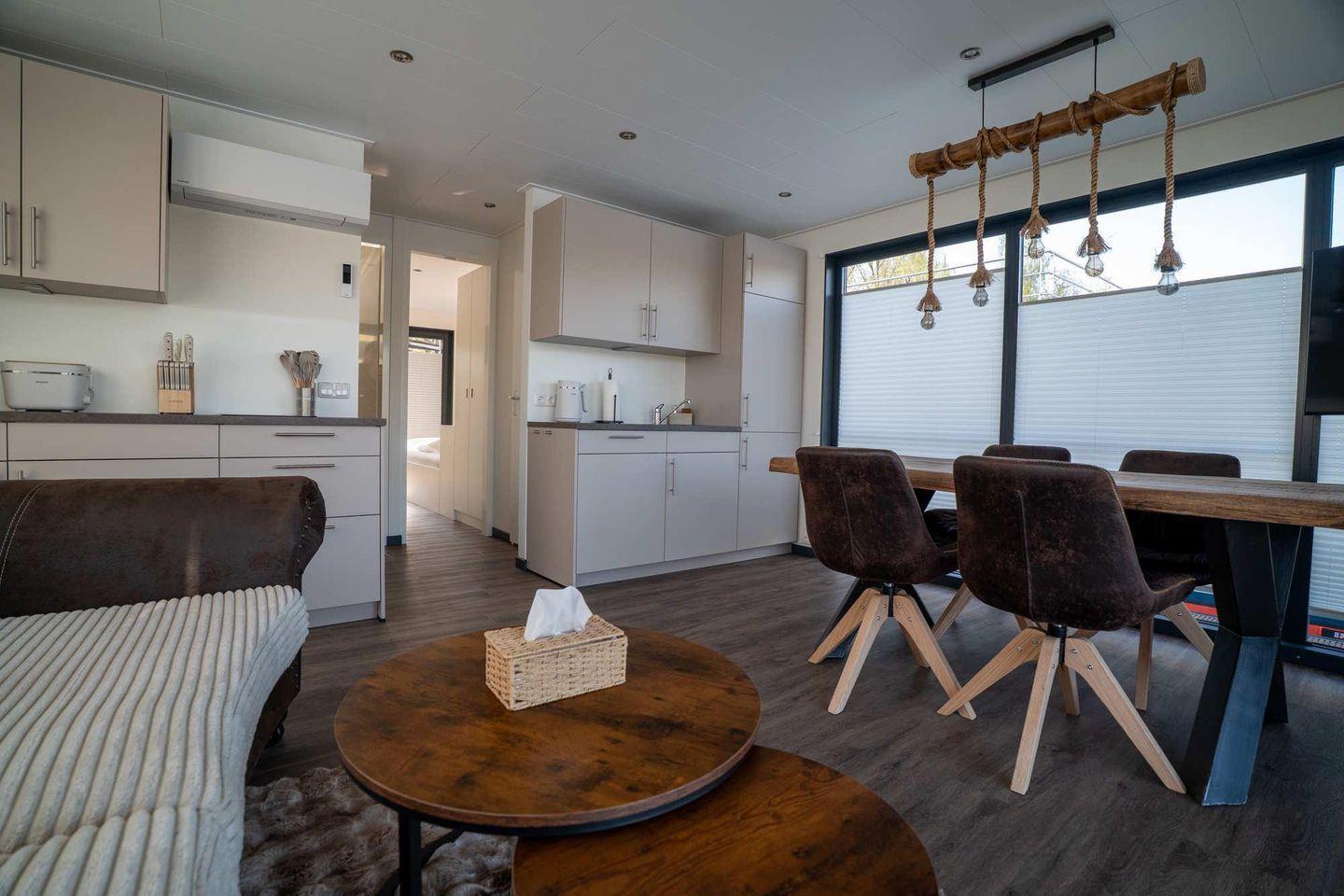Der Wohnbereich ist mit Sofa, Sofaecke, Essbereich und Esstisch ausgestattet und lädt nach einem Tag am See zum Ausruhen ein. Für Unterhaltung stehen TV, Radio sowie WLAN zur Verfügung. Die offene Küche ist zum Wohnzimmer hin gestaltet und funktional eingerichtet: Ceran-Herd, Kühlschrank mit Gefrierfach, Spülmaschine, Kaffeemaschine, Wasserkocher, Toaster sowie Küchenutensilien, Geschirr und Besteck sind vorhanden. Auch an praktische Details wie Abfalleimer und Geschirrhandtücher ist gedacht. Für gemütliche Mahlzeiten im Freien steht ein Elektrogrill bereit.