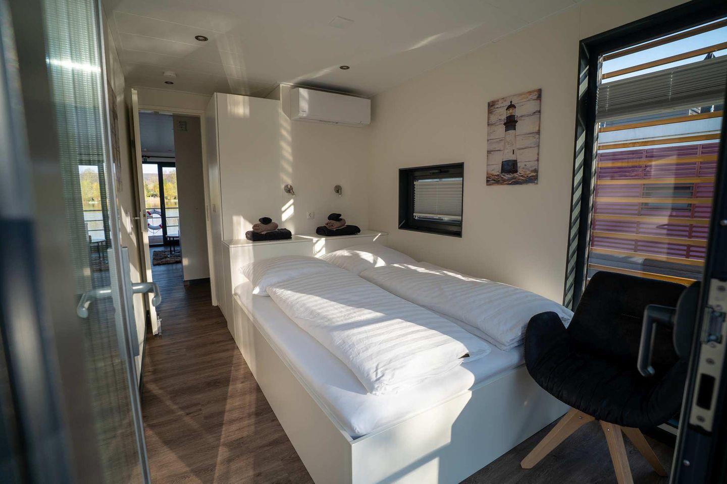 Auf 44 m² bietet das Floatinghouse insgesamt 3 Zimmer, darunter 2 Schlafzimmer, und ist für bis zu 4 Personen ausgelegt. Die Unterkunft ist als Nichtraucher-Objekt ausgewiesen, Kinder sind willkommen. Für ein angenehmes Raumklima sorgen Heizung und Klimaanlage; Fliegengitter und Sichtschutz an allen Fenstern unterstützen Komfort und Privatsphäre.