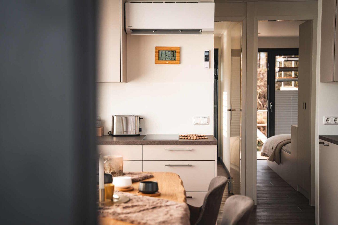 Der Wohnbereich ist mit Sofaecke, Esstisch und Essbereich ausgestattet und bietet außerdem TV und Radio. WLAN steht Ihnen zur Verfügung. Die offene Küche zum Wohnzimmer ist vollständig eingerichtet: Ceran-Herd, Kühlschrank mit Gefrierfach, Spülmaschine, Wasserkocher, Toaster, Kaffeemaschine sowie Küchenutensilien, Geschirr und Besteck sind vorhanden; auch Geschirrhandtücher und Abfalleimer gehören zur Ausstattung. Für gemeinsame Mahlzeiten im Freien steht ein Elektrogrill bereit.