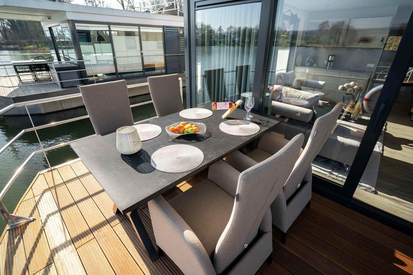 Der Wohnbereich ist als gemütlicher Mittelpunkt gestaltet und verfügt über Sofa, Sofaecke und einen Essbereich mit Esstisch. Für Unterhaltung und entspanntes Abschalten stehen TV, Radio sowie Internet und WLAN zur Verfügung. Dank Klimaanlage und Heizung genießen Sie zu jeder Jahreszeit ein angenehmes Raumklima. Fliegengitter und Sichtschutz an allen Fenstern unterstützen Komfort und Privatsphäre zusätzlich. Als Nichtraucher-Unterkunft bietet das Floatinghouse eine klare, gepflegte Umgebung; Kinder sind willkommen.