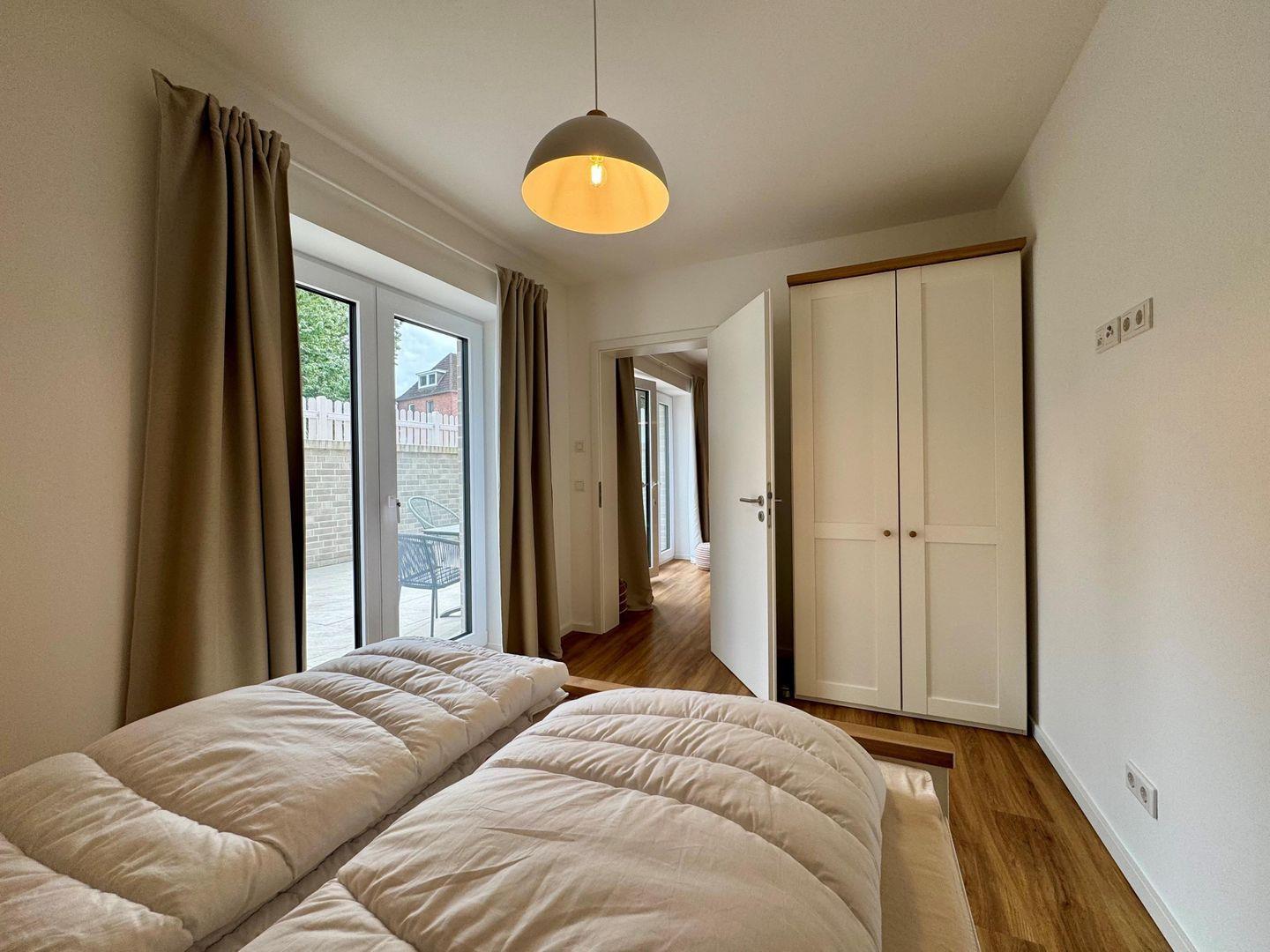 Das separate Schlafzimmer ist ebenfalls in Sandtönen gestrichen und bietet ein Doppelbett (160?×?200?cm), einen Kleiderschrank und zwei Nachttische. Von hier aus gelangen Sie ebenfalls direkt auf die große Terrasse.