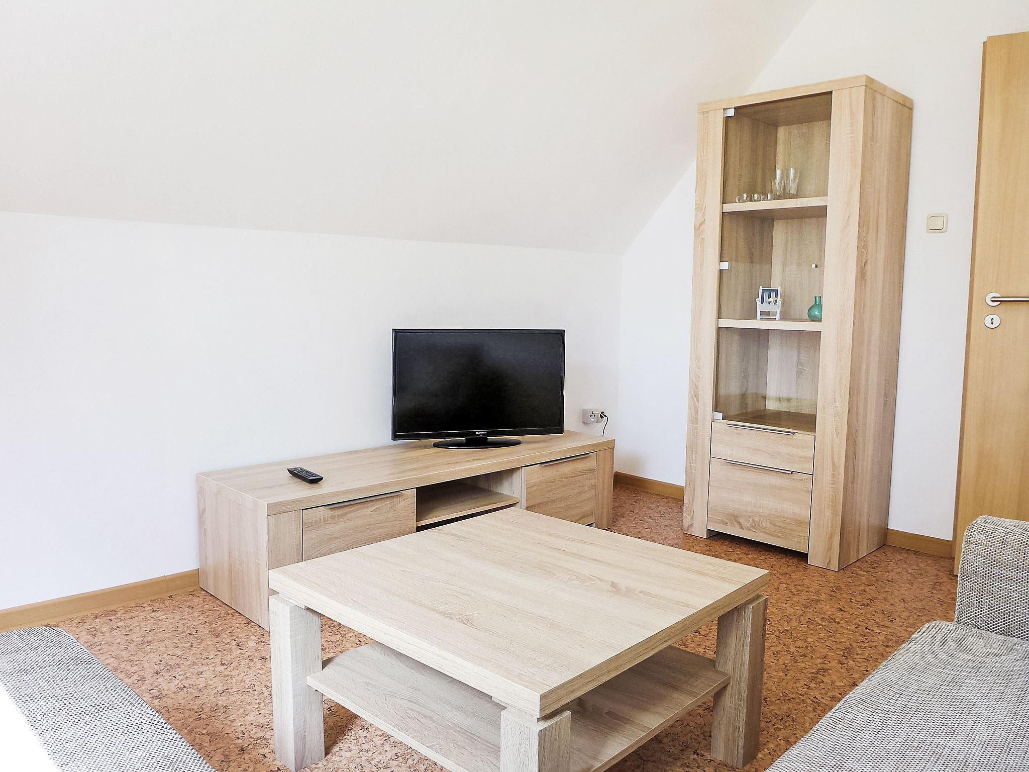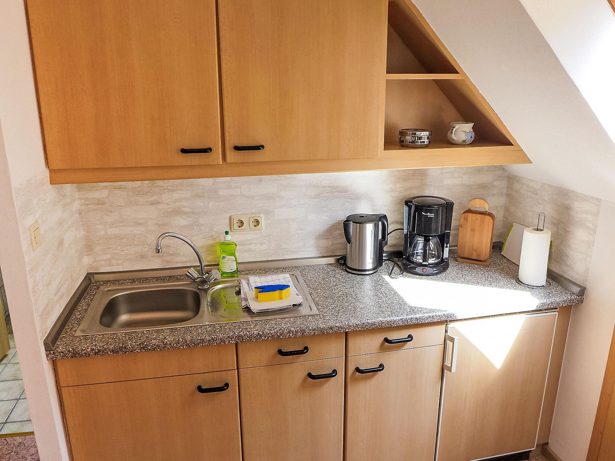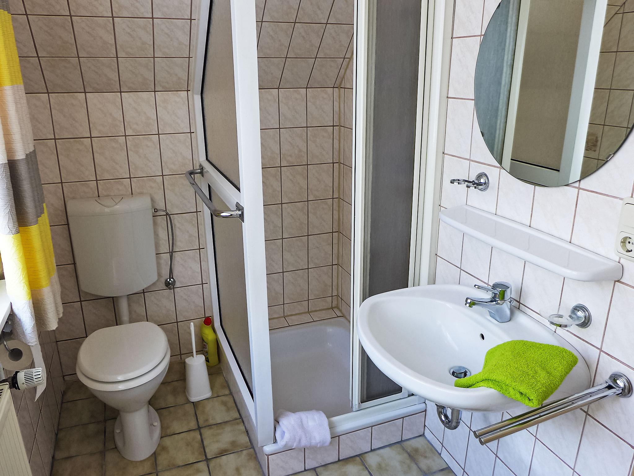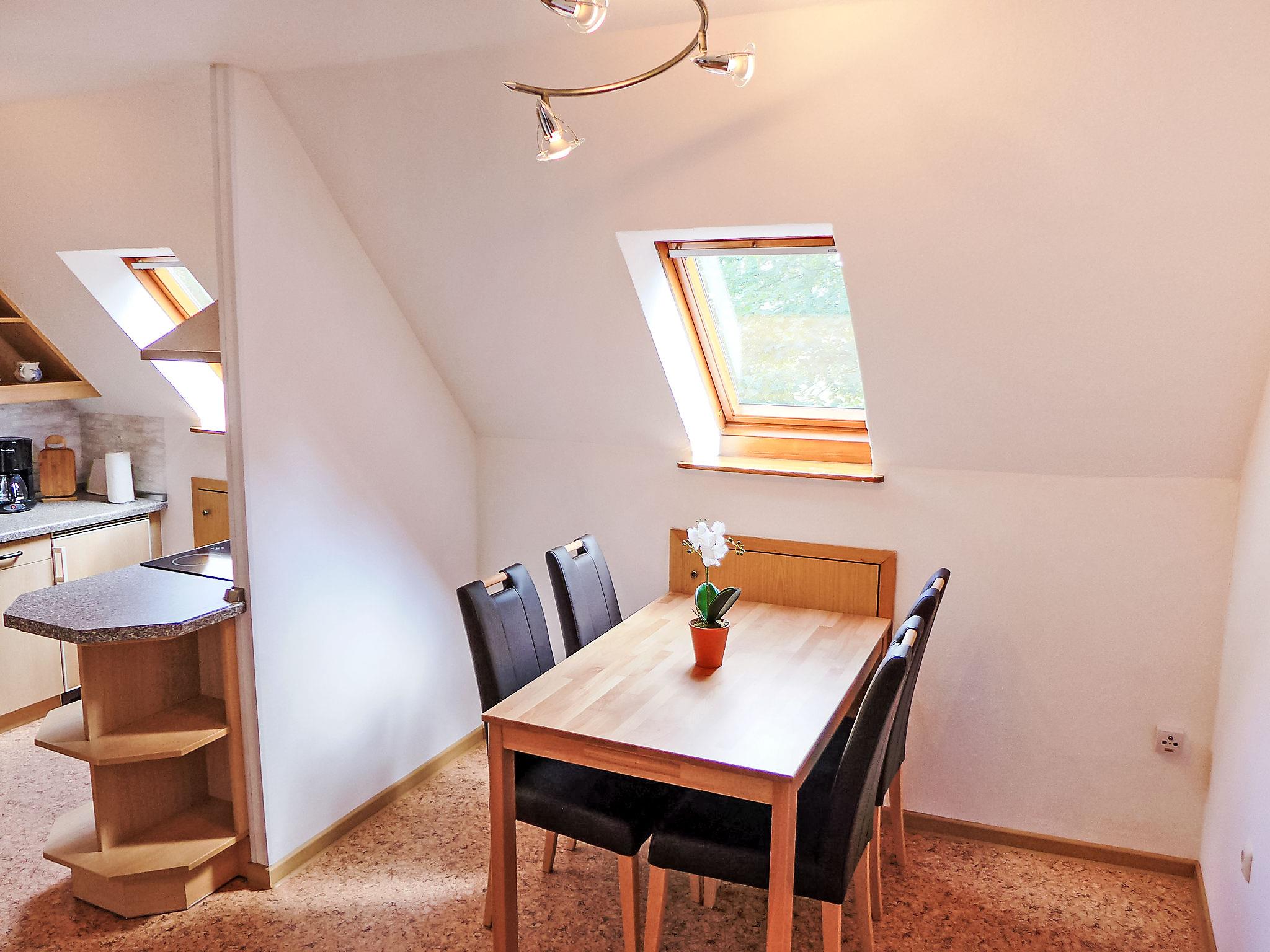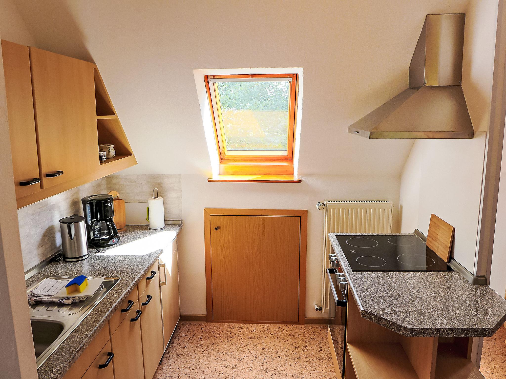 3-room apartment 80 m2, on the upper floor. With sloping ceilings: living room 14 m2 with satellite TV (flat screen). 2 rooms 15 m2, each room with 1 double bed (2 x 90 cm, length 200 cm). Kitchen (oven, 4 ceramic glass hob hotplates, electric coffee machine) with dining table. Shower/WC. Terrace. Terrace furniture, barbecue. Beautiful view of the countryside. Facilities: children's high chair (extra), hair dryer. Internet (WiFi, free). Please note: non-smokers only. Smoke alarm.