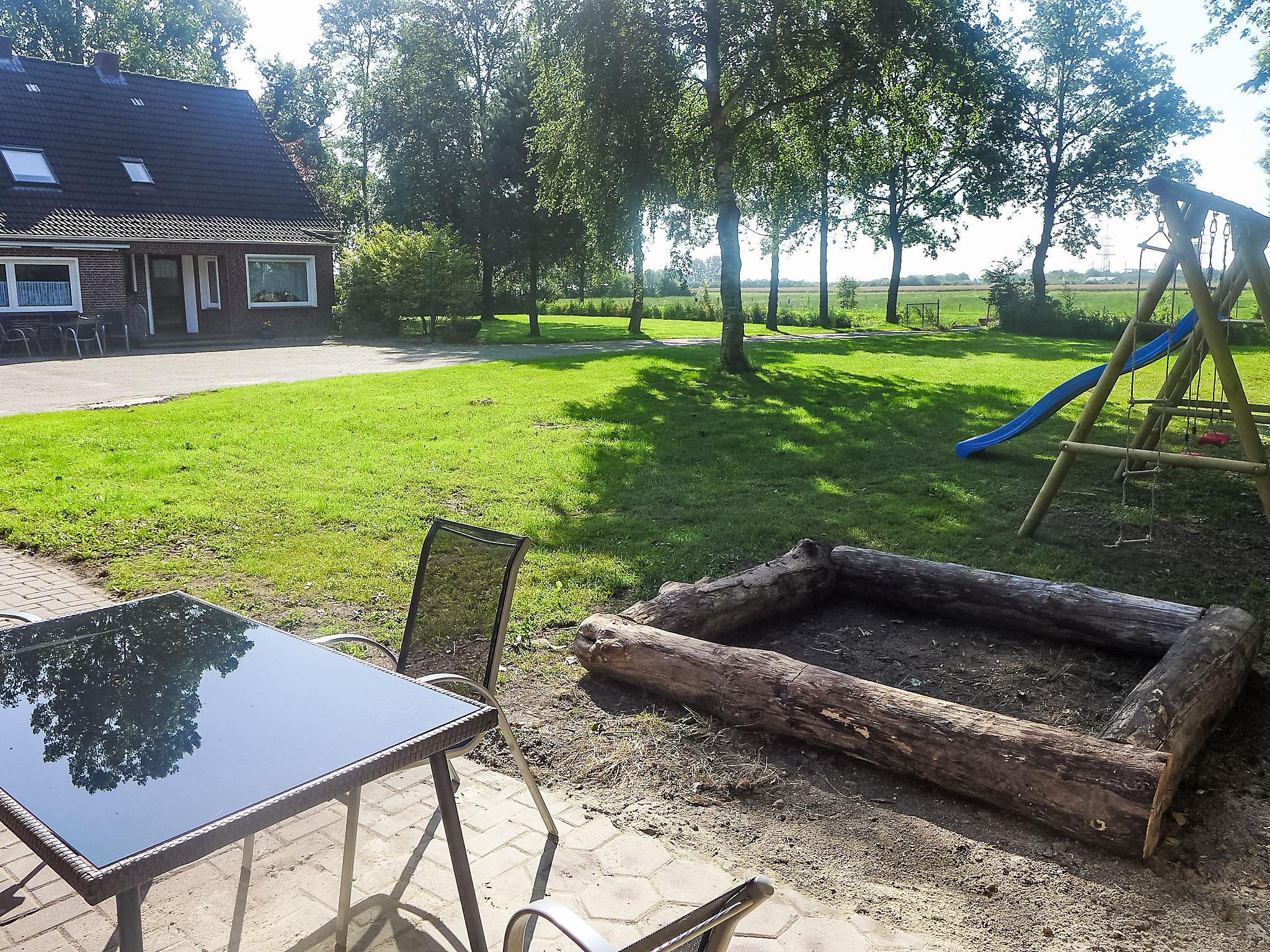 Halbemond 6 km from Hage: 2-family house "Landblick", detached, surrounded by meadows and fields. In a quiet position, 12 km from the sea, 12 km from the beach. For shared use: large garden with lawn. Children's playground (swing). In the house: central heating system. Parking at the house. Shop 5 km, supermarket 5 km, restaurant 1.4 km, bakery 1.4 km, café 1.4 km, bus stop 5 m, ferry 11 km, sandy beach 12 km, outdoor swimming pool 9 km, indoor swimming pool 7 km. Golf course (18 hole) 7 km, surf school 12.5 km. Please note: car recommended.