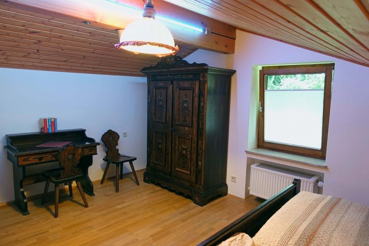 Das Schlafzimmer ist im bayrischen Stil eingerichtet, ausgestattet mit einem Kleiderschrank, Kommode mit Spiegel, Schreibtisch, zwei Stühle und einem Doppelbett mit Nachtschränken.