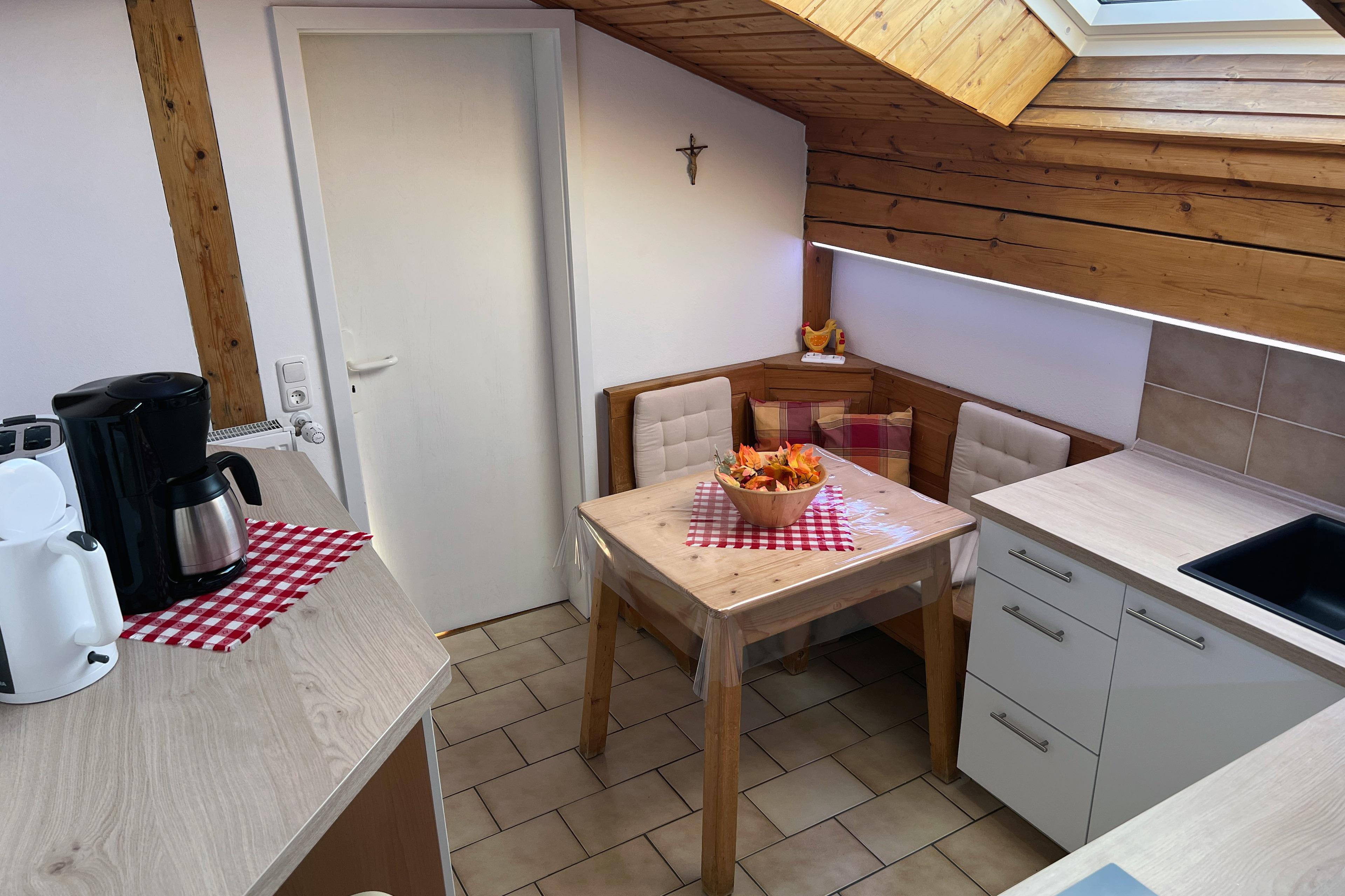 Die kleine Küche ist mit einer modernen Küchenzeile ausgestattet. Unsere Gäste finden hier zur Eigenversorgung einen Kühlschrank mit Gefrierfach, 2 Kochplatten ohne Backofen dafür mit Klarstein Heißluftfritteuse, Eierkocher cloer6070, Mikrowelle, Wasserkocher, Toaster und Kaffeemaschine. An der kleinen Sitzecke finden bis zu 4 Personen Platz. Weiter ist eine Theke mit zwei Barhockern vorhanden.
