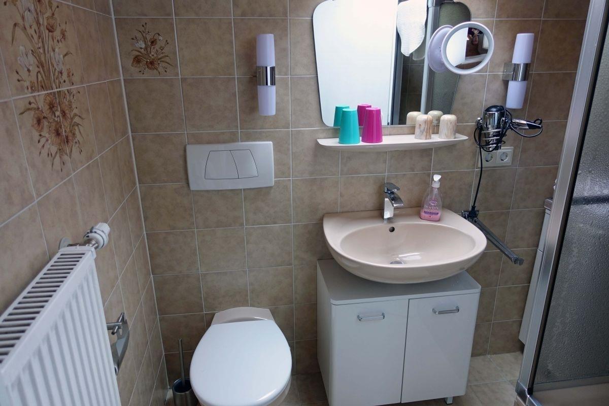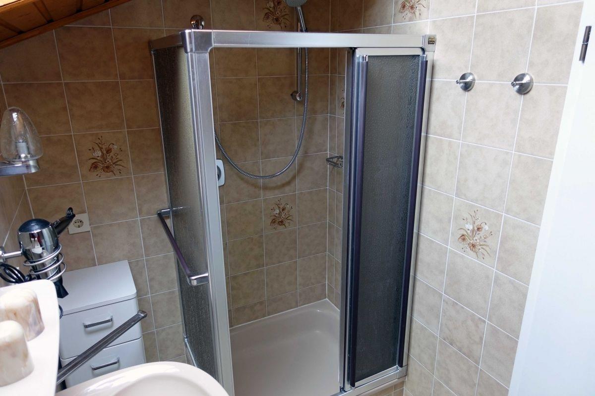 Vom Flur aus betritt man das kleine Badezimmer mit Tageslicht. Dies ist ausgestattet mit einem Waschtisch, Spiegel und Unterschrank, eine Dusche 90 x 70 cm mit Eckeinstieg und einem weiteren kleinen Schrank.