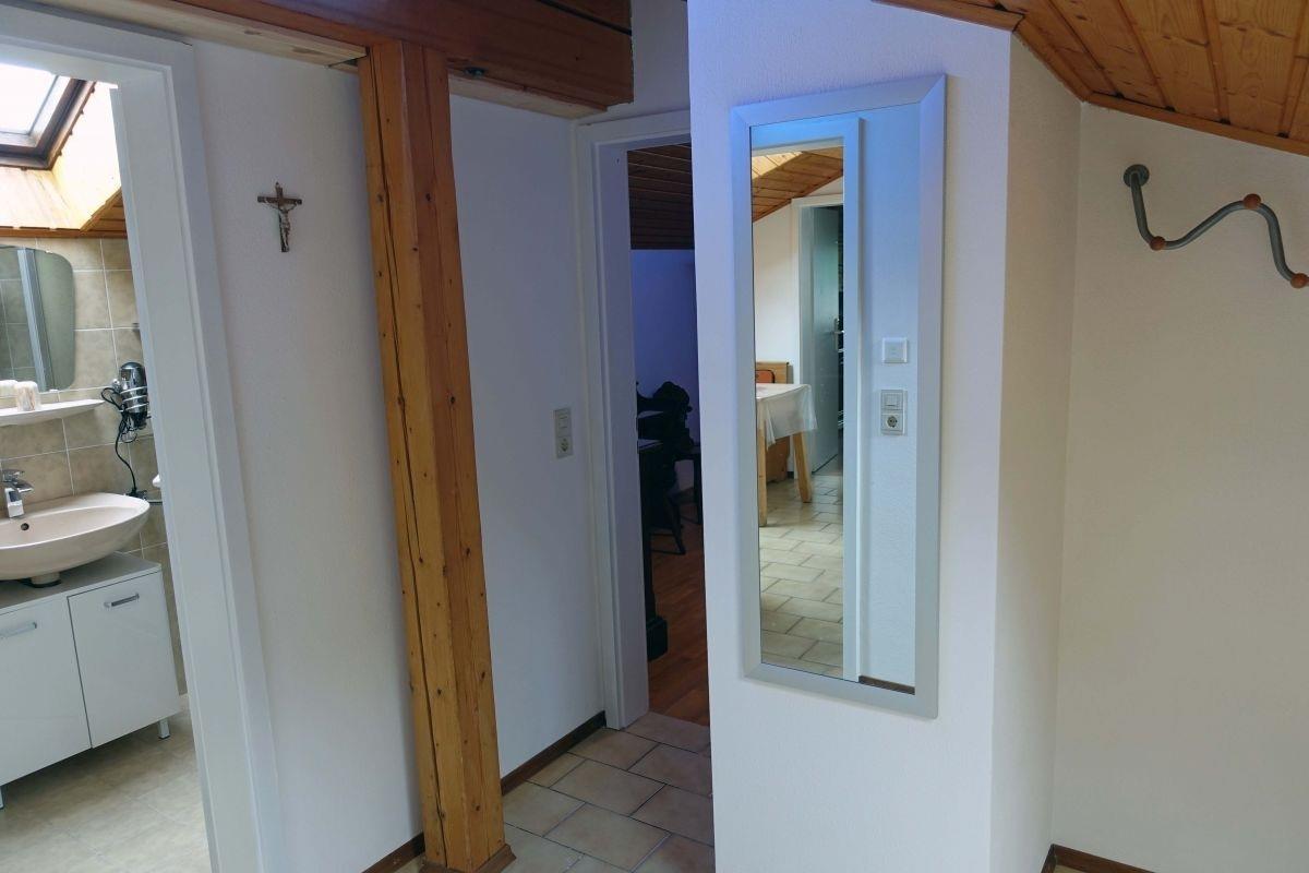 Von der Haustür gelangen unsere Gäste über das Treppenhaus eine Etage nach oben in das Dachgeschoß. Von dem kleinen Flur sind Küche, Bad und Schlafzimmer zu betreten. In das Wohnzimmer gelangen Sie durch die Küche.