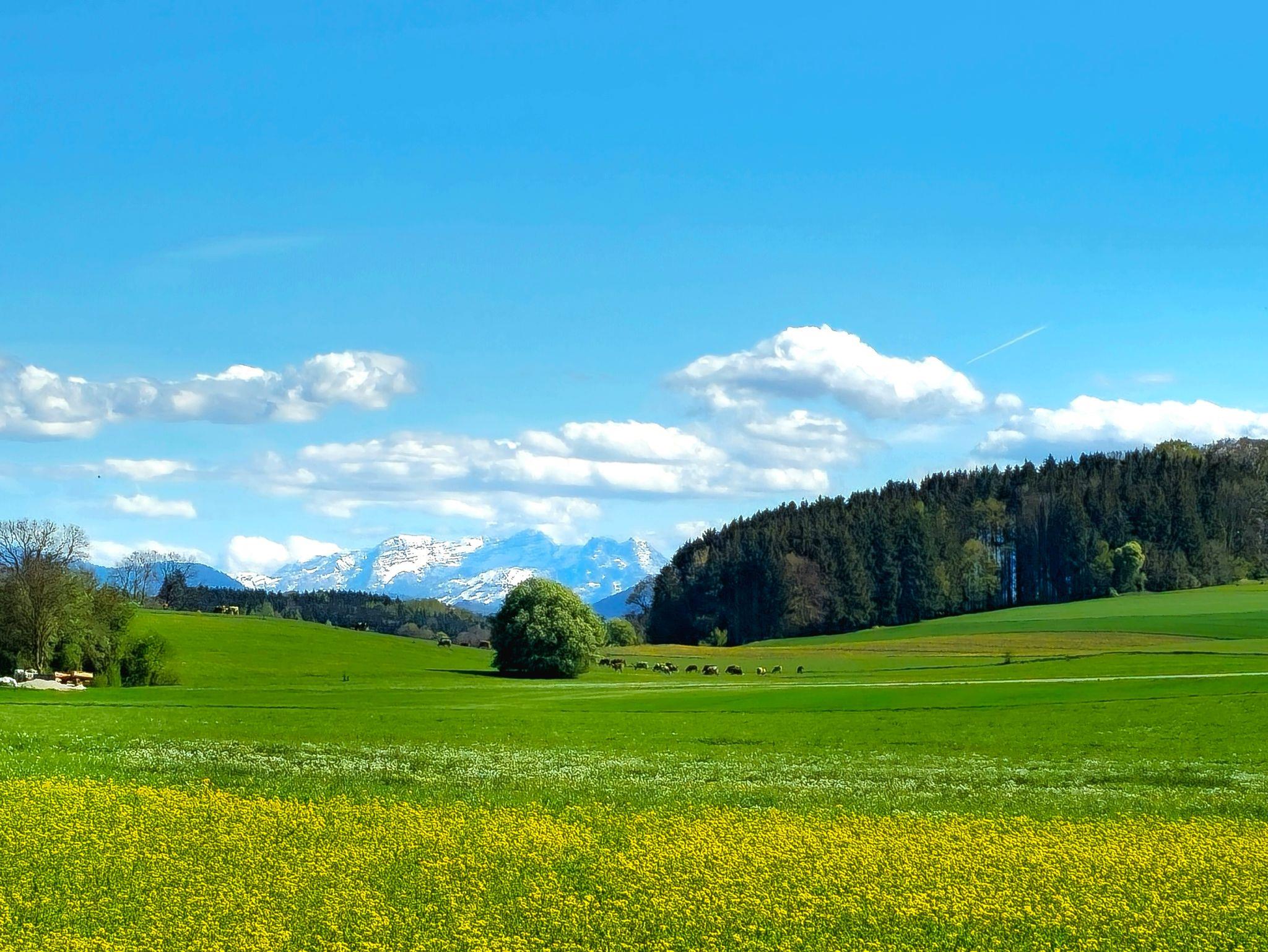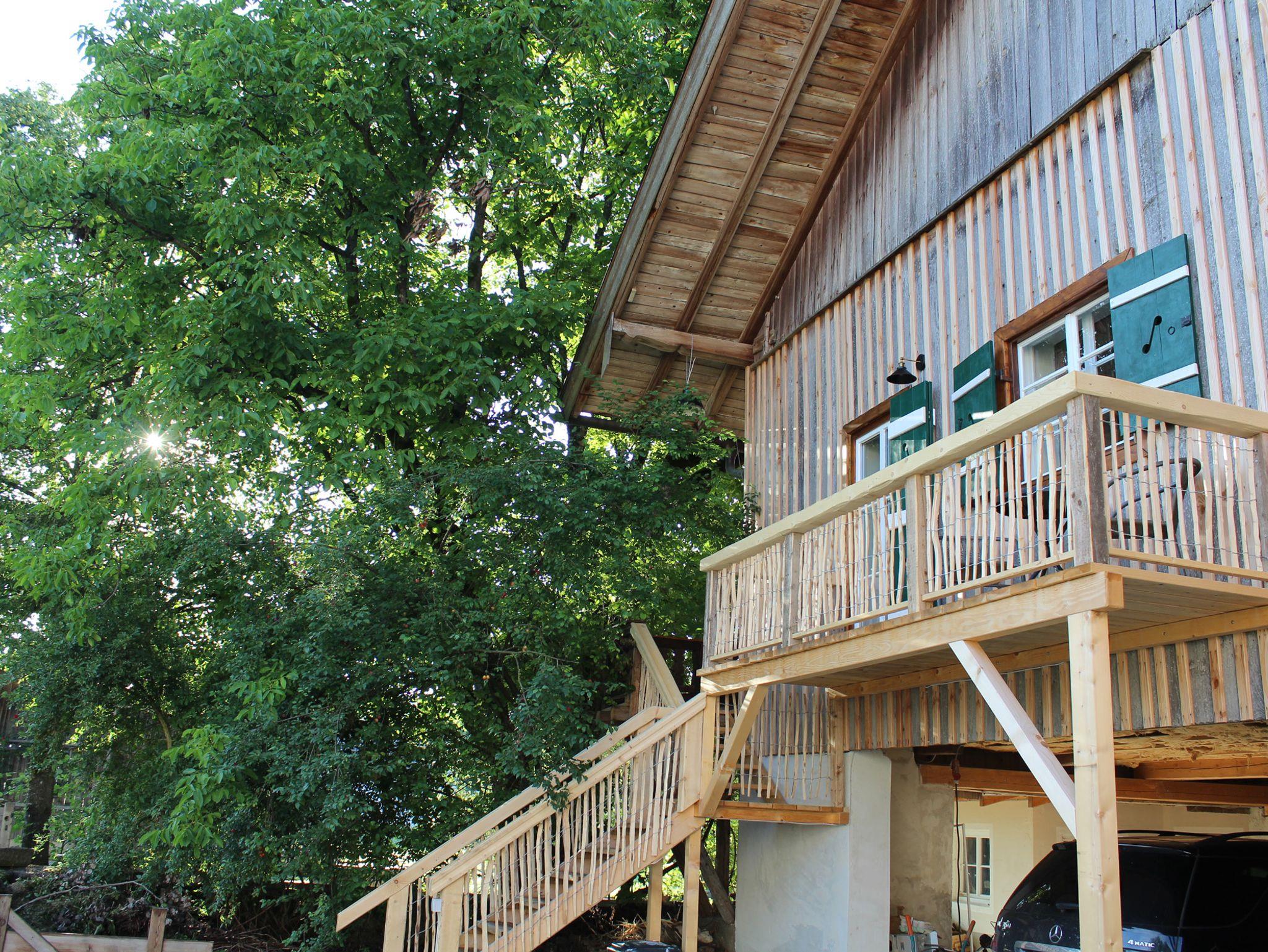 Unser Hof liegt naturnah, ländlich, urig, freundlich mit Ausblick ins Grüne, auf die Berge und die alte Obstwiese, welche unsere Hühner (mit Hahn) bewohnen.
