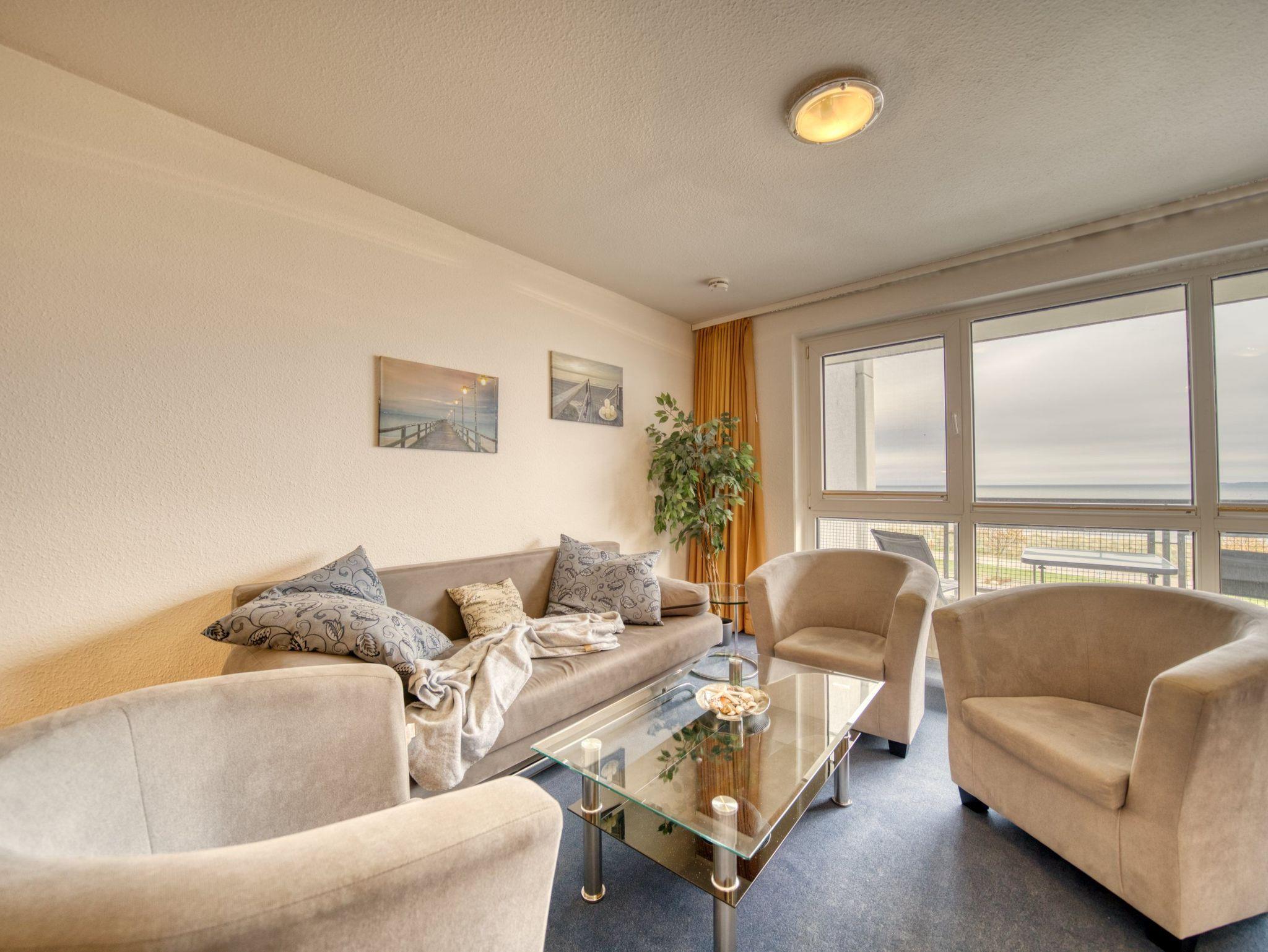 Wohnbereich: Großzügig und hell, mit gemütlichem Schlafsofa, Flatscreen-TV und Essbereich