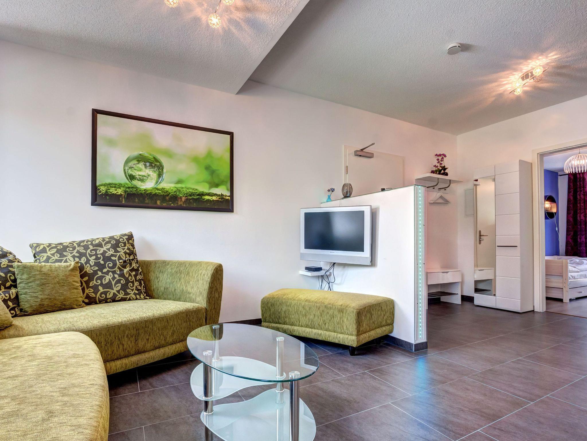 Der großzügige Wohnraum lädt zum Entspannen ein und ist mit einer bequemen Couch, einem Sessel und einem Couchtisch ausgestattet. Natürlich stehen Ihnen auch Sat-TV und Radio zur Verfügung, damit Sie sich rundum wohlfühlen. Die gut ausgestattete Küchenzeile bietet alles, was Sie für Ihre Mahlzeiten benötigen: eine Ceranfeldplatte, Mikrowelle, Geschirrspüler, Kaffeemaschine, Toaster, Wasserkocher und vieles mehr. Der Küchentresen eignet sich perfekt, um gemütlich zu frühstücken - ein idealer Start in den Tag!