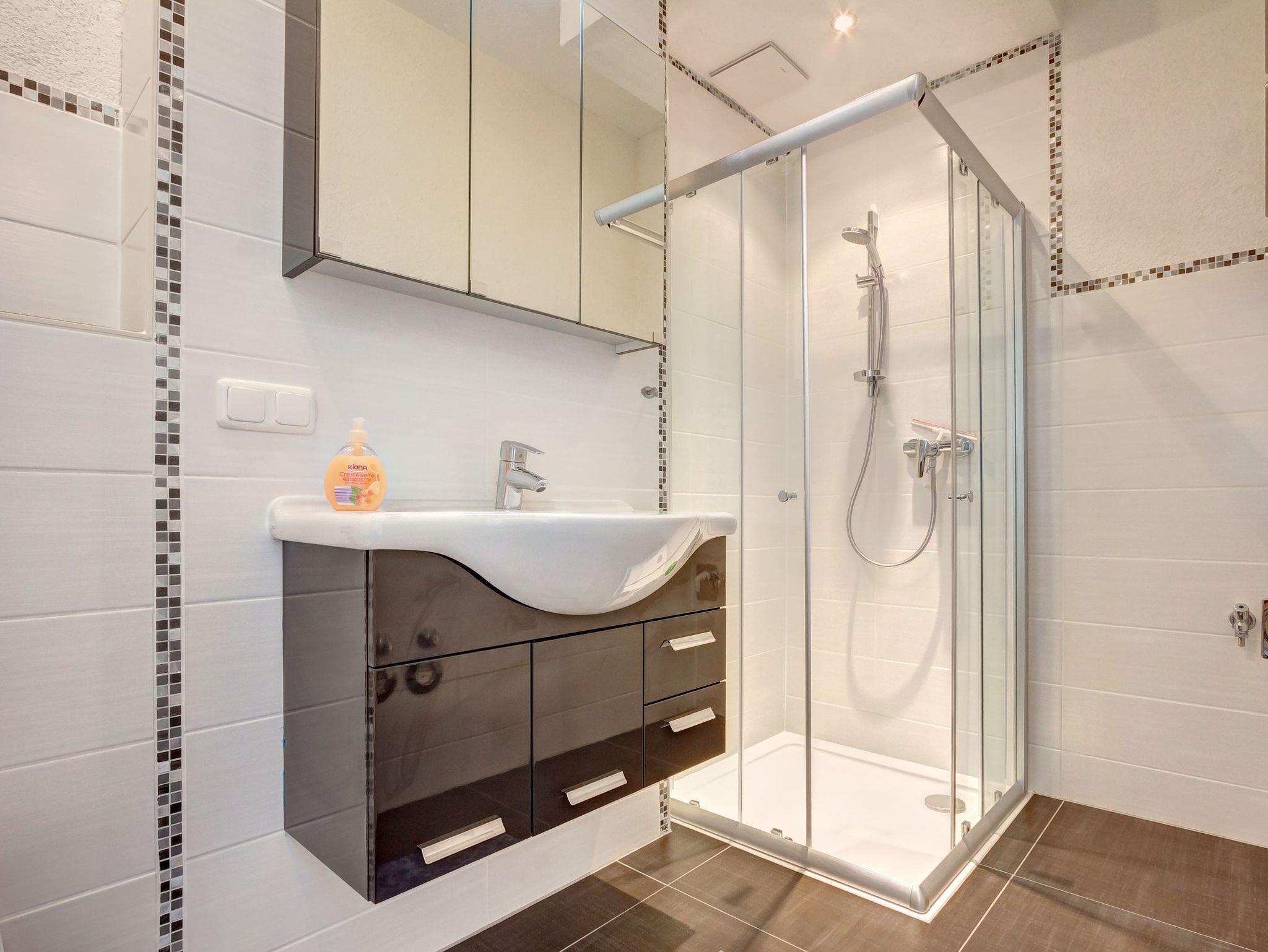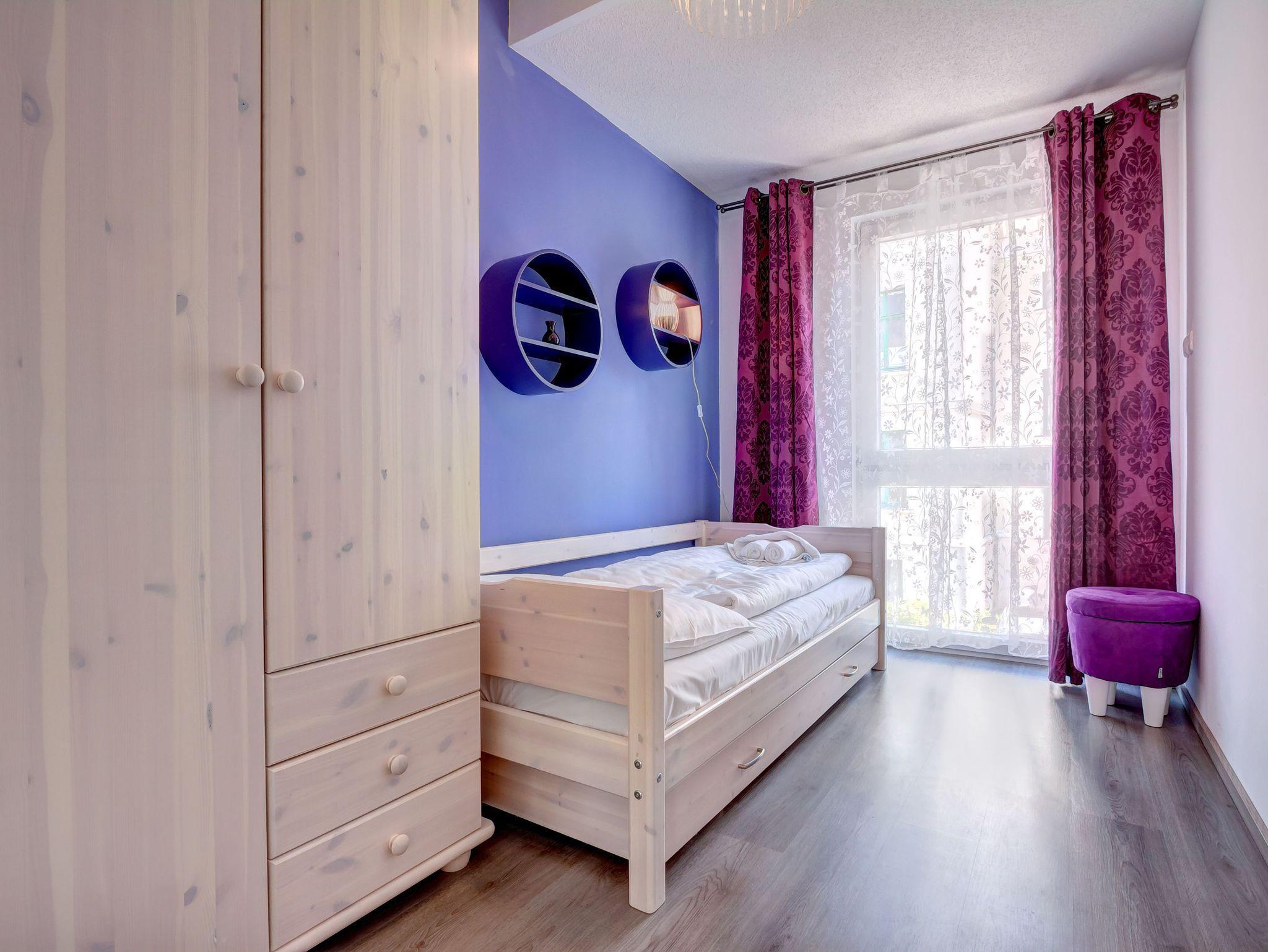 Wohnzimmer, Flur und Bad sind mit Fliesen ausgelegt, während die Schlafzimmer mit Laminatböden versehen sind. Das Schlafzimmer bietet ein komfortables Doppelbett und einen Kleiderschrank, der ausreichend Platz für Ihre Kleidung bietet. Im zweiten Schlafzimmer finden Sie ein ausziehbares Einzelbett, das bei Bedarf Platz für bis zu zwei Personen bietet. Das Bad ist modern mit einer Dusche und WC ausgestattet.
