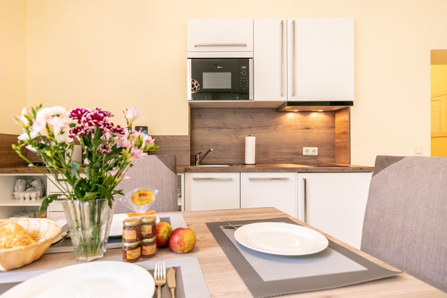 Die im Hochparterre des Captain’s Hauses gelegene 3-Raum-Nichtraucherferienwohnung mit 66m² verfügt über einen großzügigen Wohn- und Essbereich mit separatem Esstisch. Die integrierte Küchenzeile ist mit einem Cerankochfeld, Kühlschrank mit Gefrierfach, Mikrowelle, Toaster, Wasserkocher, Kaffeemaschine und Geschirrspüler ausgestattet.