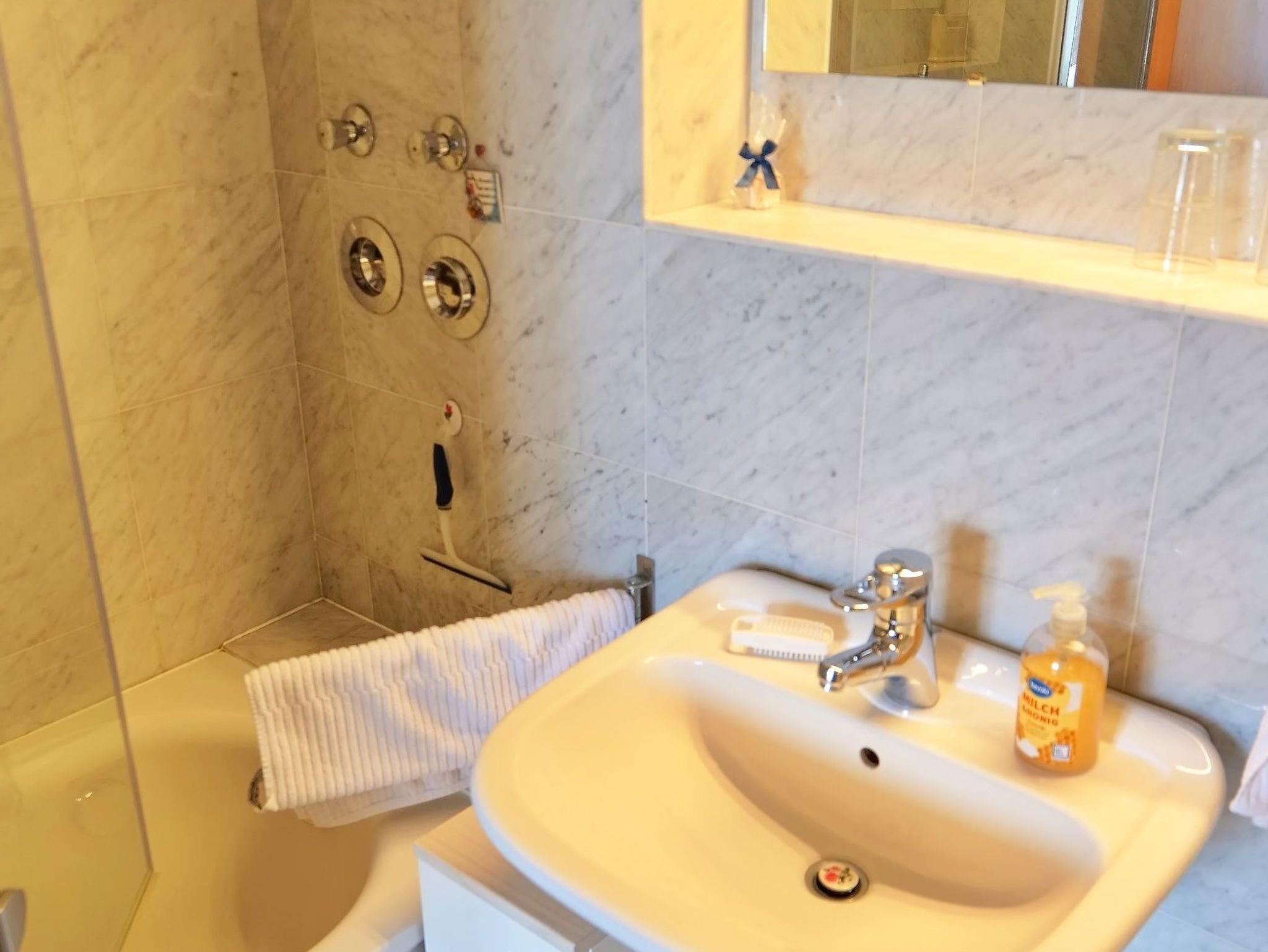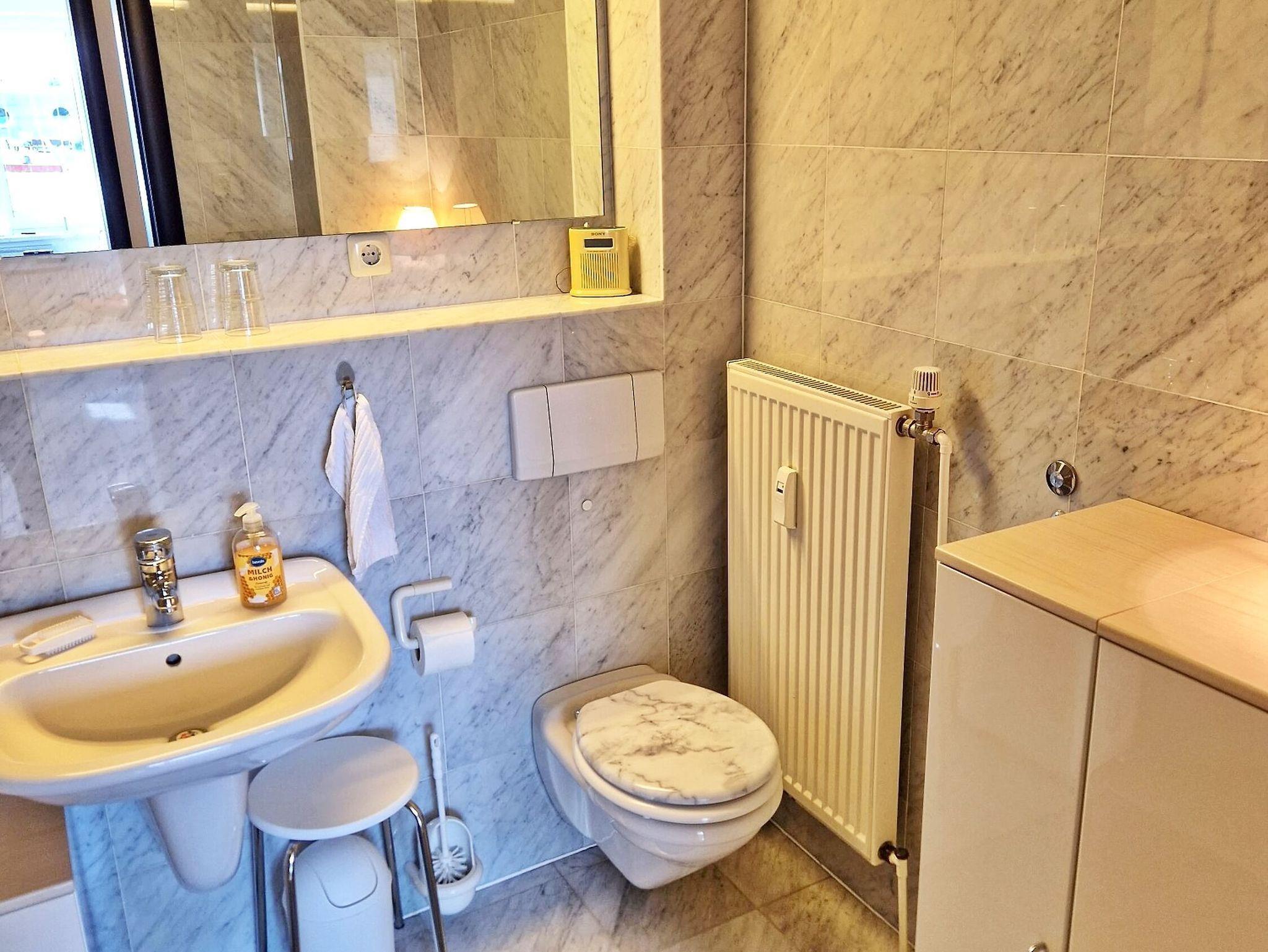 Badezimmer mit Badewanne, WC, Spiegelschrank