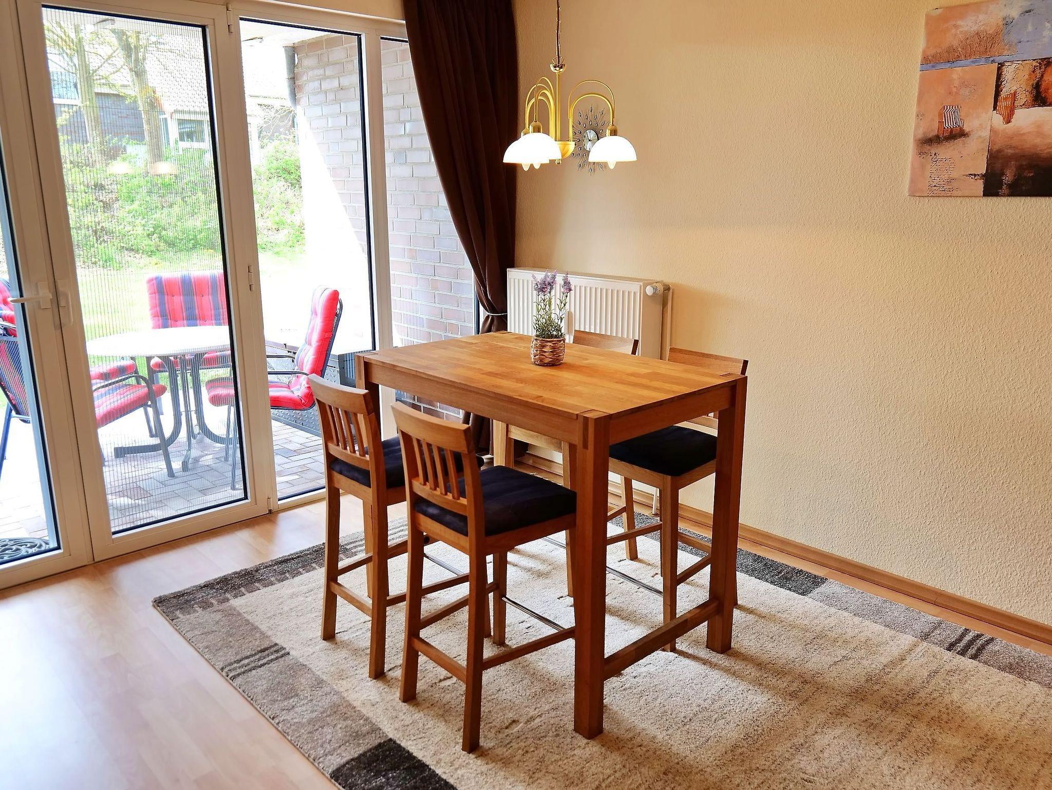 Wohnzimmer mit Couch (ausziehbar), Essbereich mit 4 Stühlen, TV und Zugang zur Terrasse