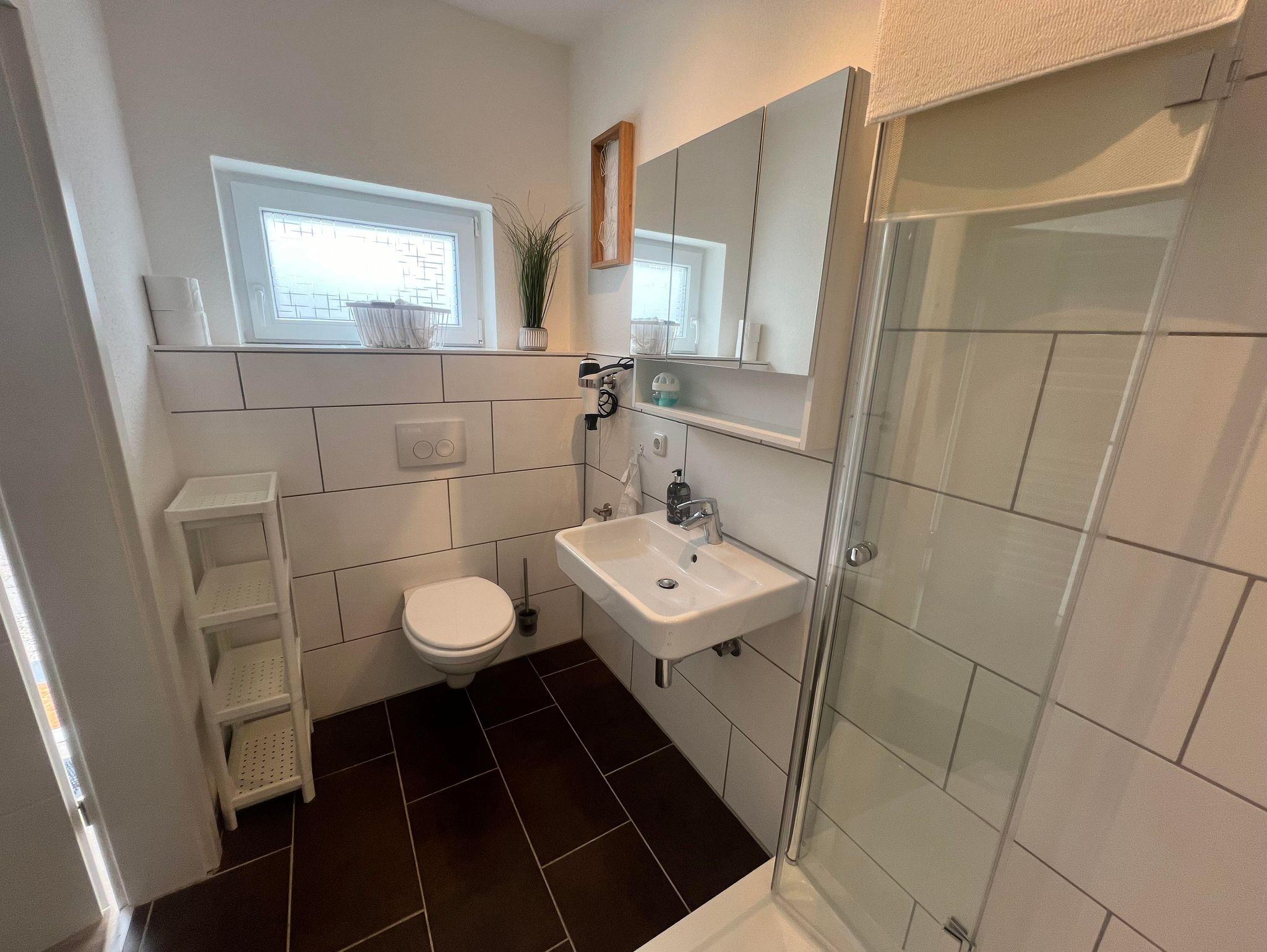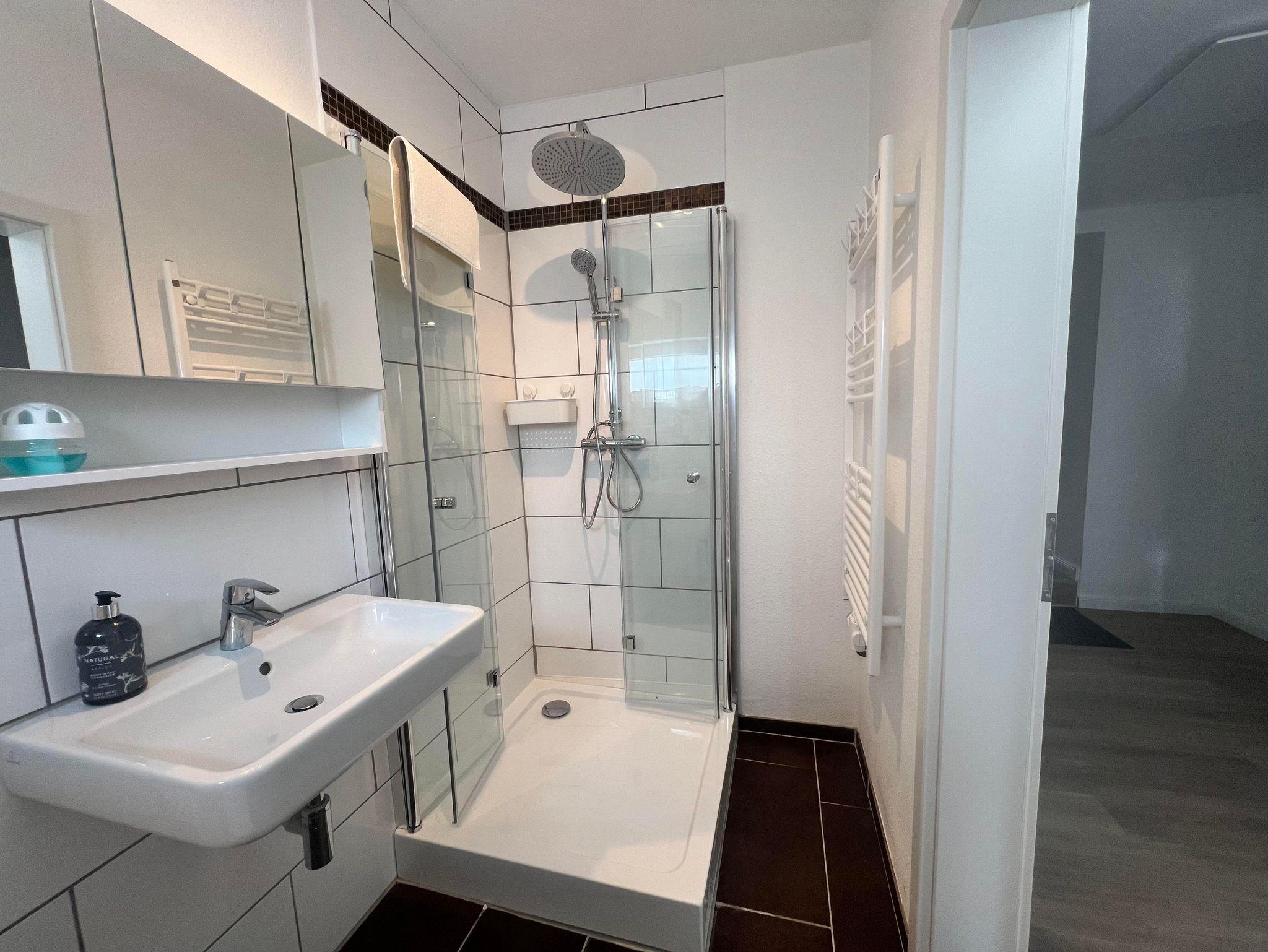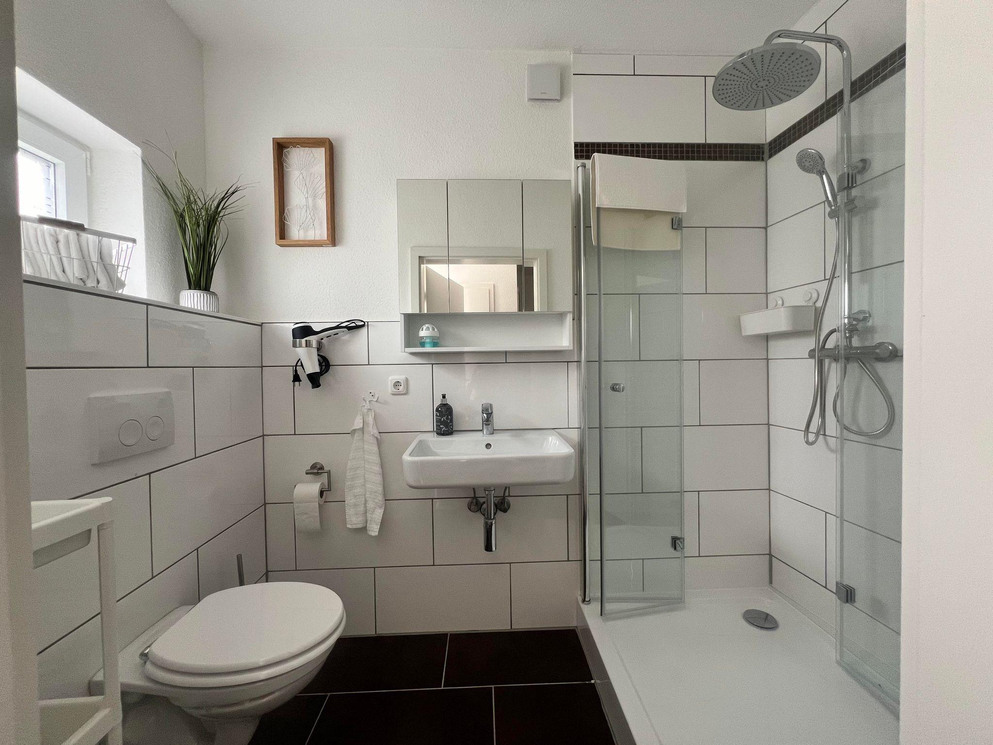 • 1 Badezimmer mit geräumiger Dusche und WC