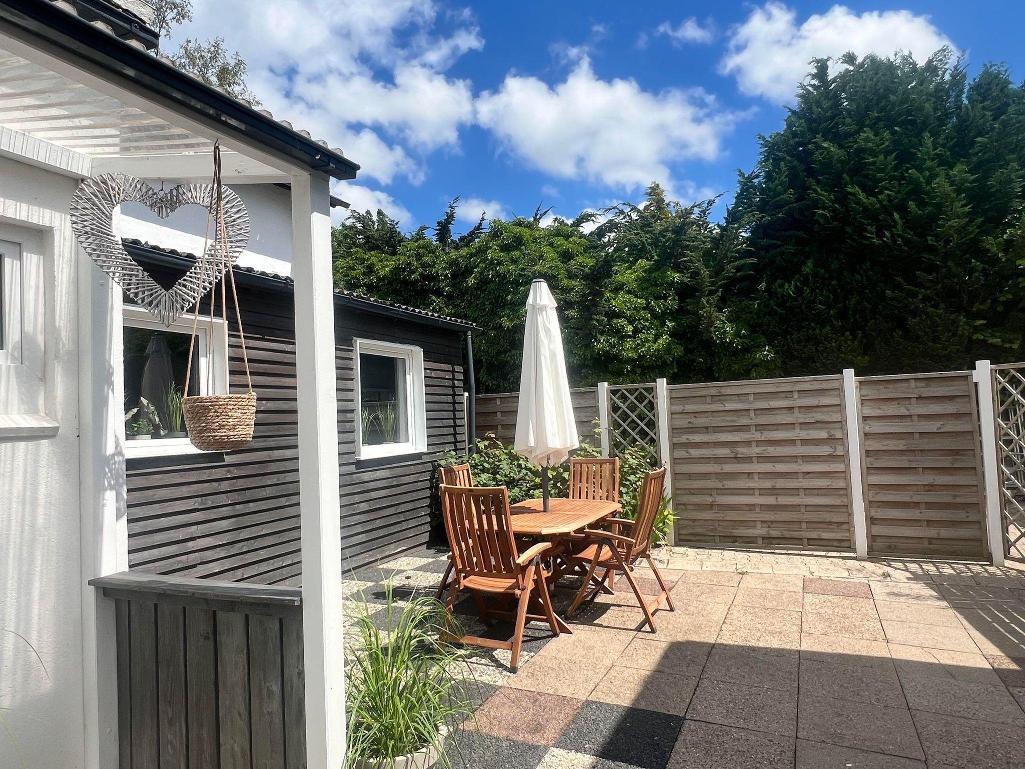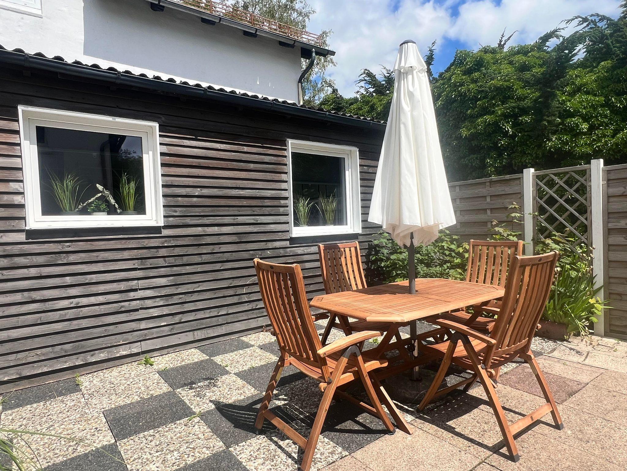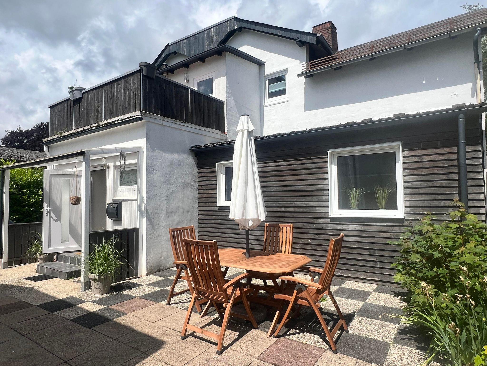 Ein besonderes Highlight ist die kleine Terrasse hinter dem Haus. Sie ist ruhig zwischen Vorder- und Hinterhaus gelegen und bietet mit einem Esstisch und sechs Stühlen, einem Strandkorb, sowie einem Grill ideale Möglichkeiten für entspannte Stunden im Freien. Bitte beachten Sie, dass die Terrasse teilweise vom Hinterhaus aus einsehbar ist.