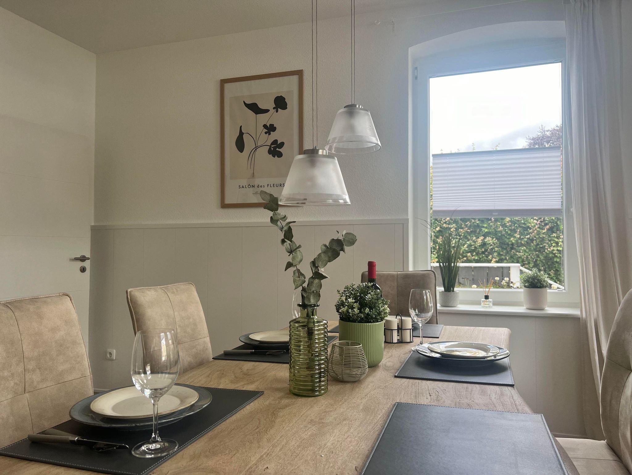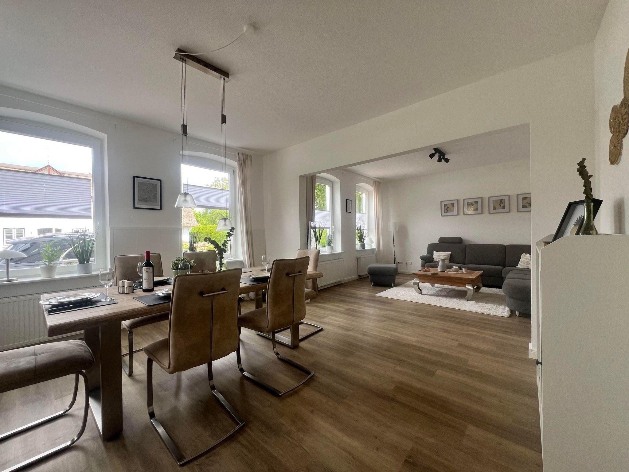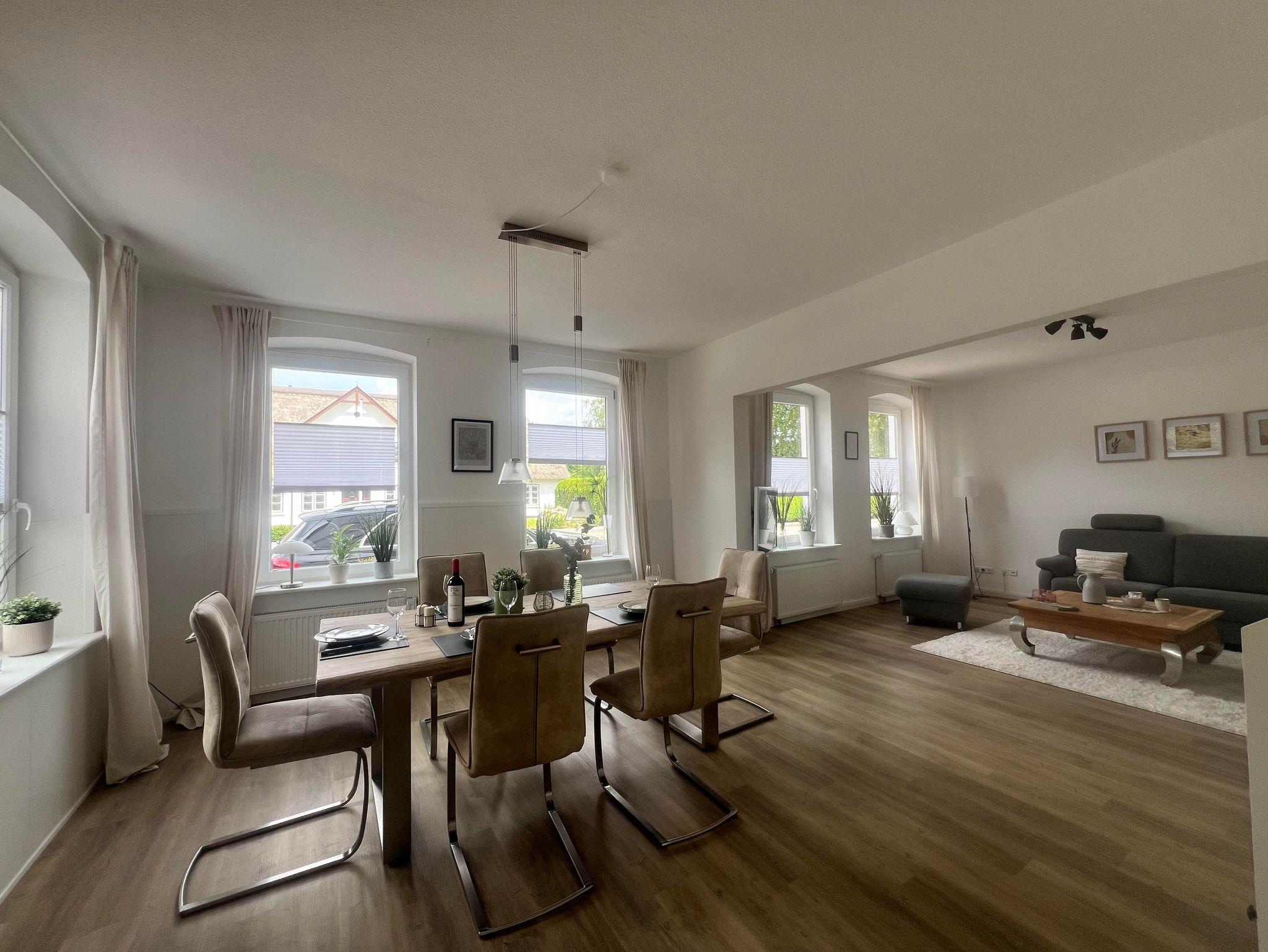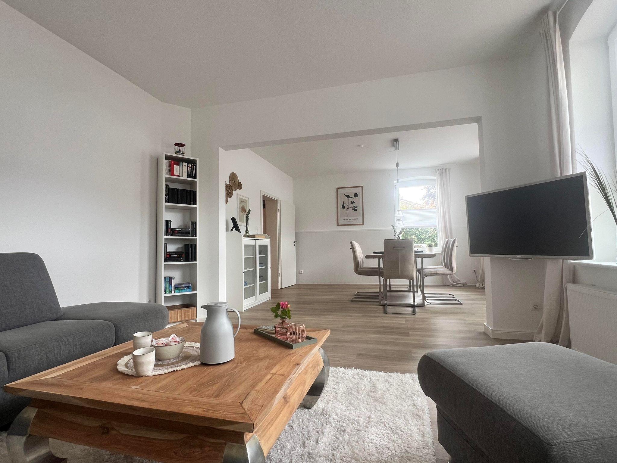 Das helle Wohnzimmer lädt mit einer großen, gemütlichen Sitzecke zum Verweilen ein. Der hochwertige Esstisch bietet ausreichend Platz für gemeinsame Mahlzeiten oder gesellige Abende, auch hier finden Sie einen Smart-TV.