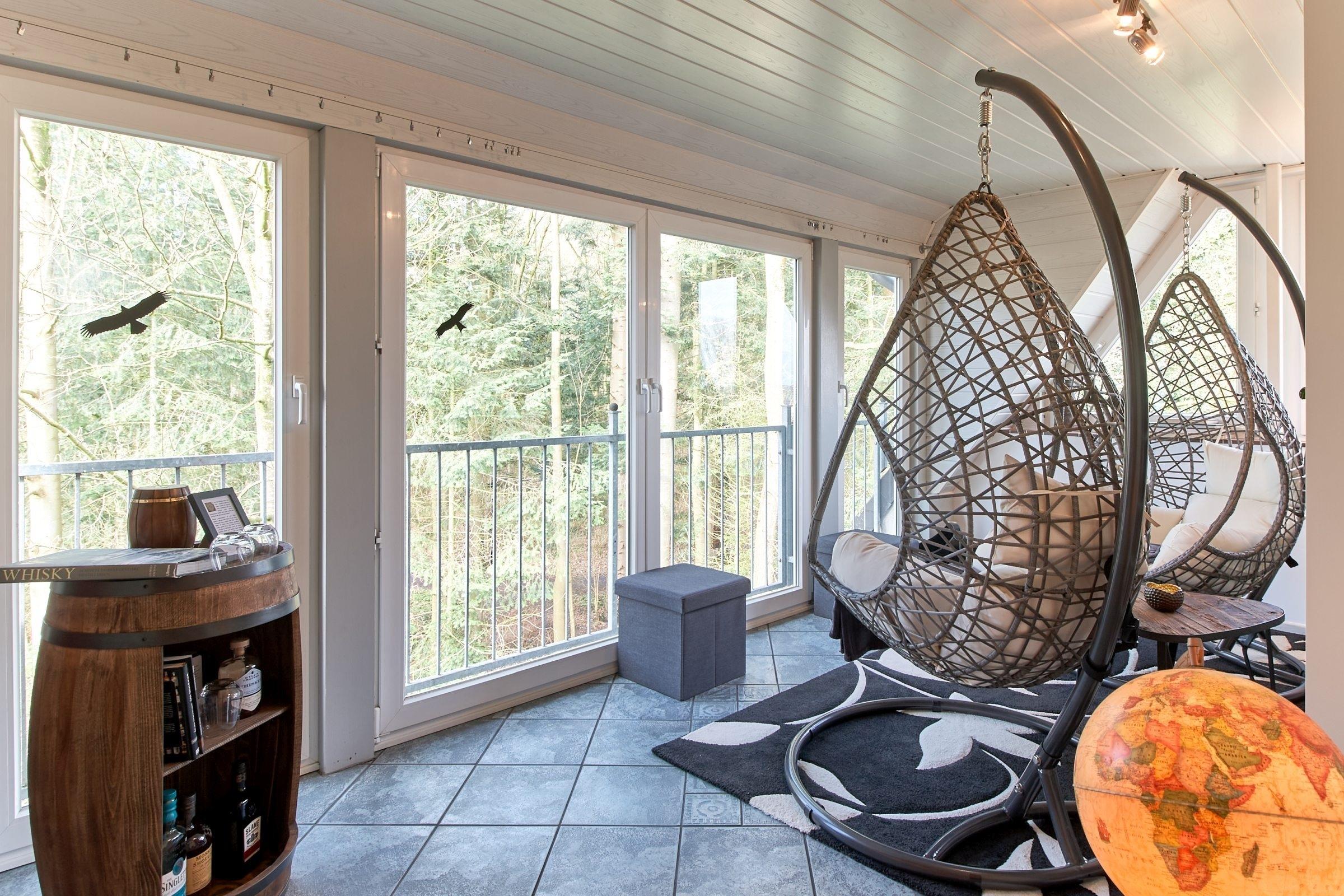 Panoramafenster und Blick in den Wald ist der perfekte Ort für stille Momente, ein gutes Buch und neue Gedanken.