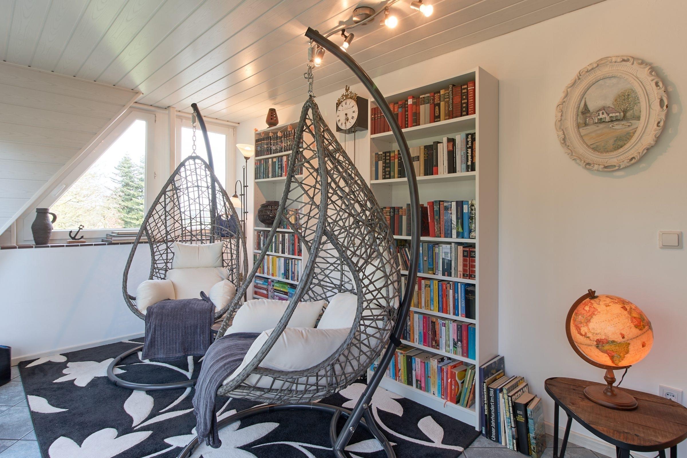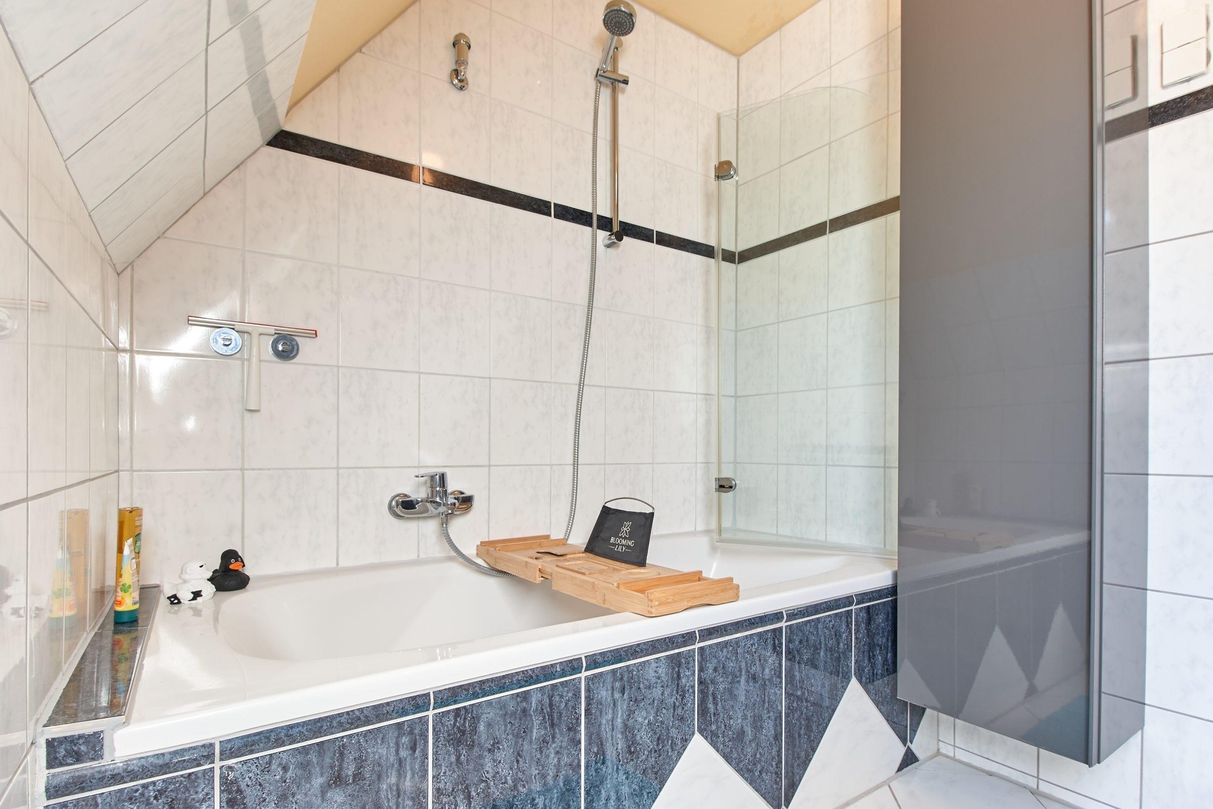 ein begehbarer Kleiderschrank sowie ein modernes Vollbad mit Badewanne und Dusche. Das Lesezimmer mit