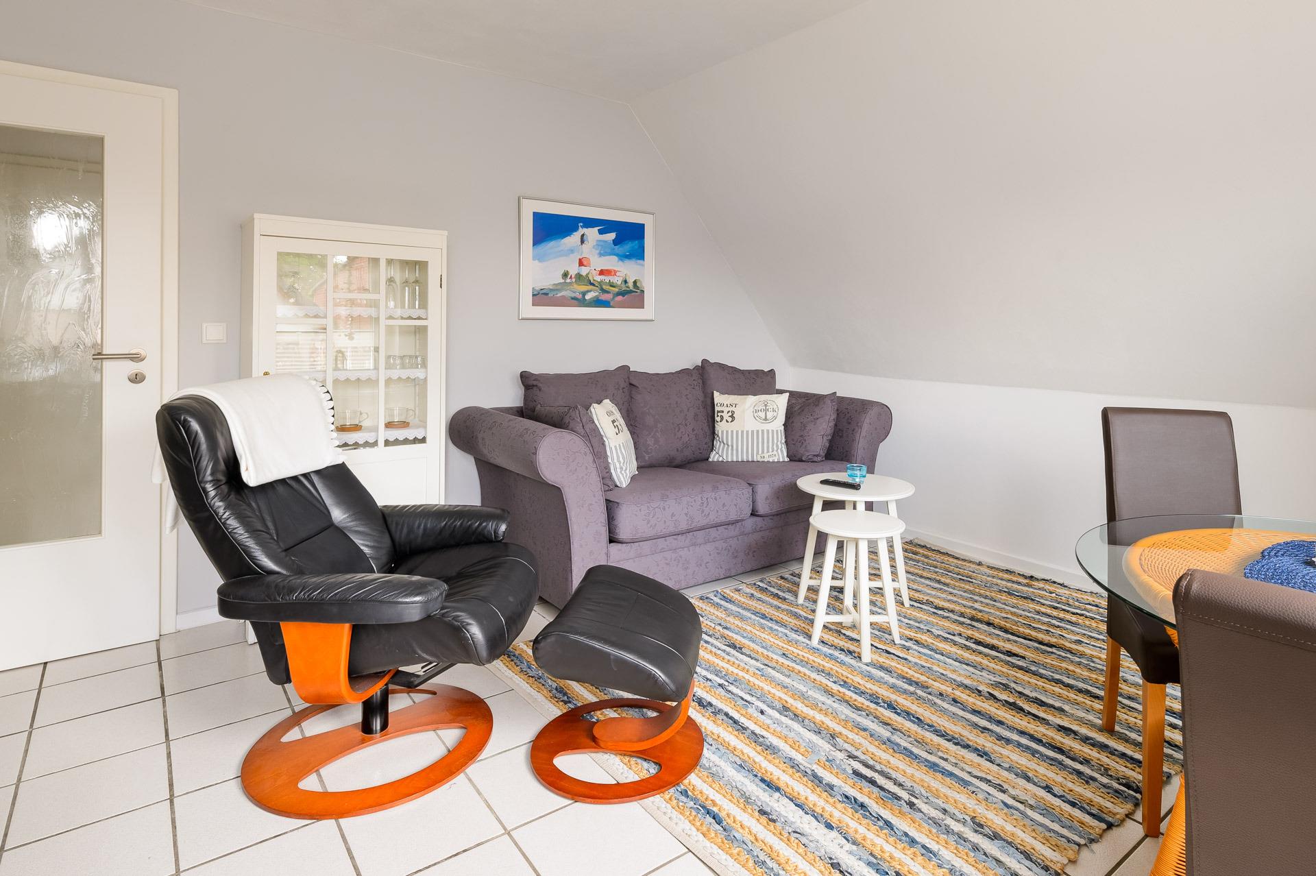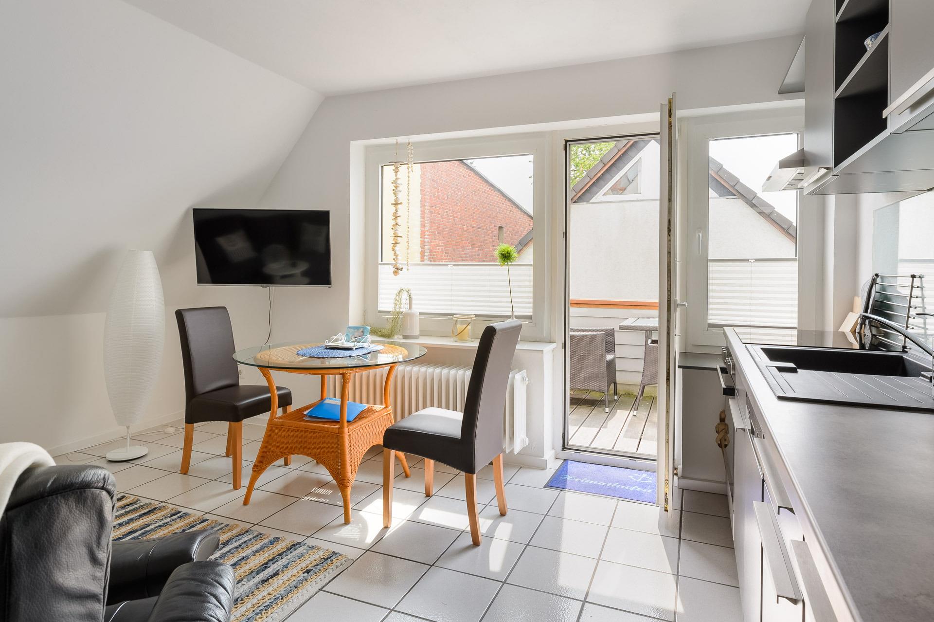 Ankommen, durchatmen, wohlfühlen: Das gemütlich eingerichtete Ferienapartment bietet den idealen Rückzugsort für 1 bis 2 Personen. Neben dem Schlafzimmer mit Doppelbett im Obergeschoss steht ein gemütlicher Wohnbereich mit SAT-TV sowie eine voll ausgestattete Einbauküche samt Geschirrspüler zur Verfügung. Der Balkon rundet das Angebot ab. Ein überdachter Fahrradstellplatz sowie ein Parkplatz direkt am Haus sorgen für entspannte Urlaubstage ohne Parkplatzsuche. Bettwäsche, Handtücher, Endreinigung und viele nützliche Kleinigkeiten für Küche und Bad sind bereits im Preis enthalten. Auf Wunsch können Sie Ihr Frühstück ganz bequem im benachbarten Nordsee-Hotel Hinrichsen genießen (nur durch den Hotelparkplatz getrennt). Nach nur ca. 300 Metern zu Fuß erreichen Sie den charmanten Husumer Innenstadtbereich mit Cafés, kleinen Boutiquen, dem malerischen Hafen und dem Husumer Schloss.