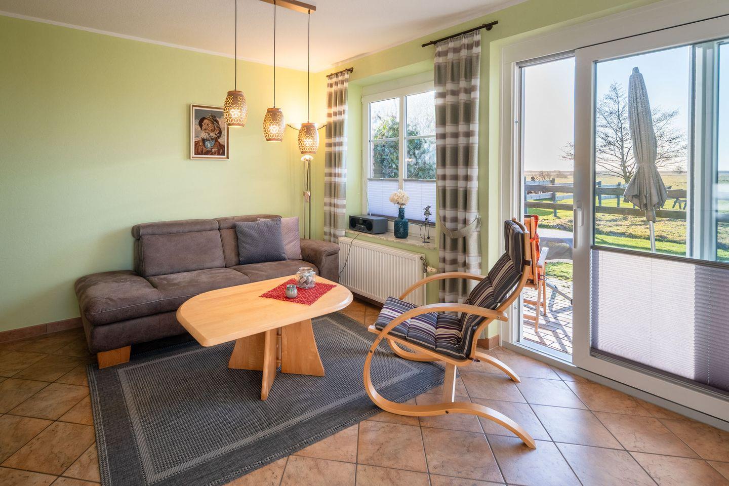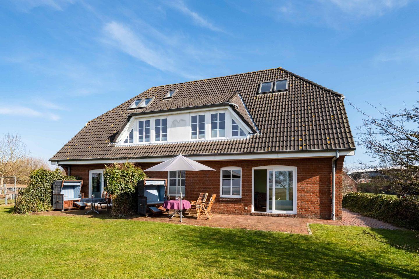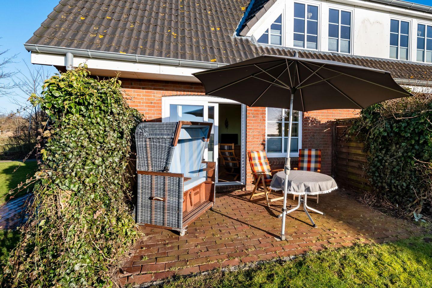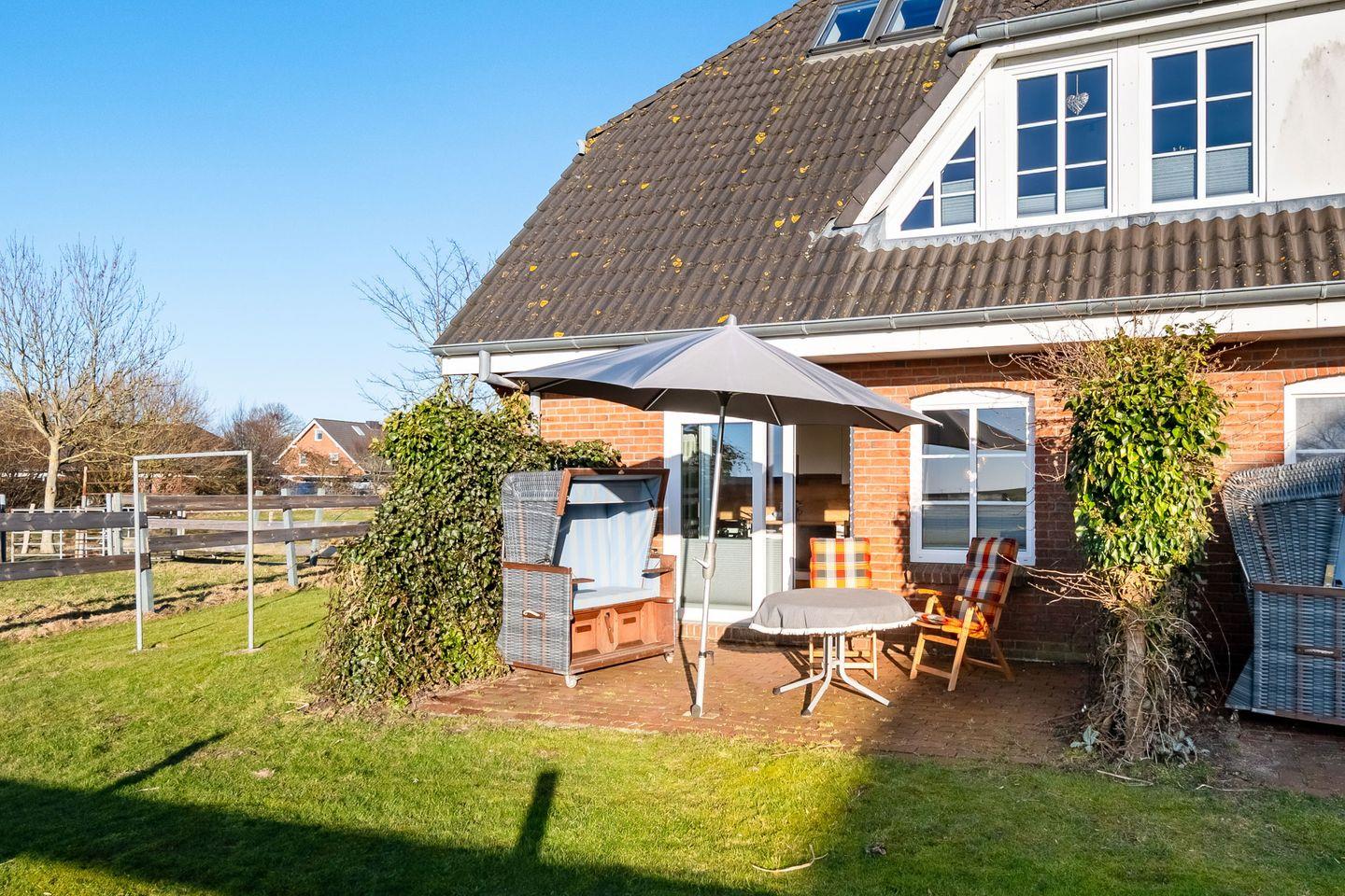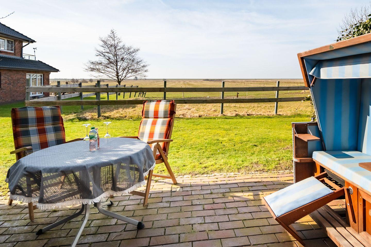 Auf der geschützten Terrasse können Sie im Strandkorb oder auf den Gartenmöbeln den Tag mit großartigem Ausblick über die Felder bis zum Deich den Tag ausklingen lassen.